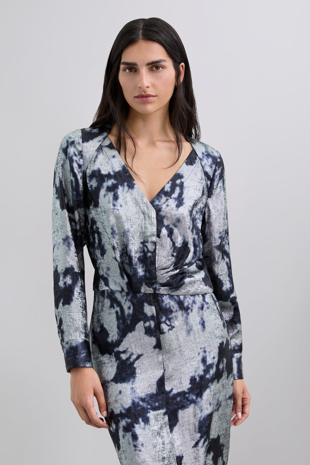 Flowing fabric blouse with tie-dye print and metallic details. Slim fit. V-neck. Long sleeves. Slightly cropped.