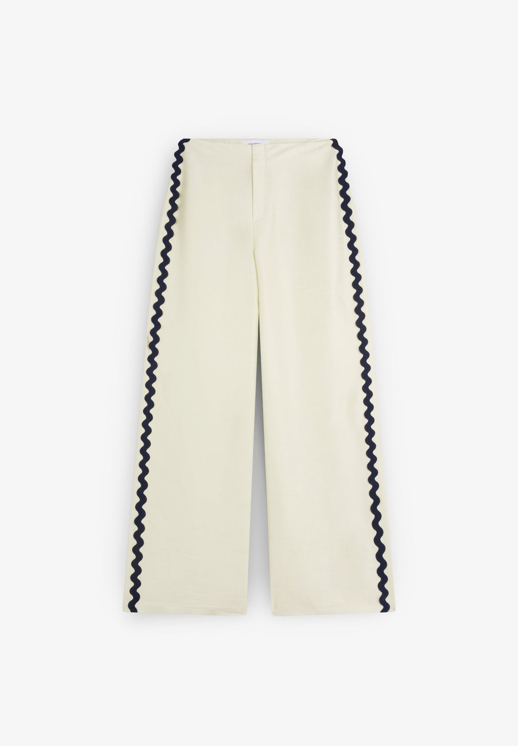 Slightly satiny full length, high waist trousers. Contrast scalloped motif. Patch pockets at the back Front hook and zip fastening.