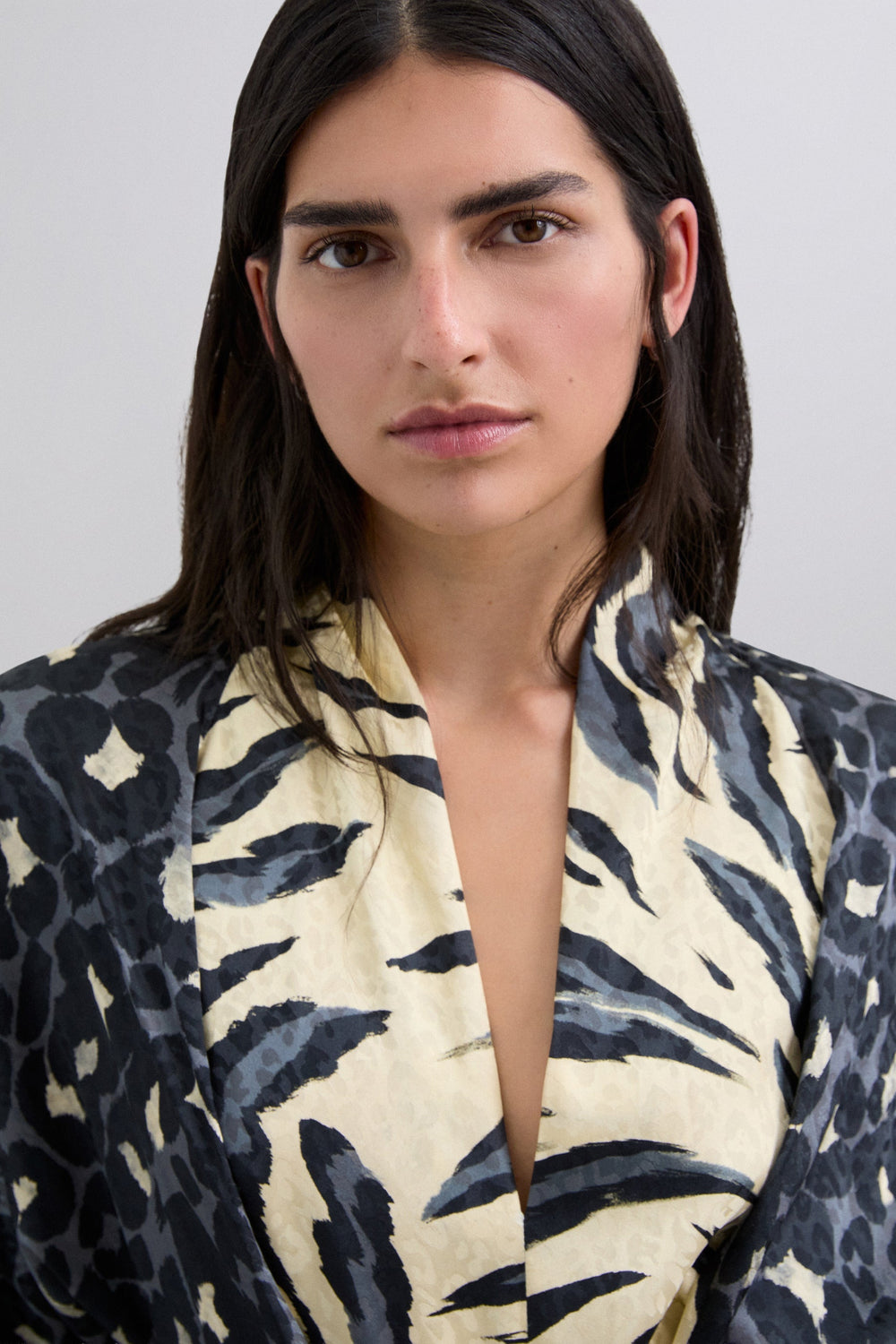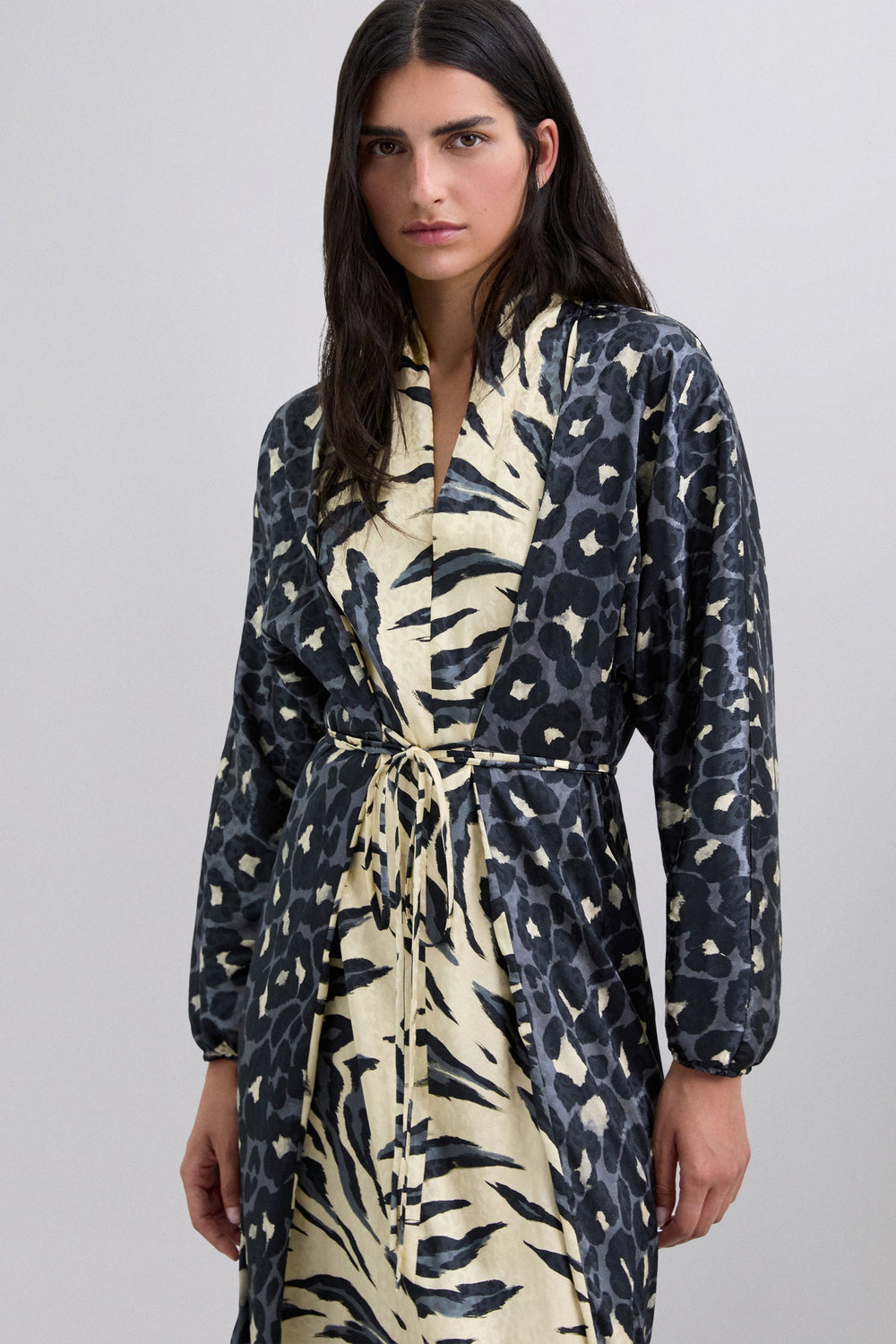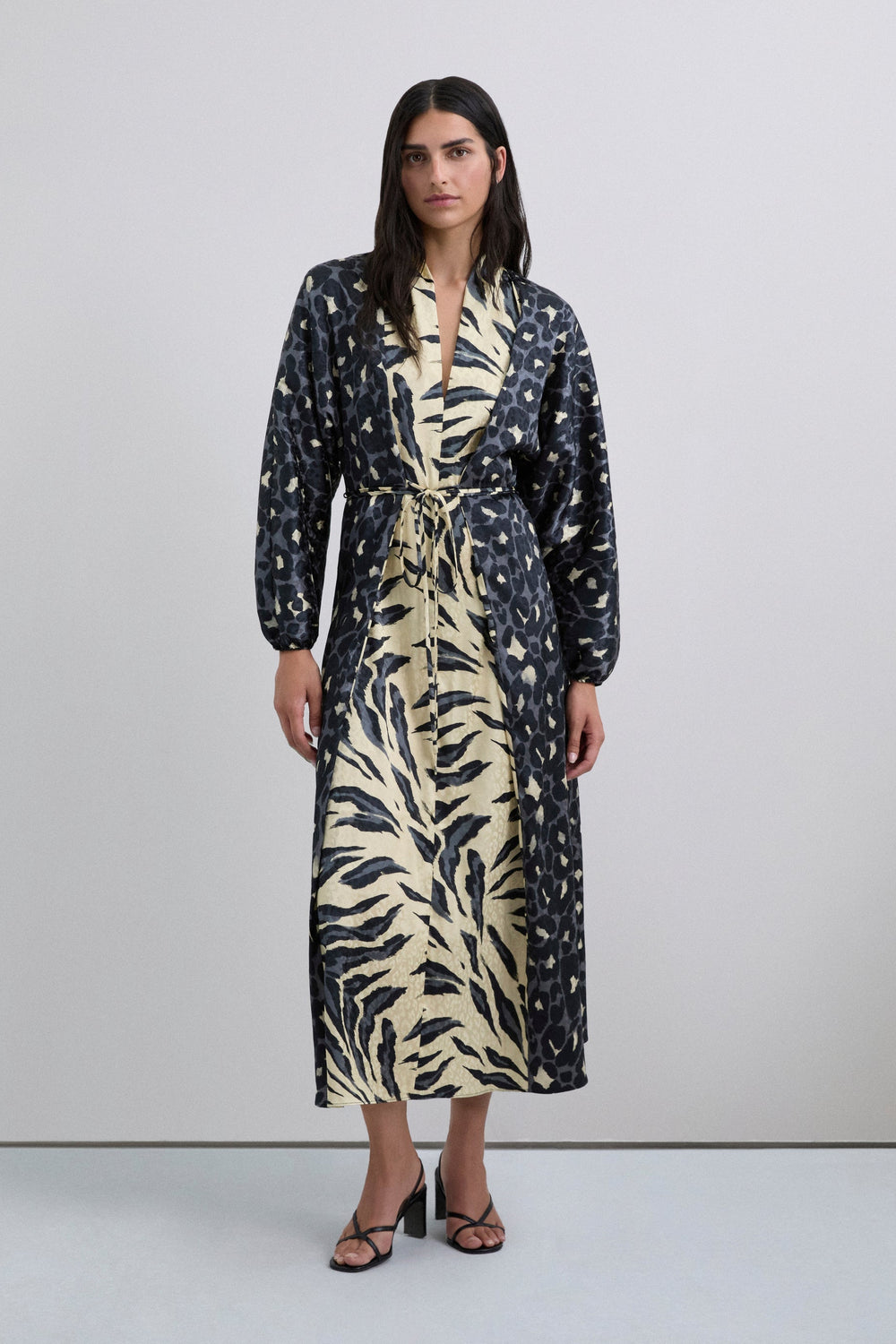 Long dress with animal print. Long, slightly puffed sleeves with gathered cuffs. Adjustable tie front. V-neck.