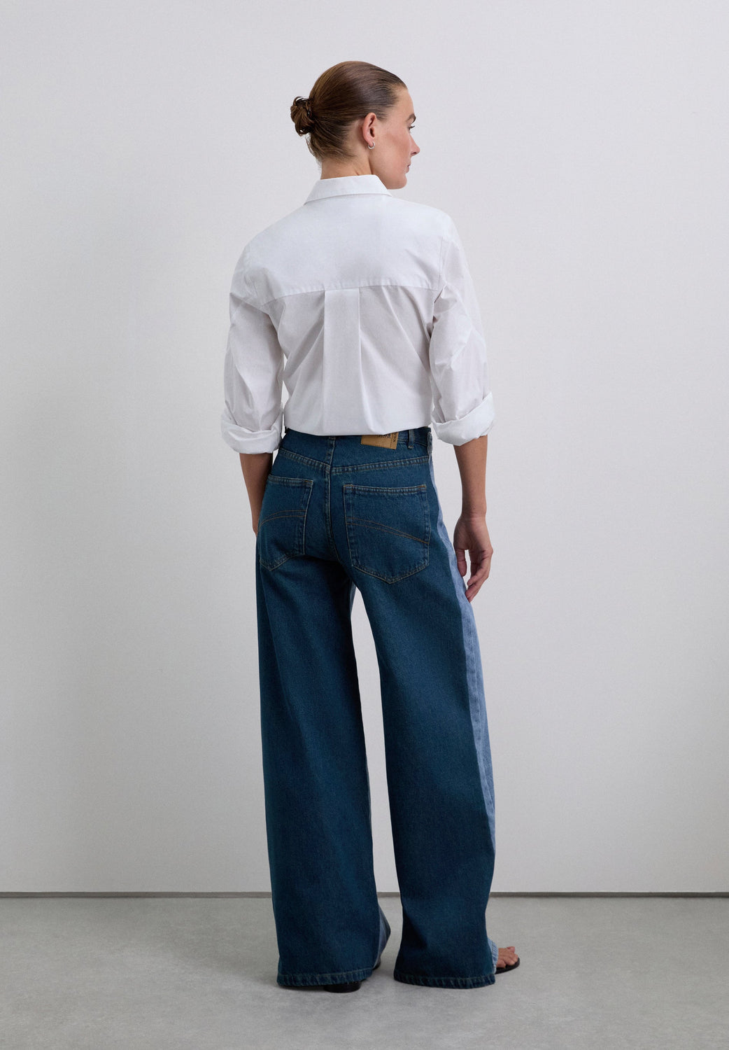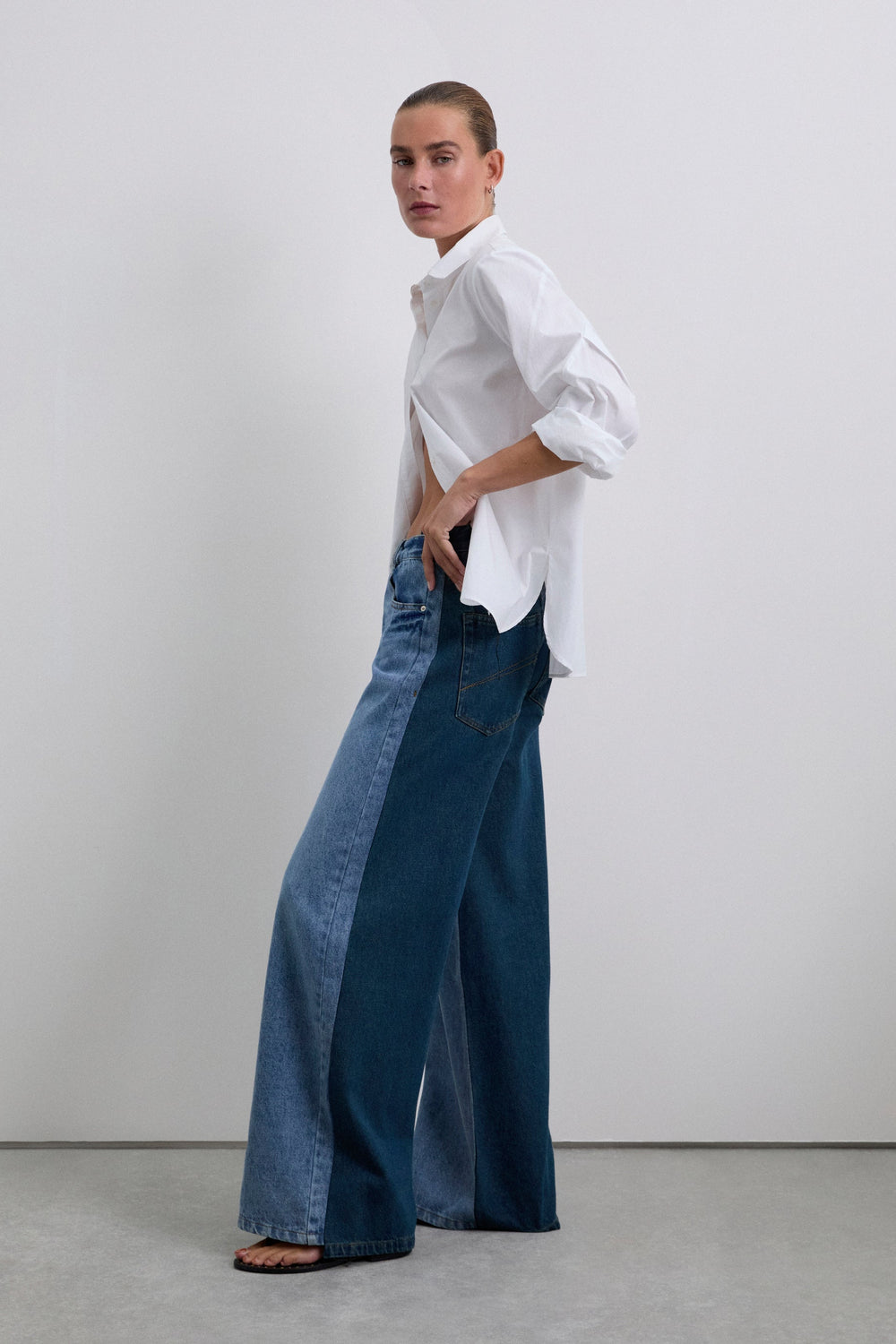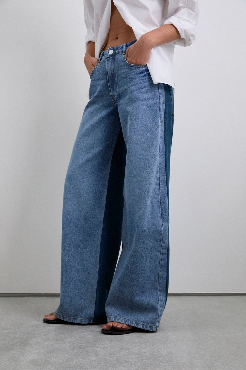 Pantalón denim confeccionado en algodón 100%. corte regular fit, bicolor, cierre con cremallera y botón, trabillas en cintura, cinco bolsillos.