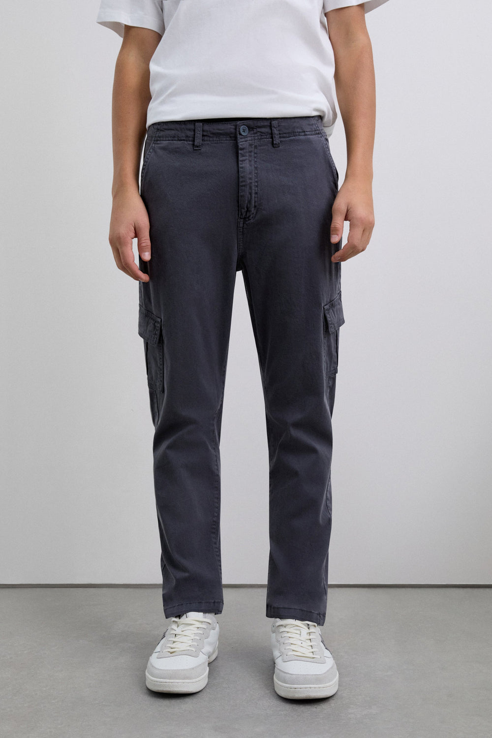 Cargo trousers made of slightly stretch BCI cotton. Regular fit, top button and zip fastening and side pockets. Belt loops at the waist and flap pockets on the leg.
