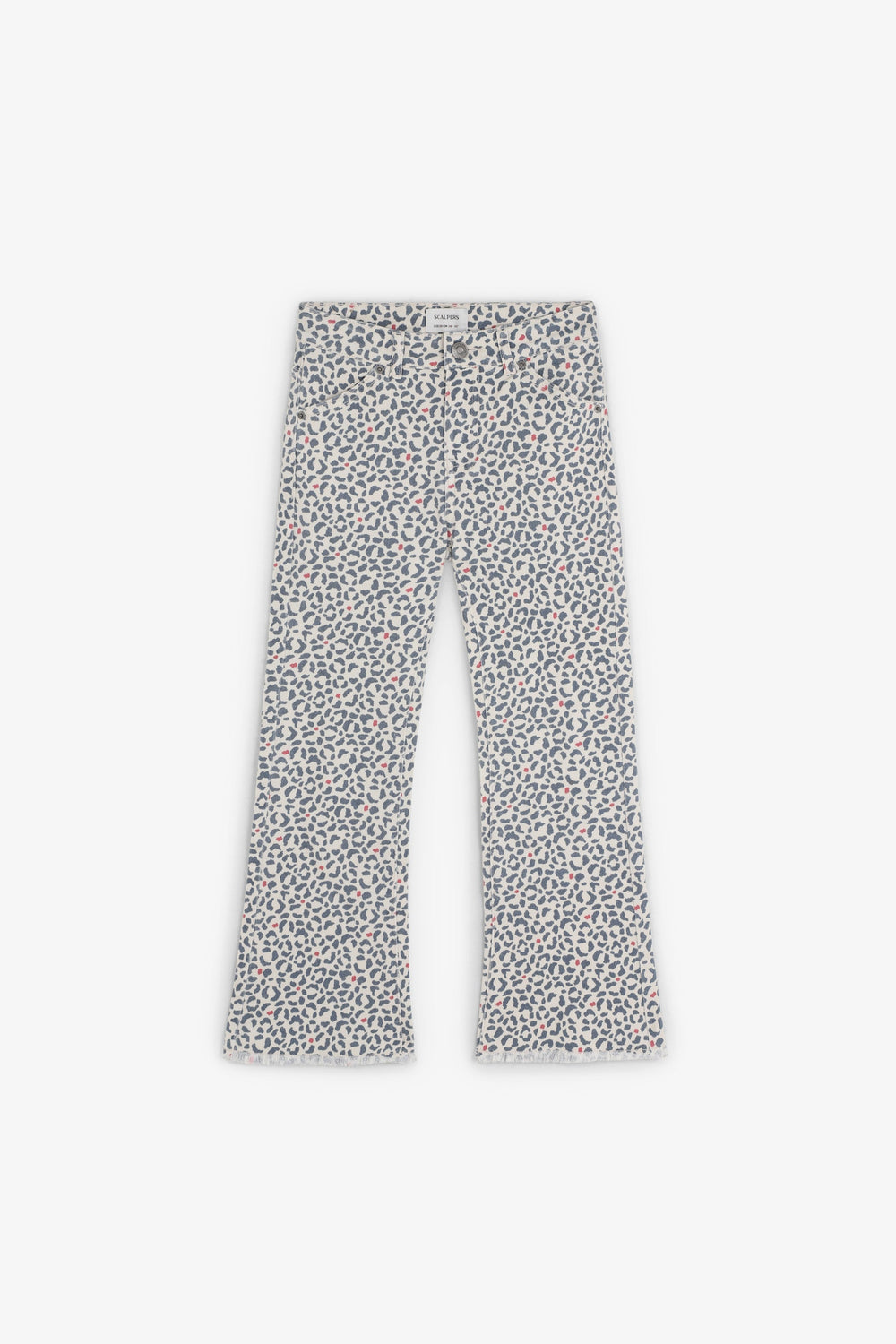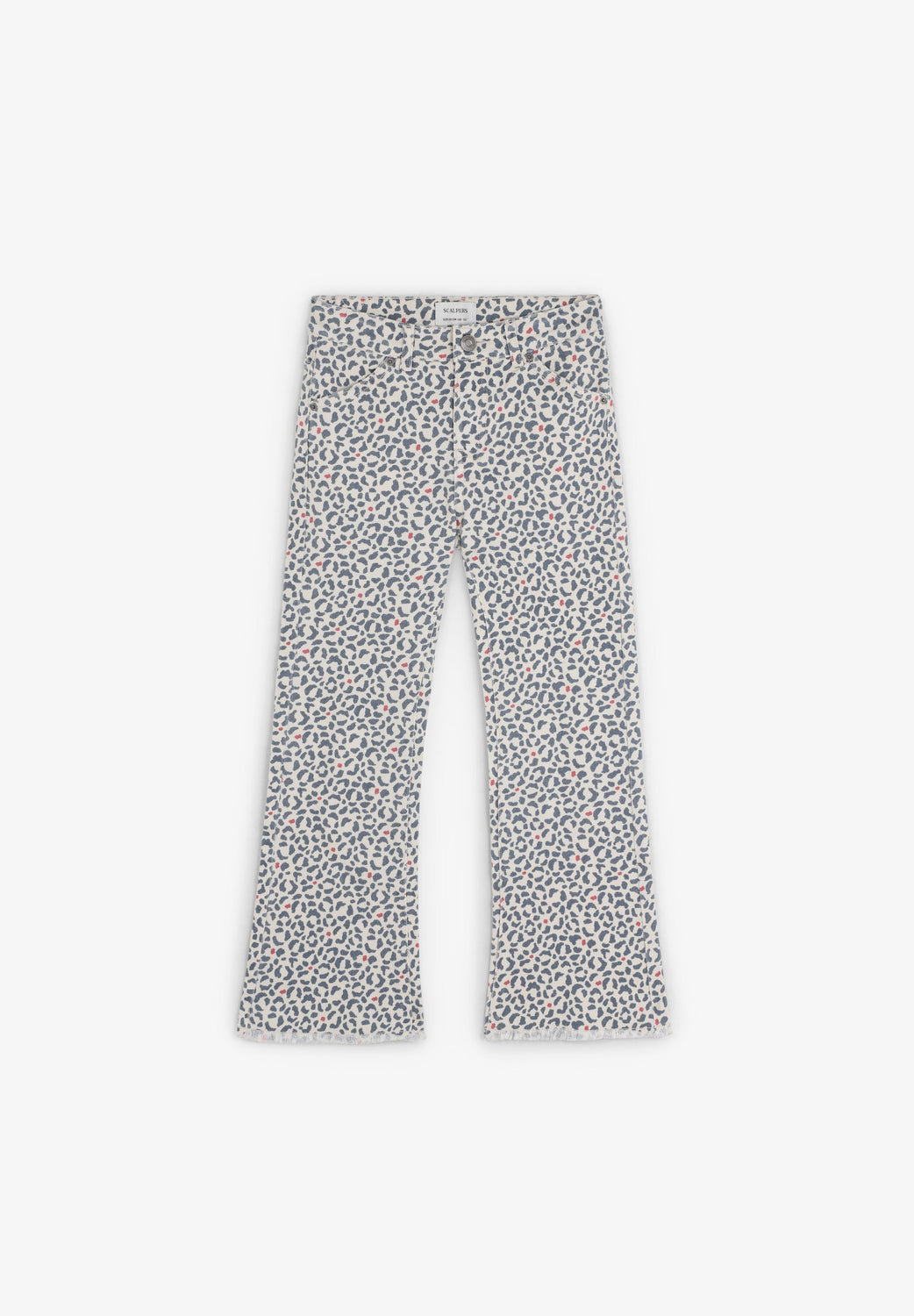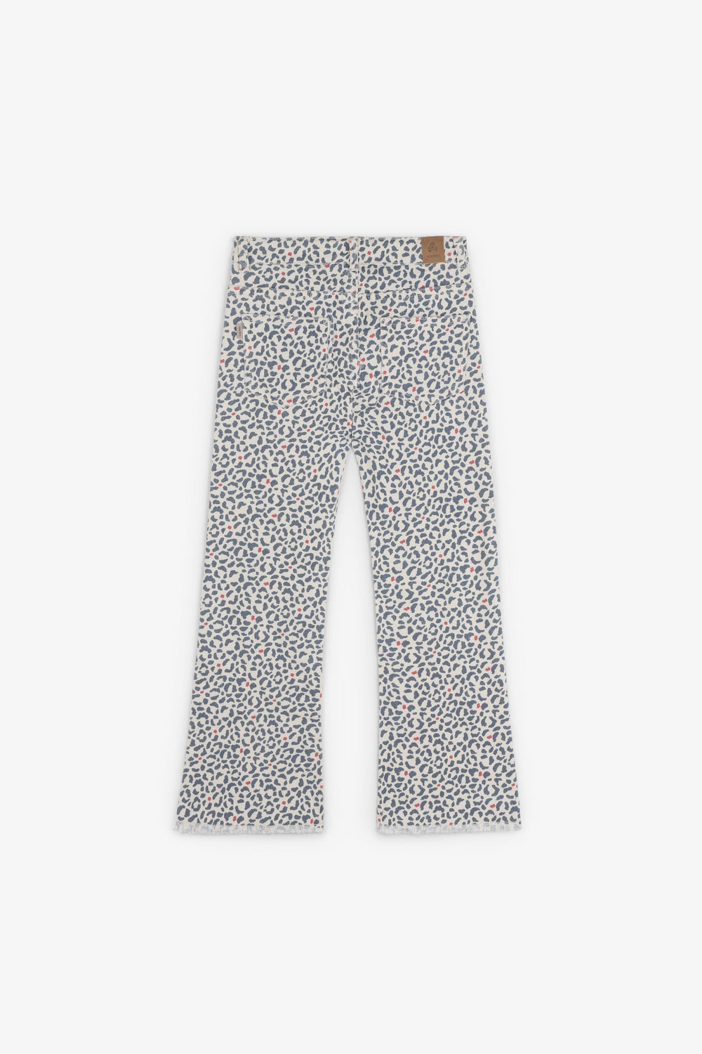 Denim jeans. Two front pockets. Two back pockets with skull and logo label detail. Frayed motif on the hems. Belt loops at the waist. Button and zip fastening. Animal print.