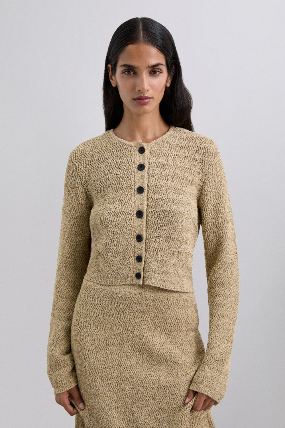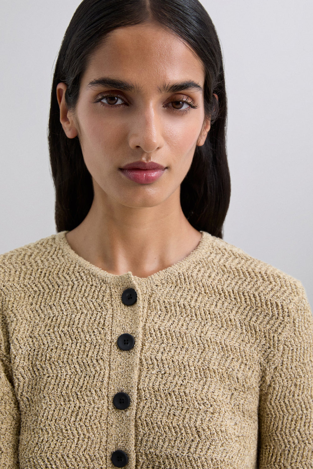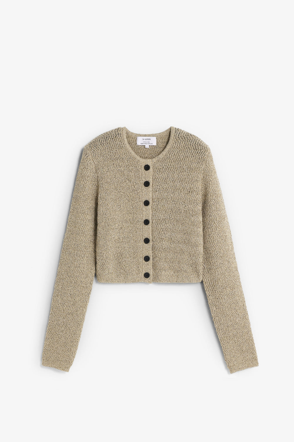 Knit cardigan. Round neck. Long sleeves. Contrast front button fastening.