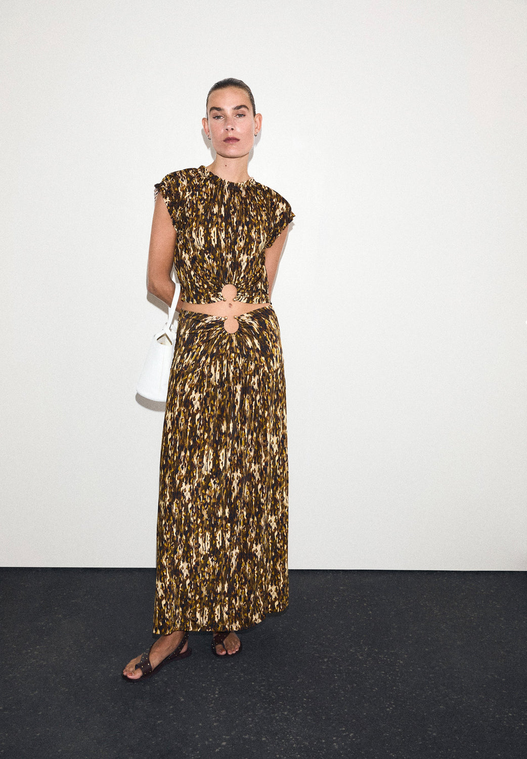 Printed skirt with metal buckle detail on the front. Midi. Flared.
