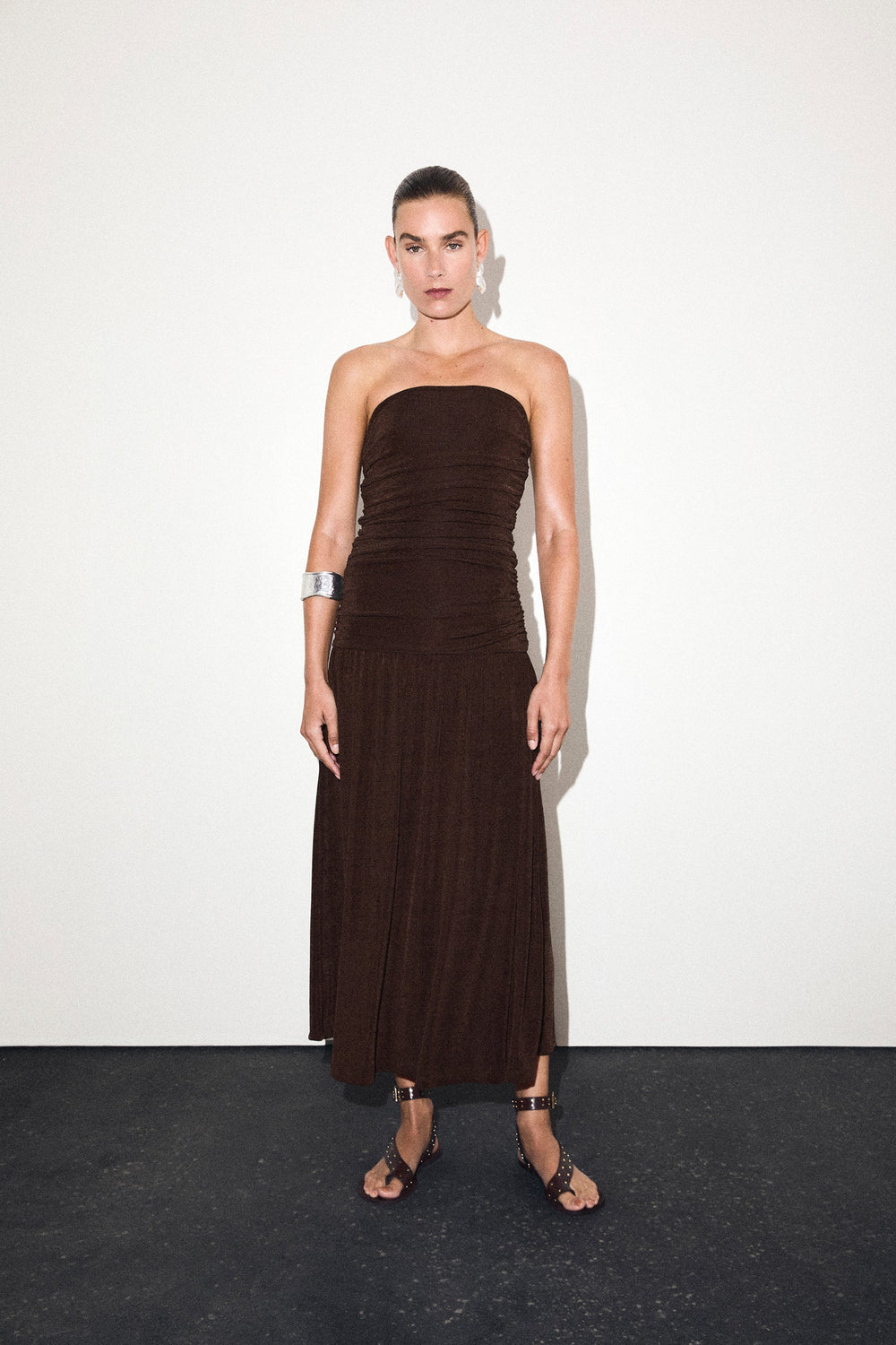 Dress made of slightly stretchy fine knit. Slim fit, strapless, gathered detail on body. Midi cut.