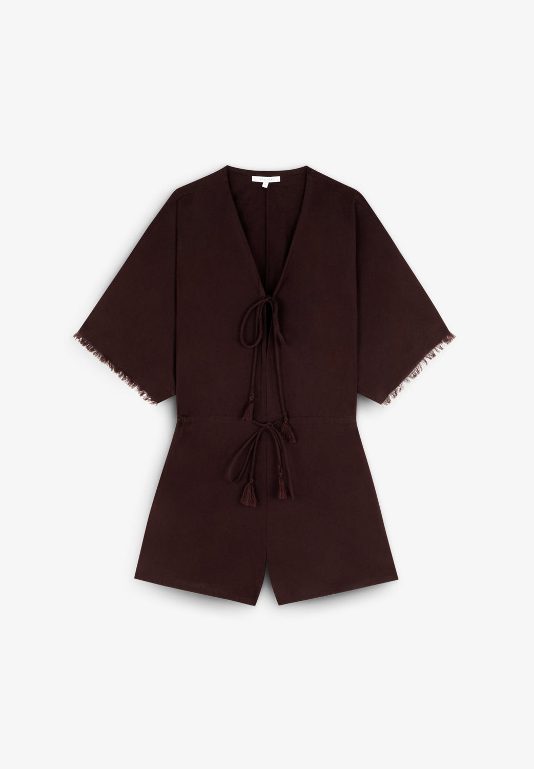 Playsuit made of a cotton and linen blend. Regular fit with shorts, V-neck and wide short sleeves. Elastic waistband. Adjustable front detail on chest and tie waist.