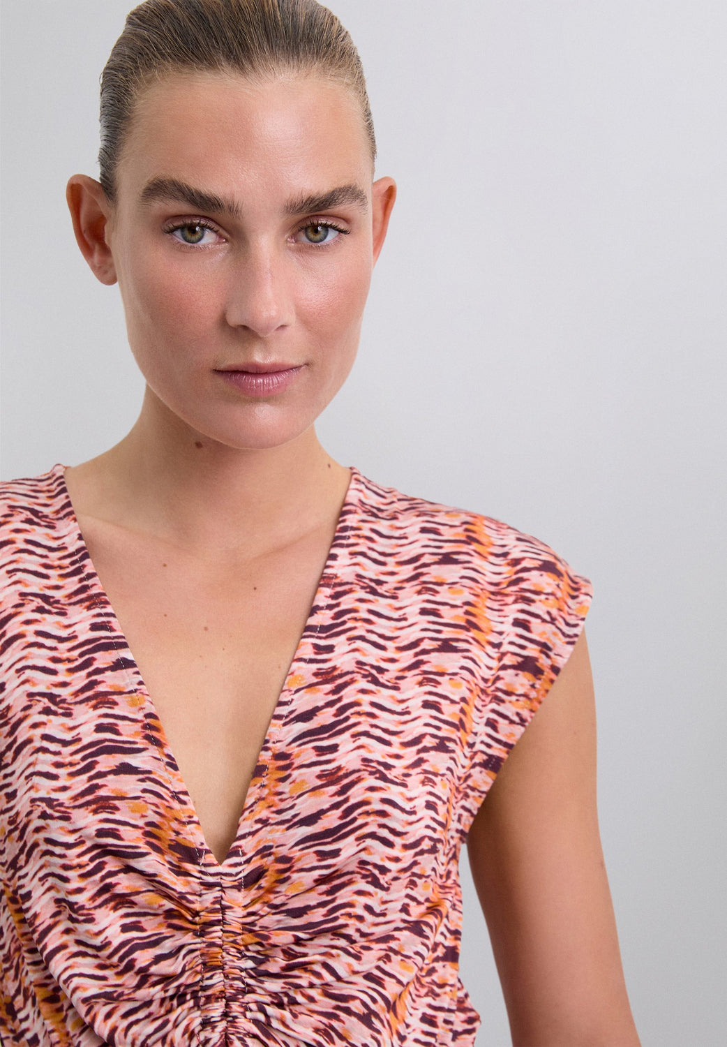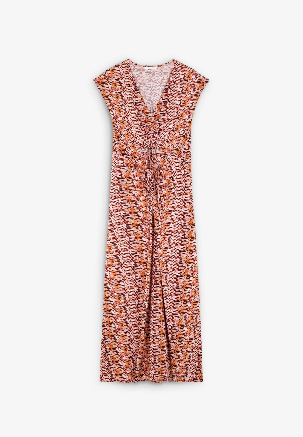 Dress made of slightly stretchy viscose with print. Slim fit, V-neck and short sleeves. Front cut-out detail with adjustable lacing on chest.