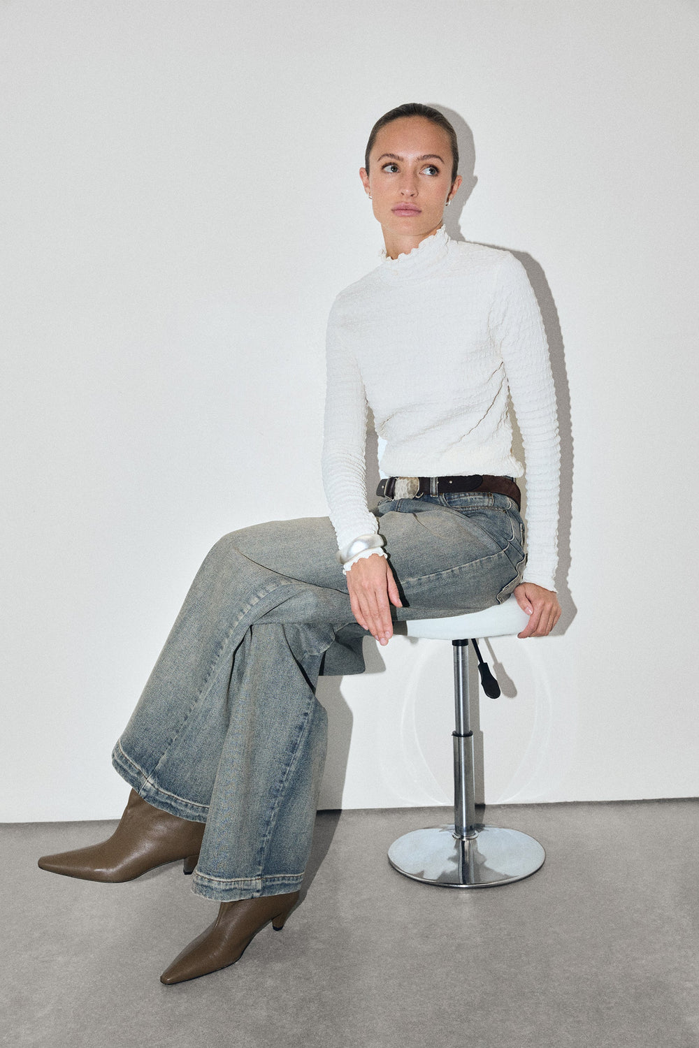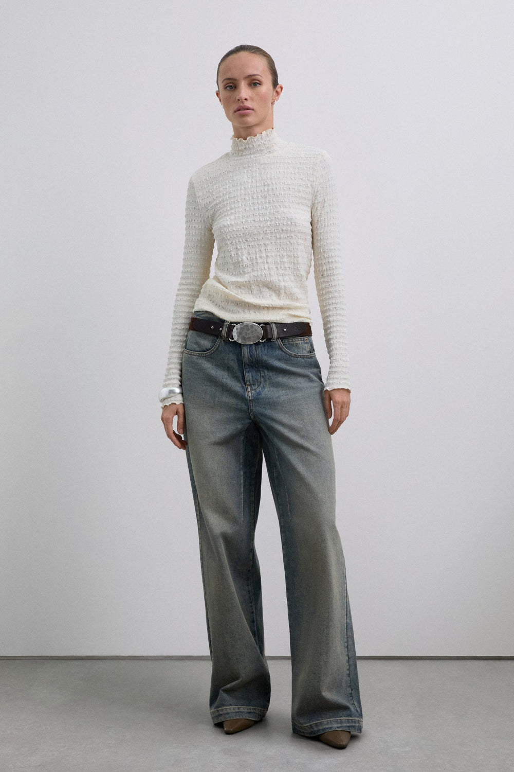 High neck top with long sleeves. Lightweight fabric with gathered texture.