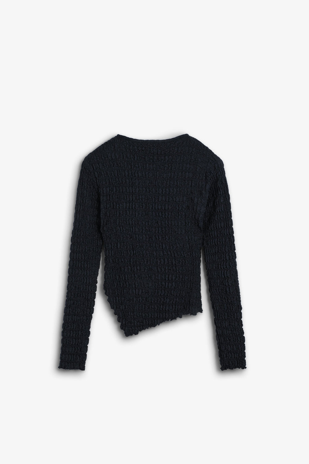 Round neck top with long sleeves. Lightweight fabric with gathered texture.