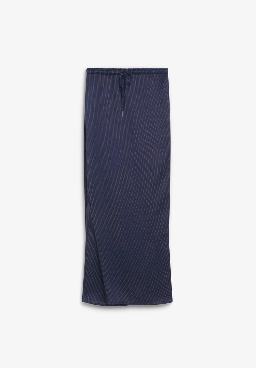 Long pinstripe skirt. Elastic waistband with adjustable drawstring Straight cut with side slit