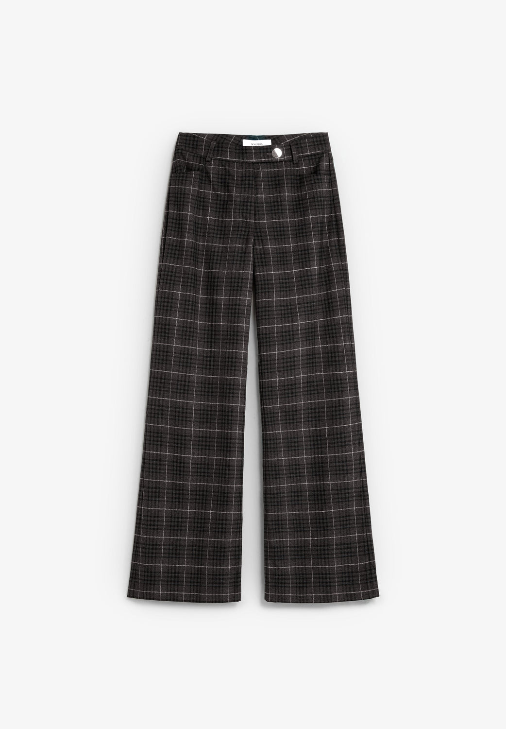 Straight jeans. Front zip and button fastening. Two flap pockets at the back. Belt loops at the waist. Check print.