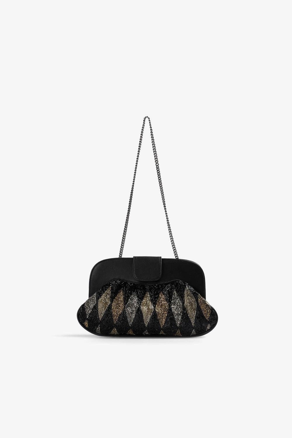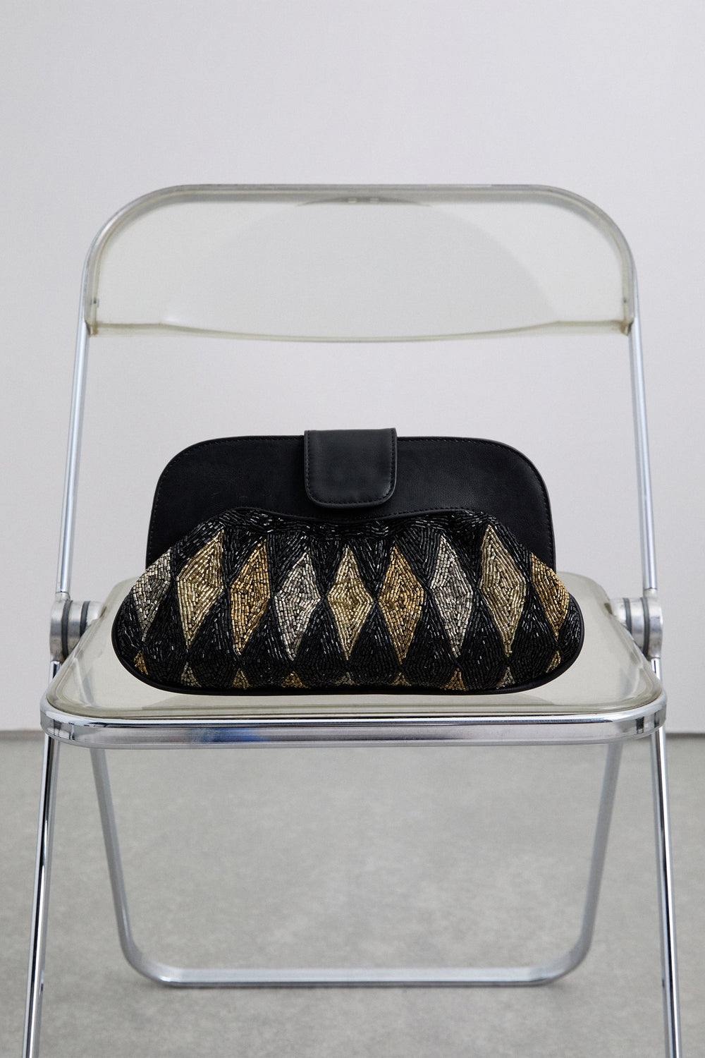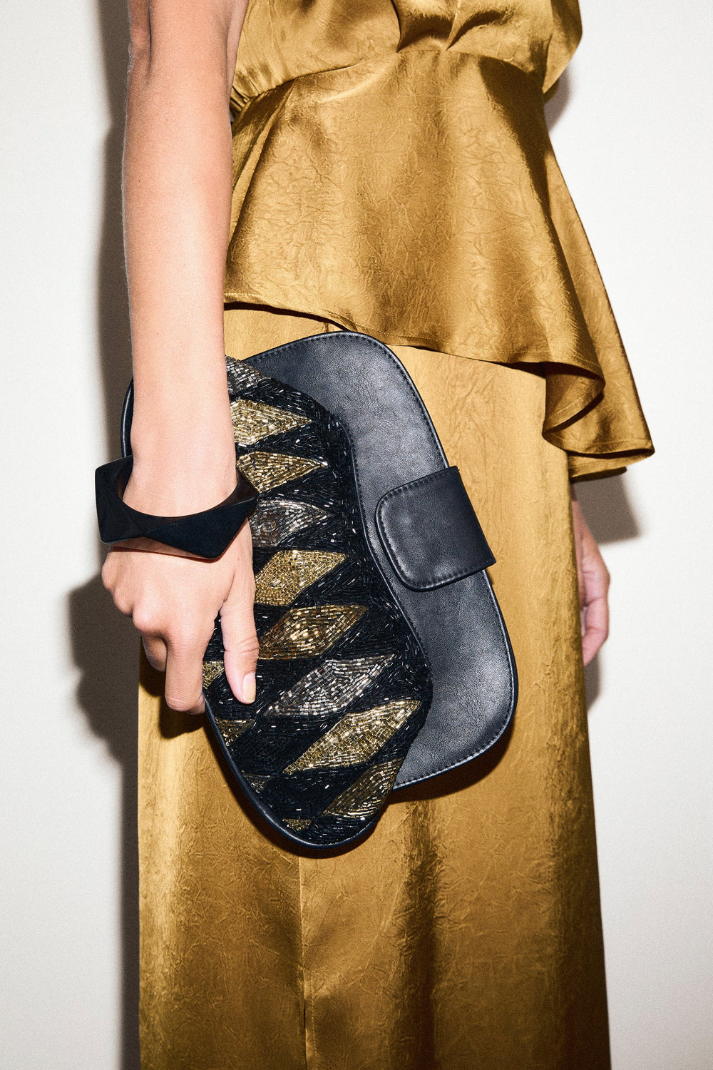 Handbag made of cotton. Beaded detail. Detachable metal crossbody strap. Magnetic closure. Embroidered logo detail on the inside.
