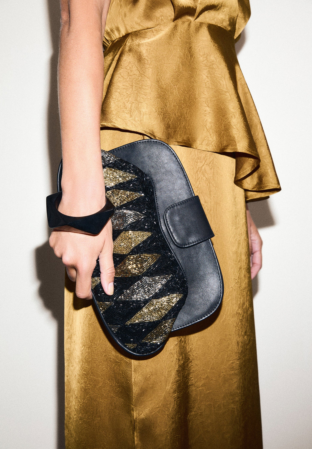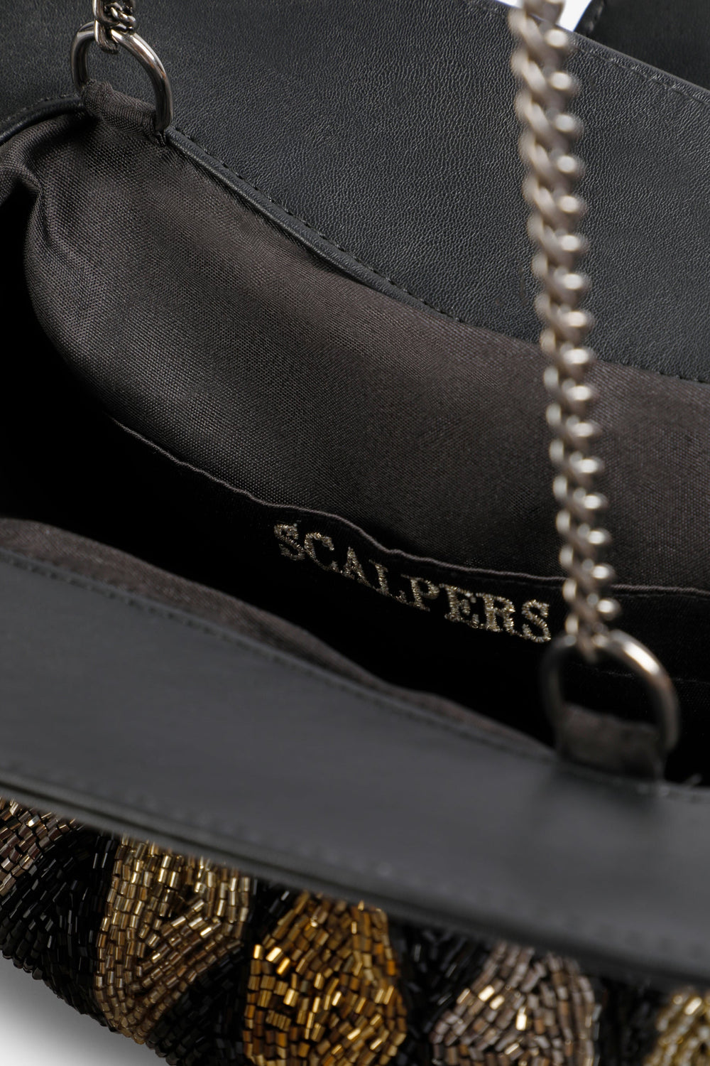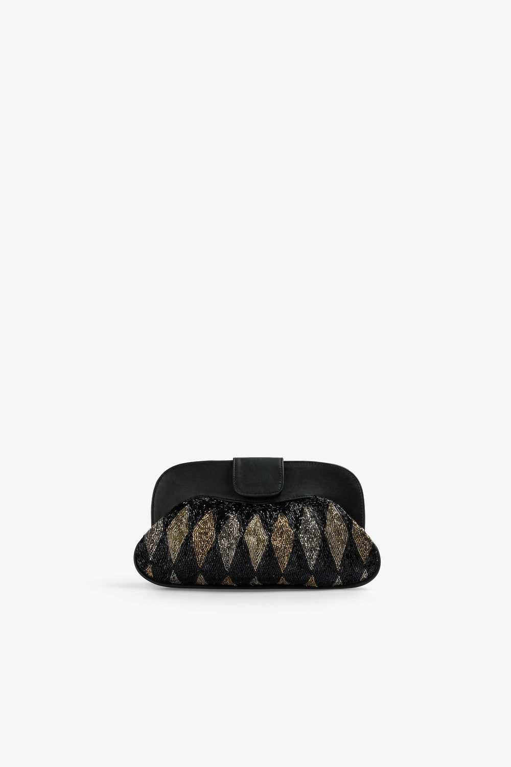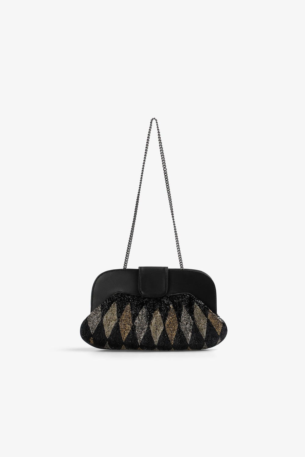 Handbag made of cotton. Beaded detail. Detachable metal crossbody strap. Magnetic closure. Embroidered logo detail on the inside.