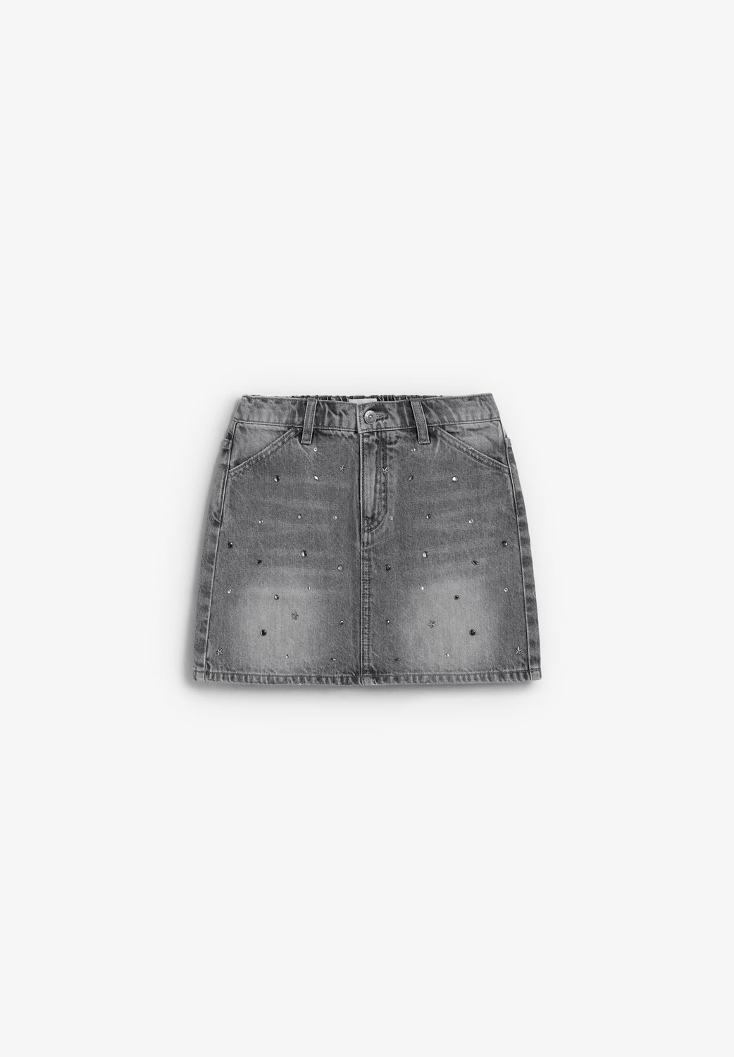 Denim mini skirt made of 100% BCI cotton. Stud detail. Button and zip fastening. Belt loops at the waist. Two front pockets and back pockets.