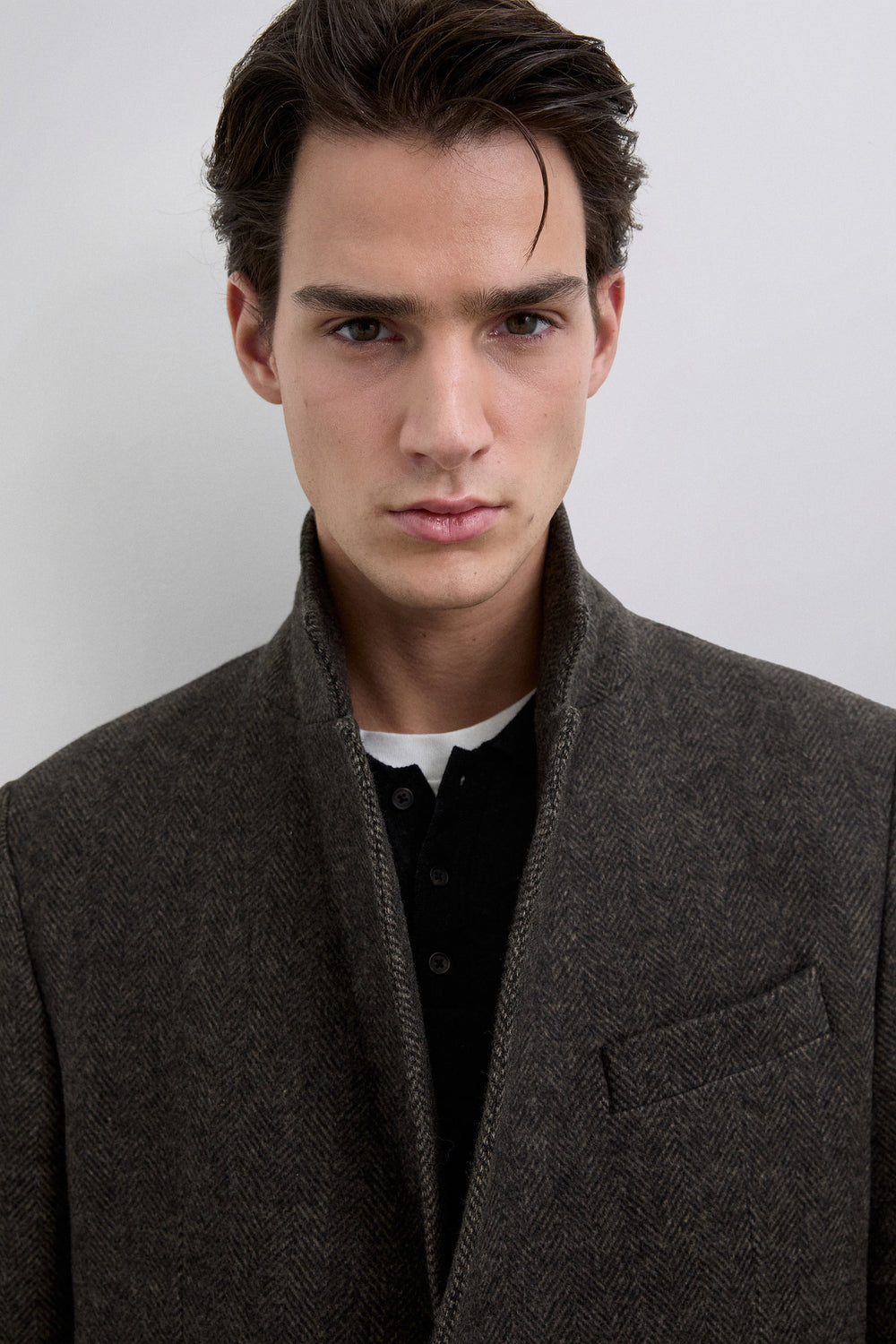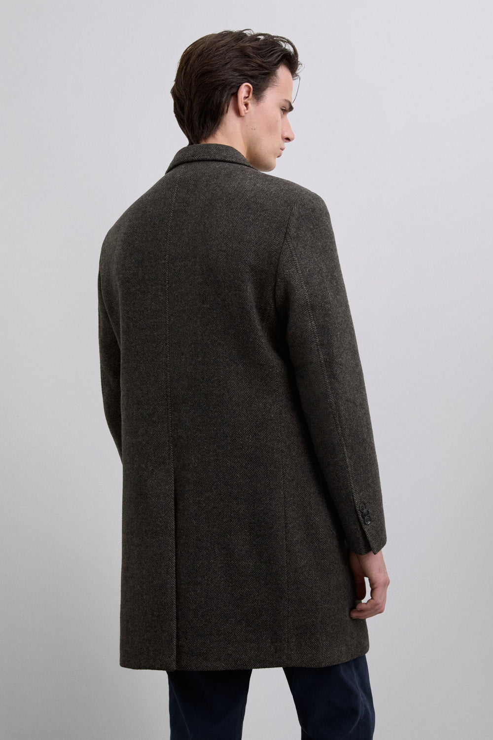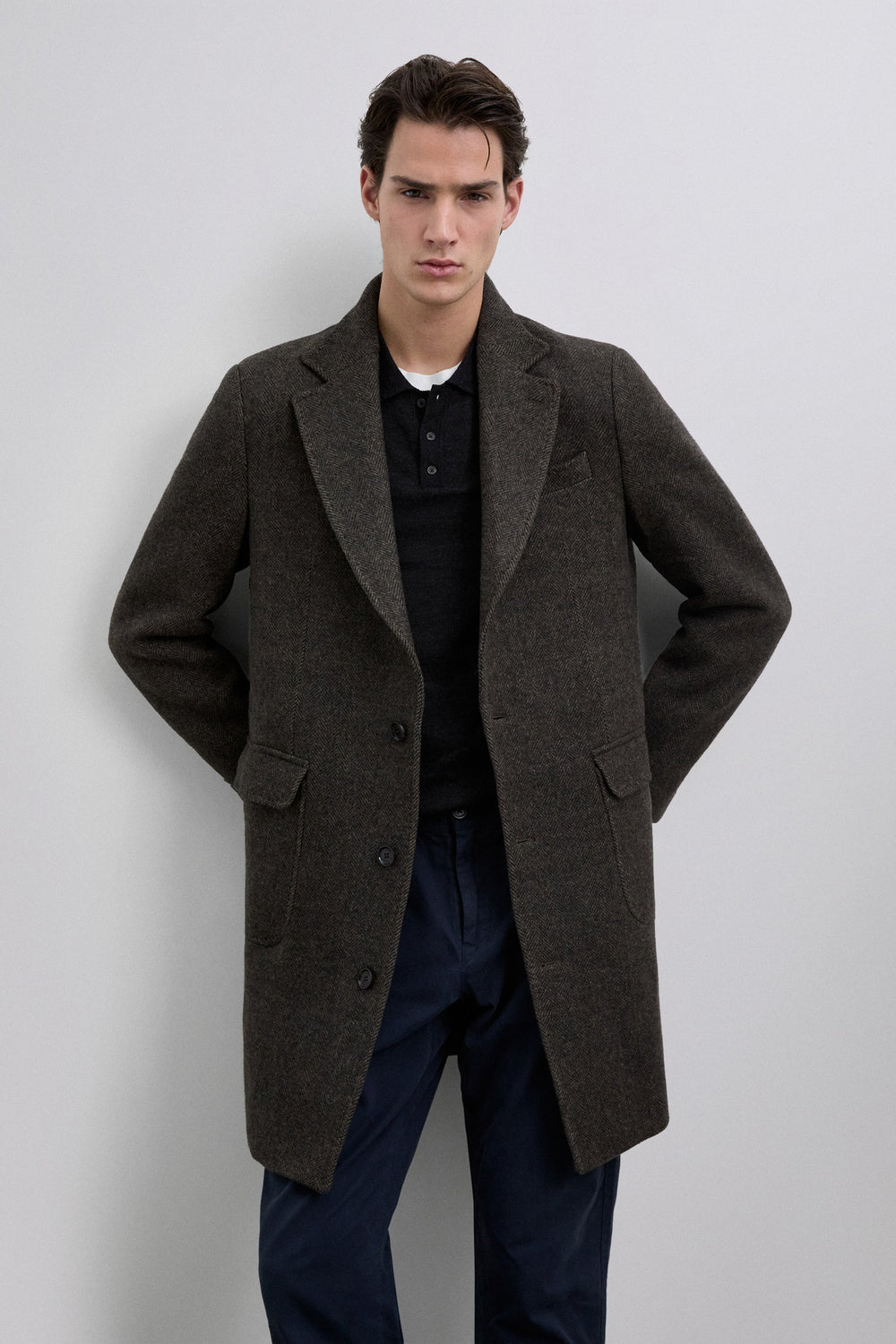 Herringbone woven coat in shades of brown. Lapel collar. Double flap pockets and front button fastening. Brushed feel.