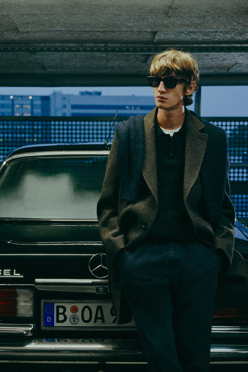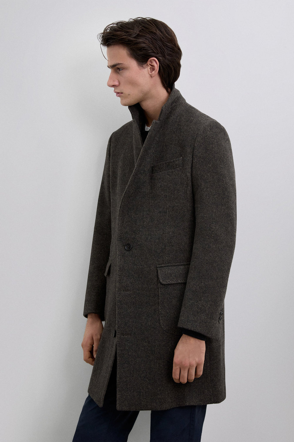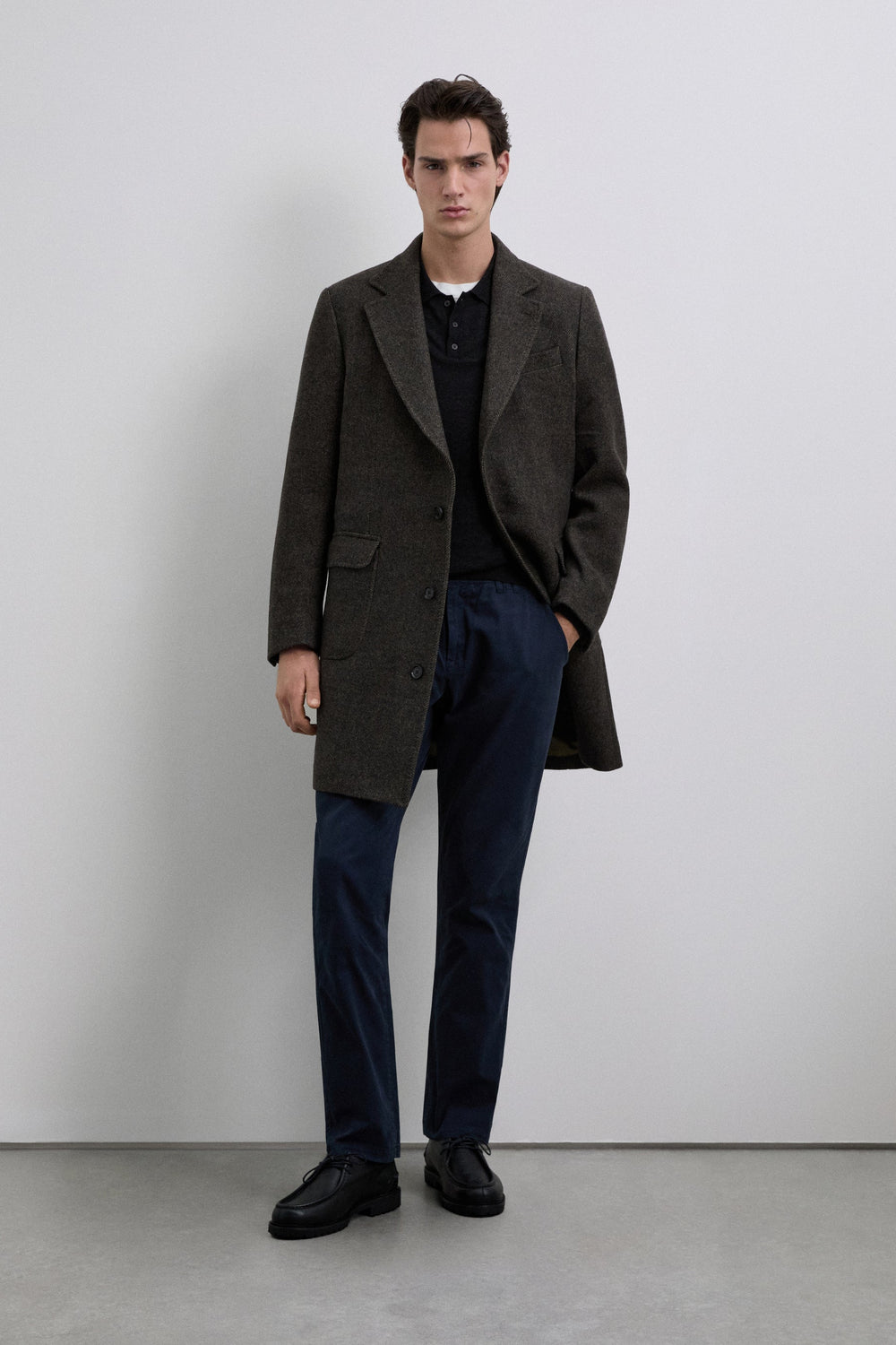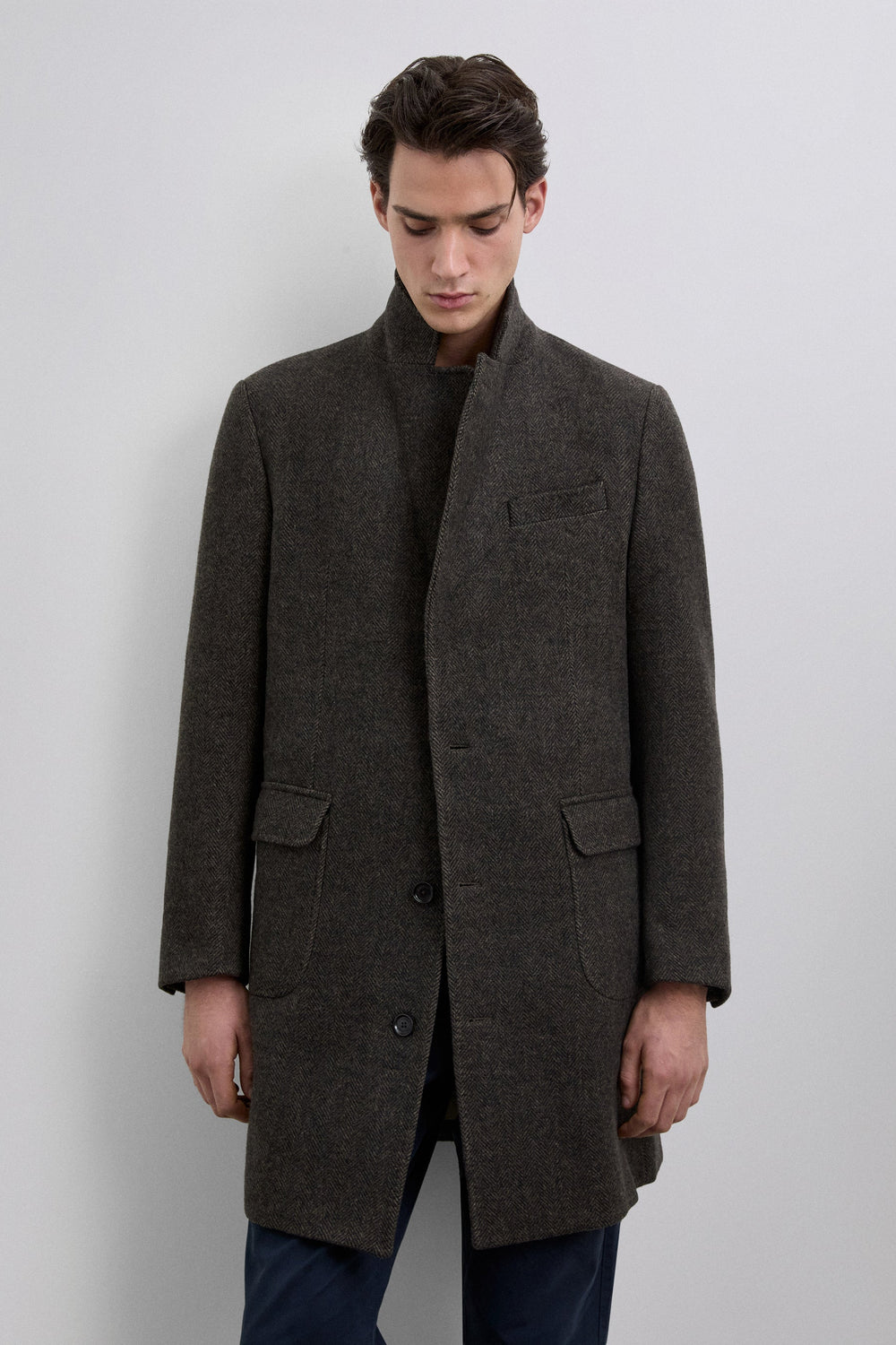 Herringbone woven coat in shades of brown. Lapel collar. Double flap pockets and front button fastening. Brushed feel.