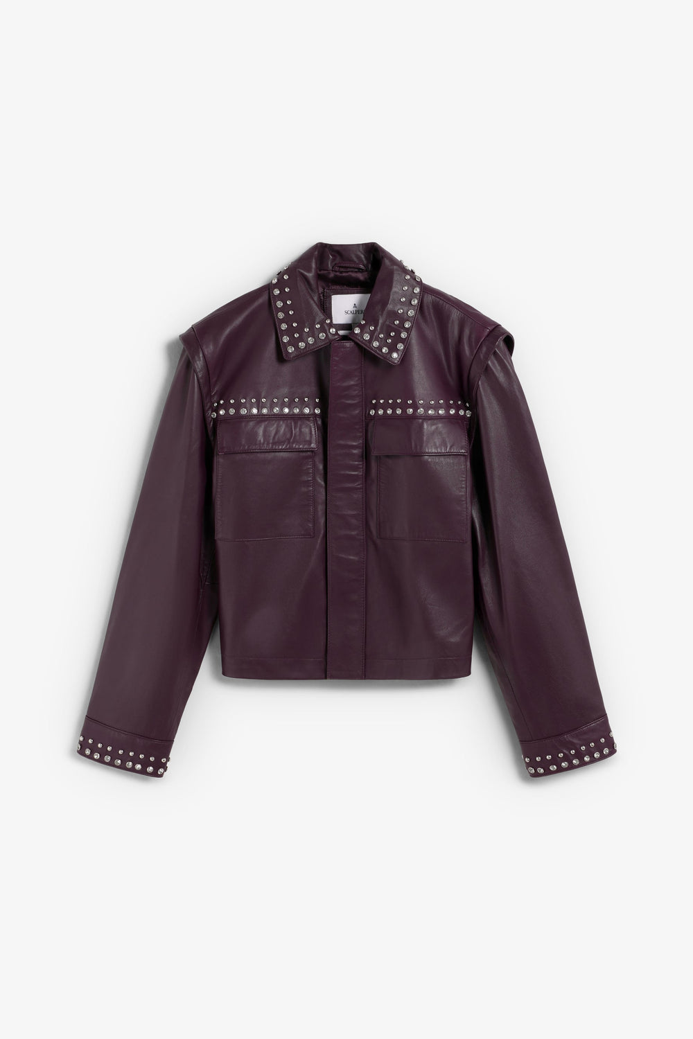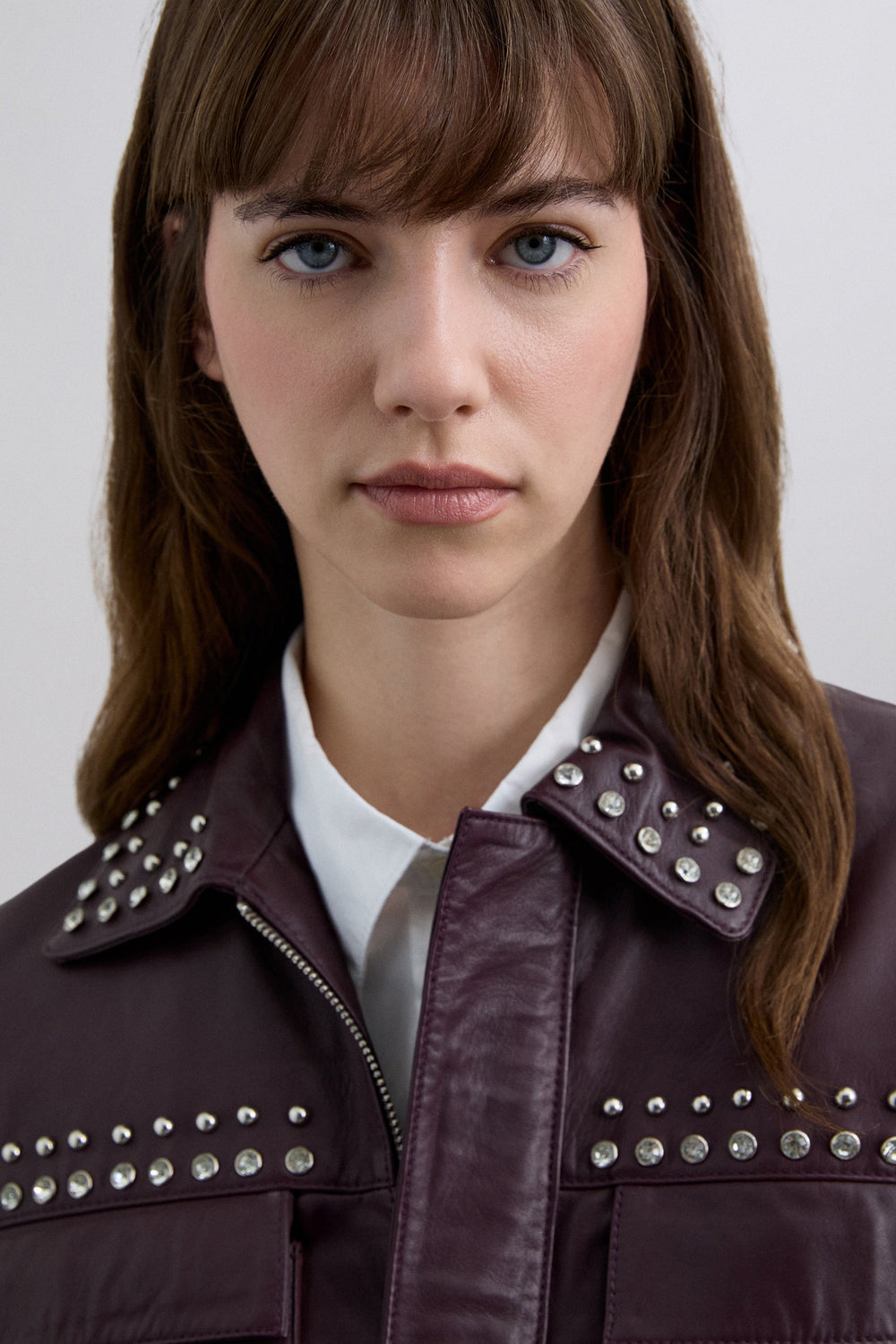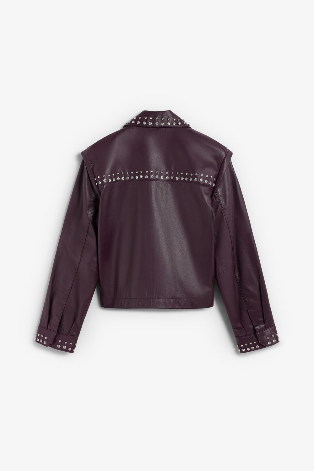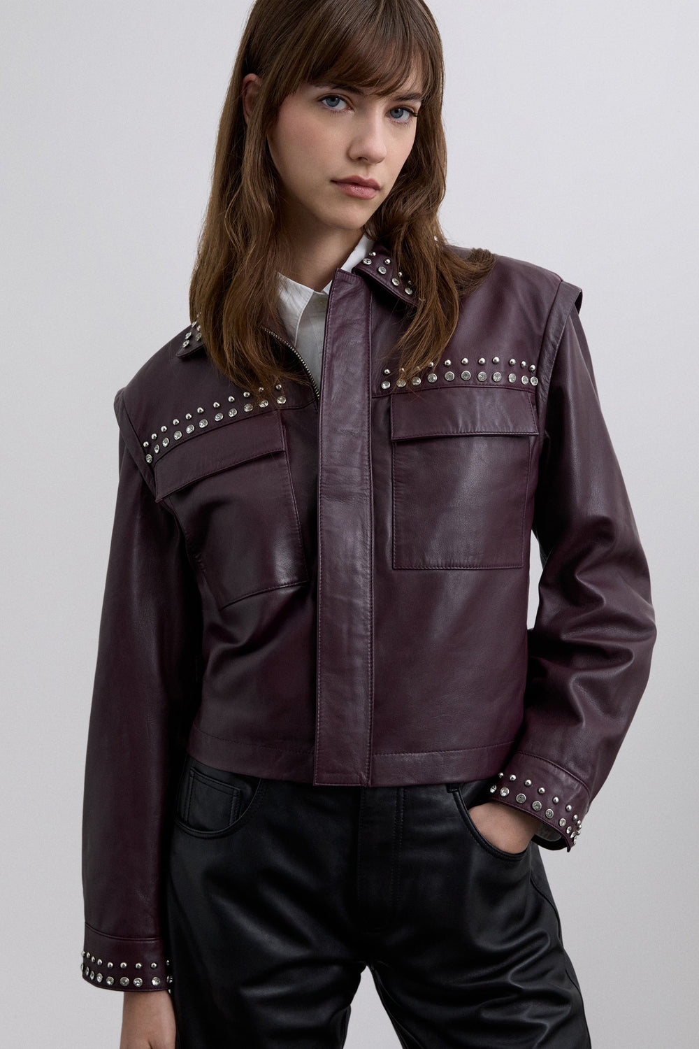 Jack gemaakt van 100% leer. Regular fit. Klassieke kraag. Geborduurde studs en stras details. Rits en drukknoopsluiting in het midden. Opgezette zakken voor. Lange mouw met manchetten afgewerkt met knoop.