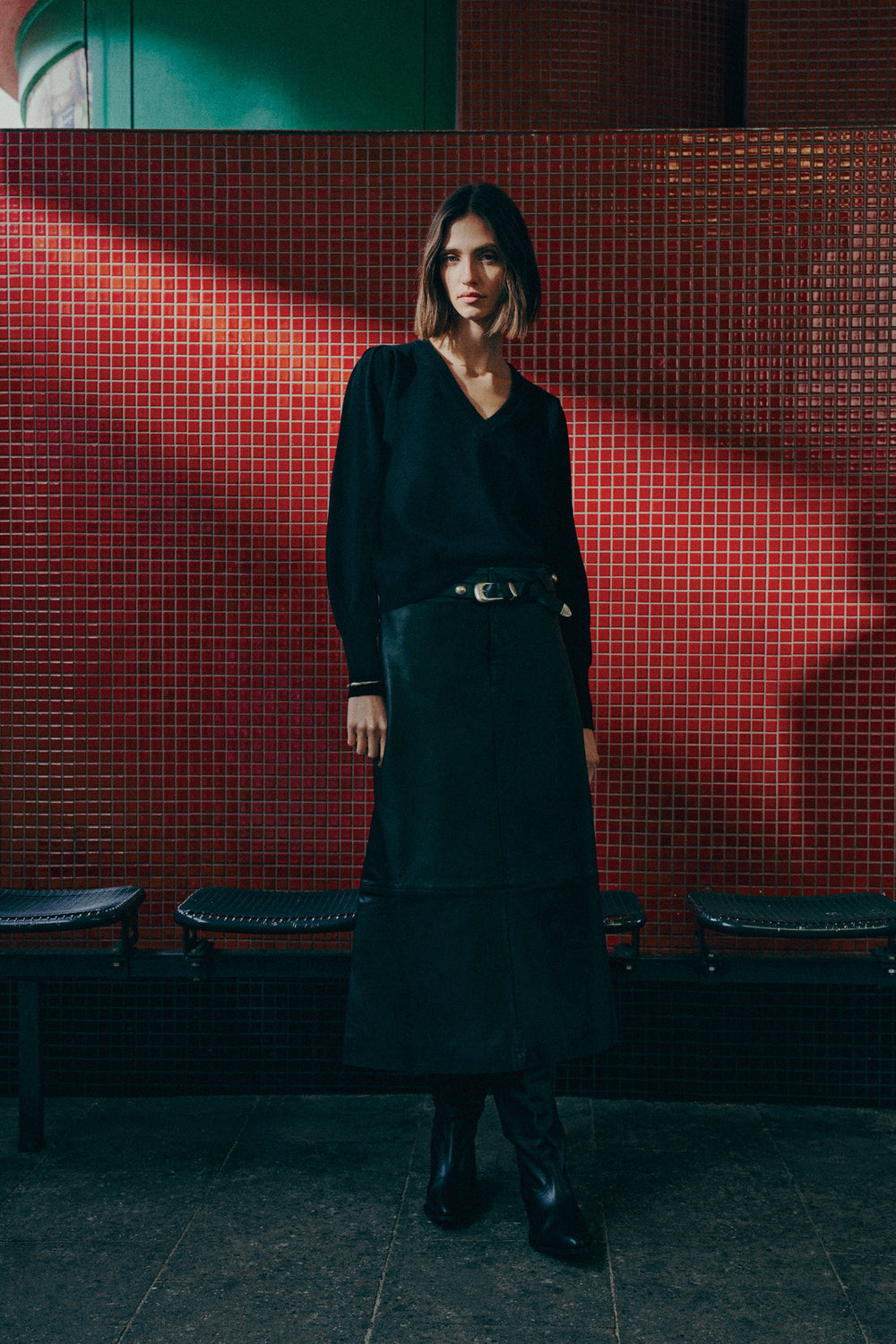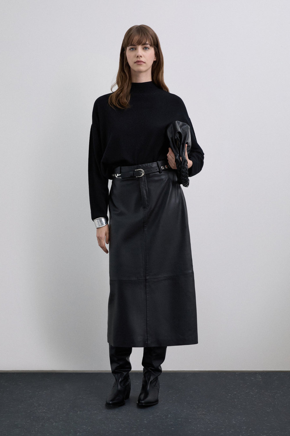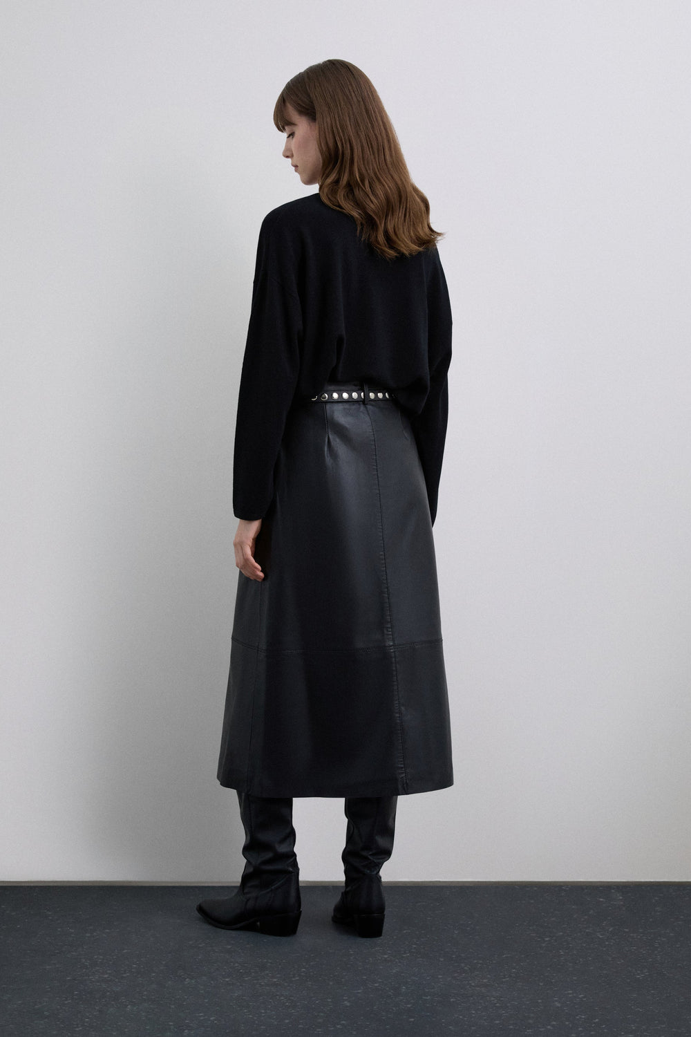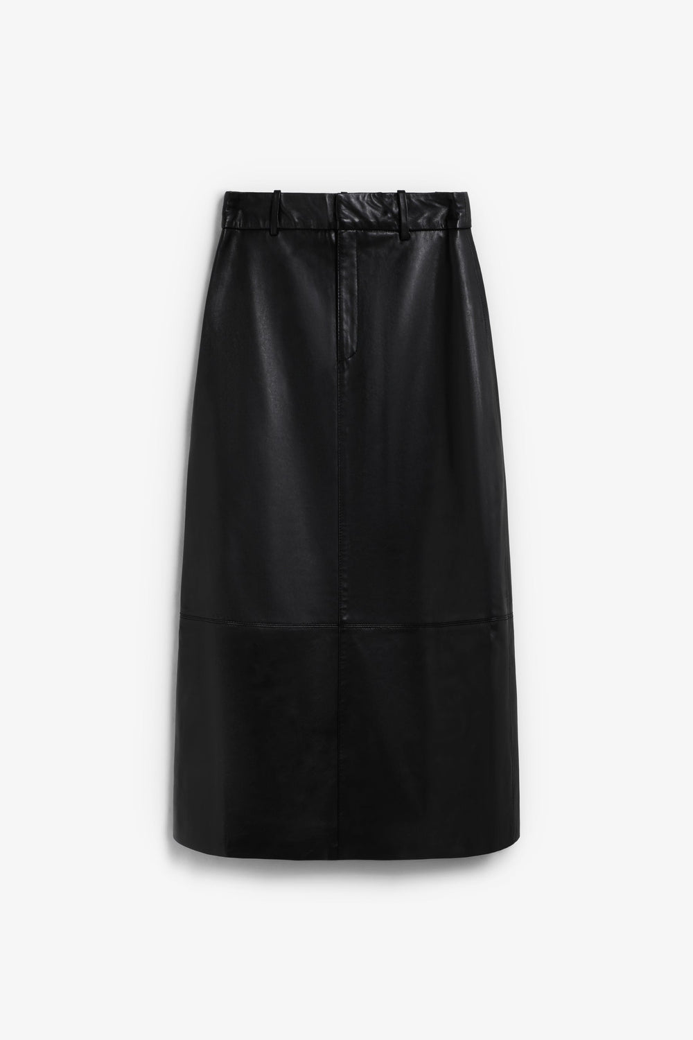 Halflange rok van leer. Rits en knoopsluiting voor. Detail in de taille voor riem. Naden.