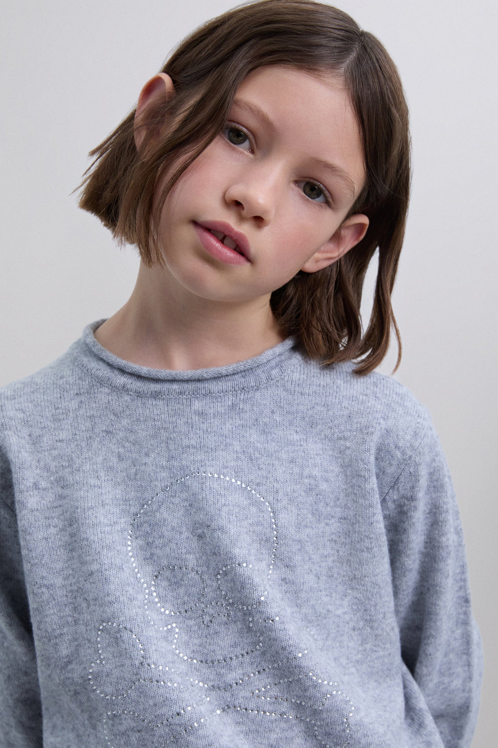 Sweater made of a synthetic blend with rhinestone logo print. Round neck with tonal ribbed trim. Cuffed sleeves and hem.