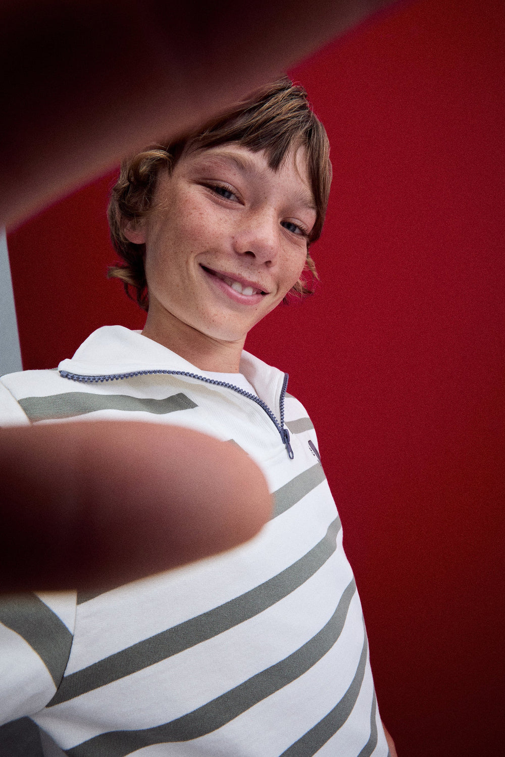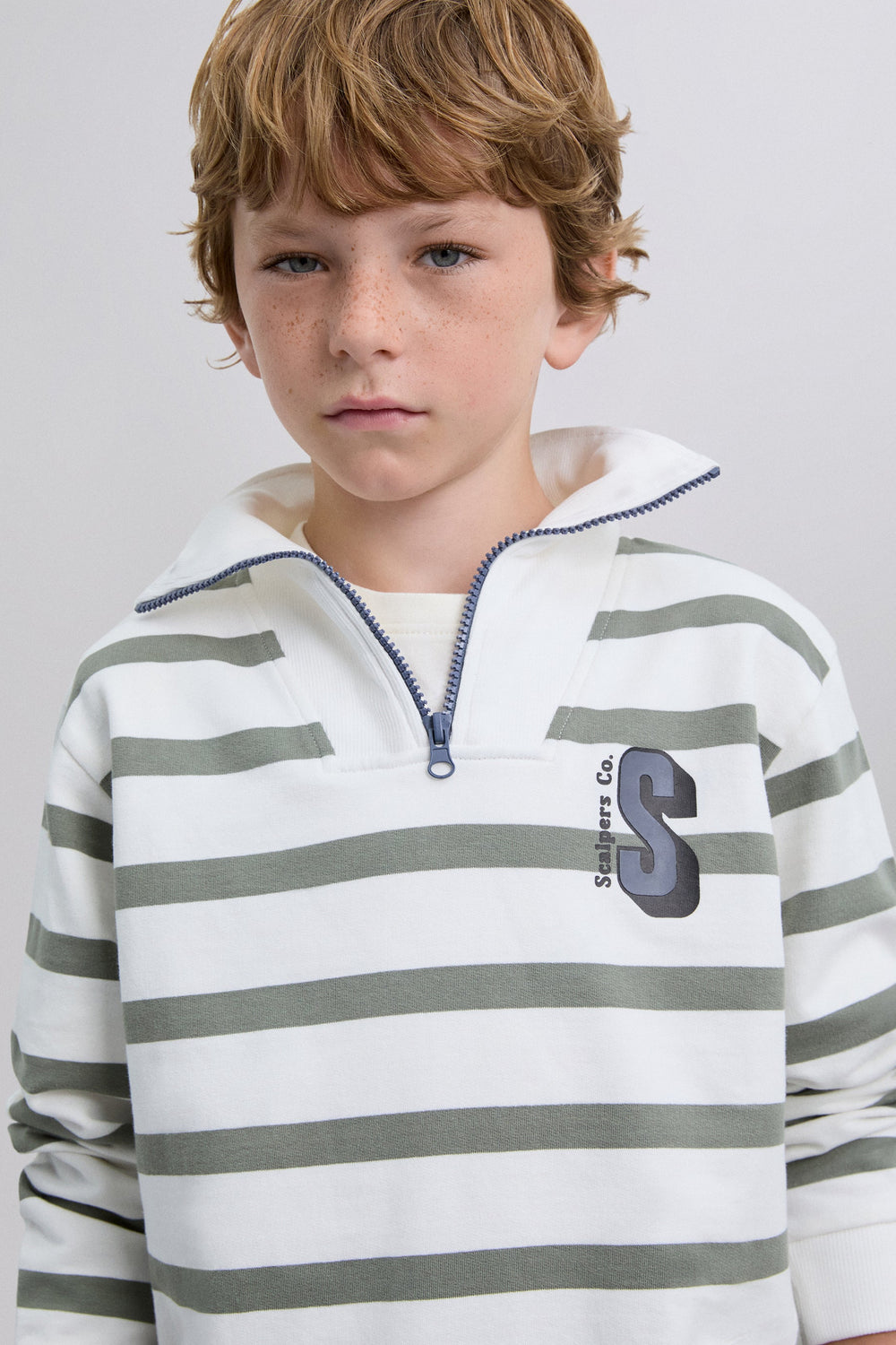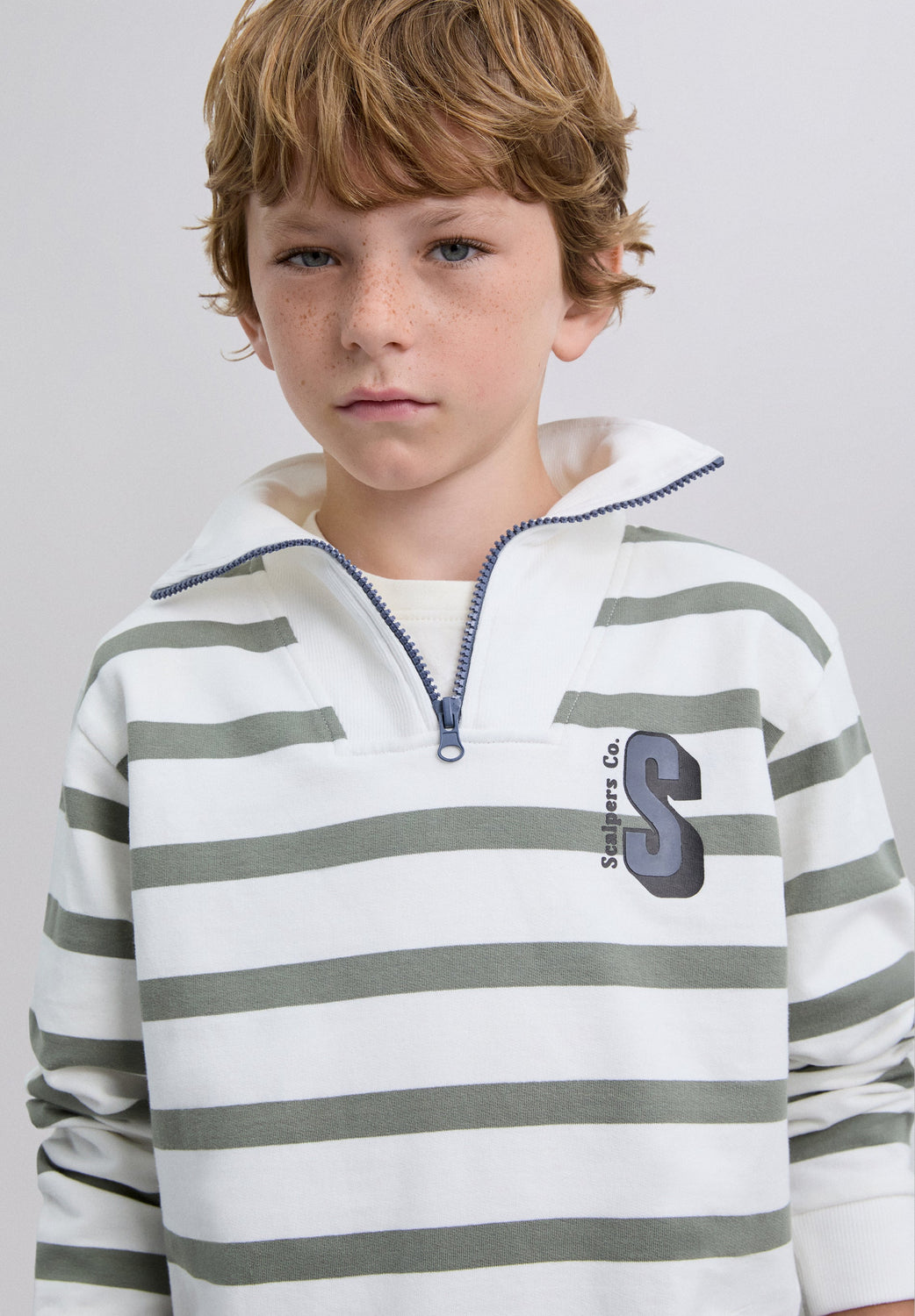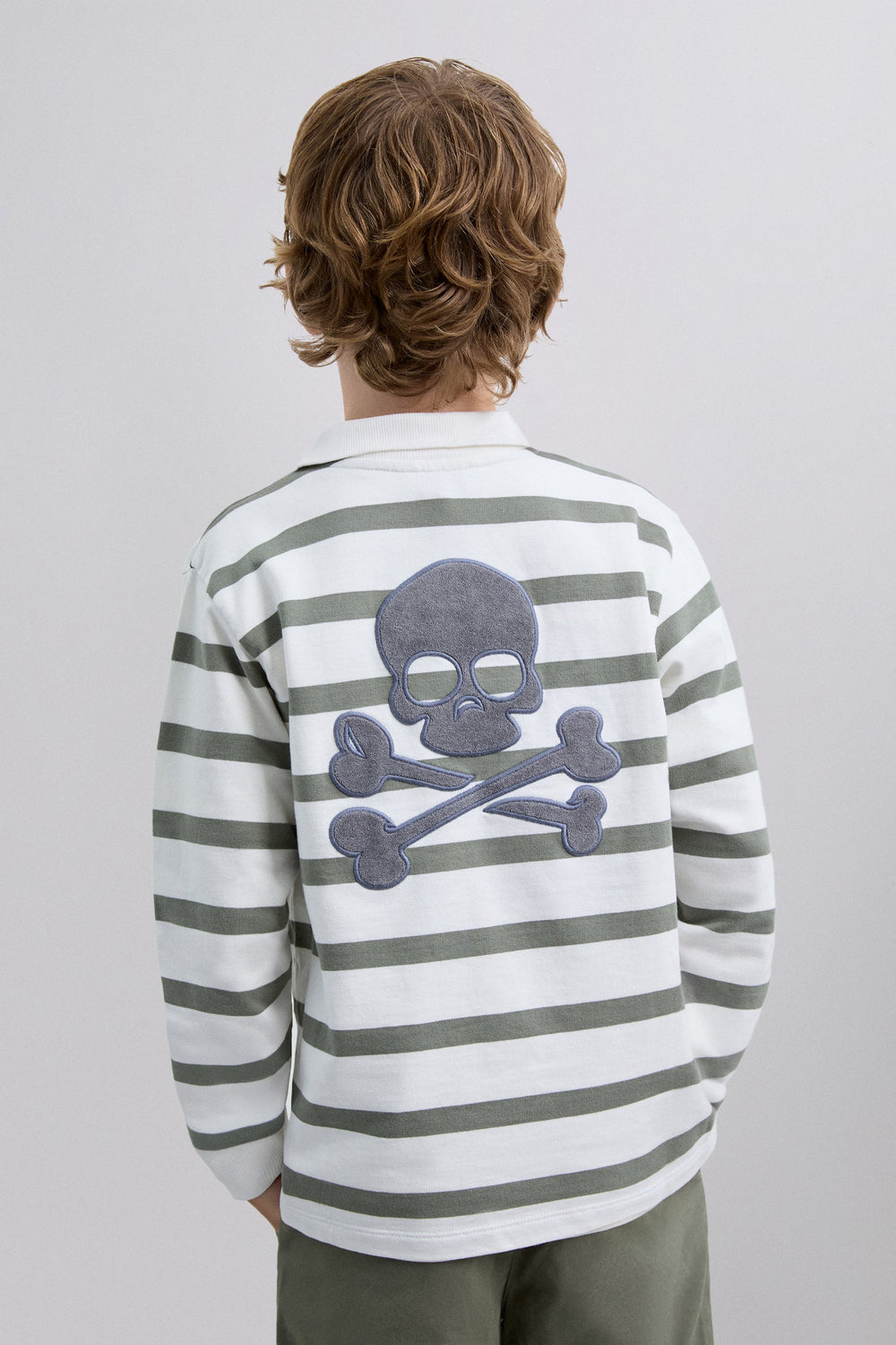 Striped sweatshirt made of 100% BCI cotton. Polo collar with half zip. Regular fit. Long sleeves. Two front pockets. Logo print on chest and contrast embroidered skull on back.