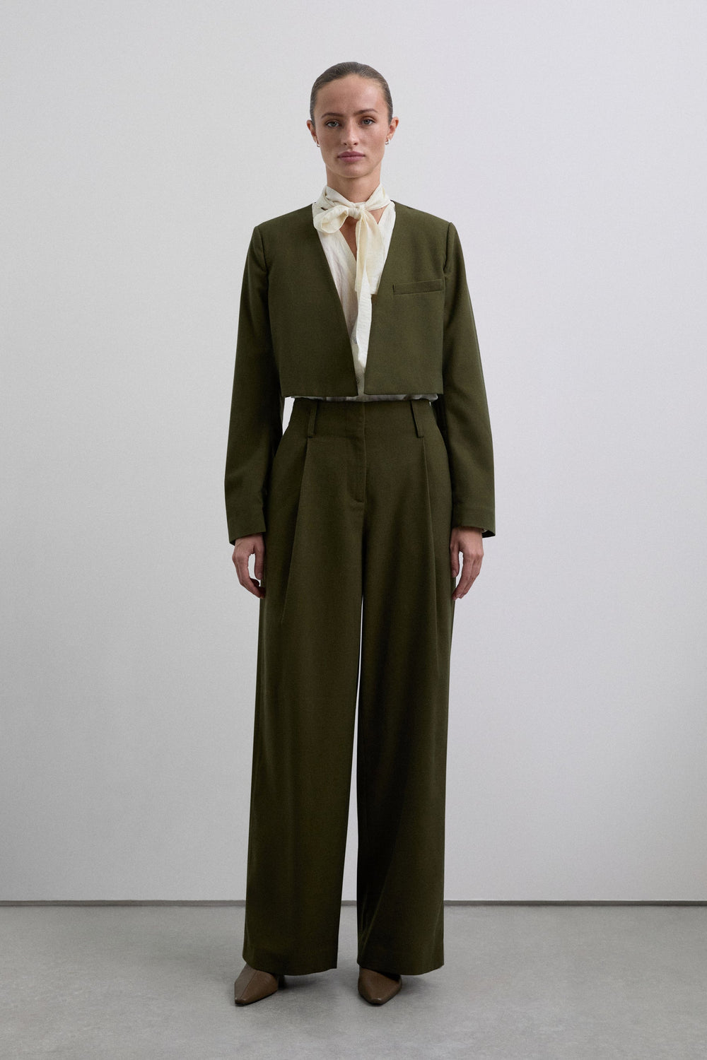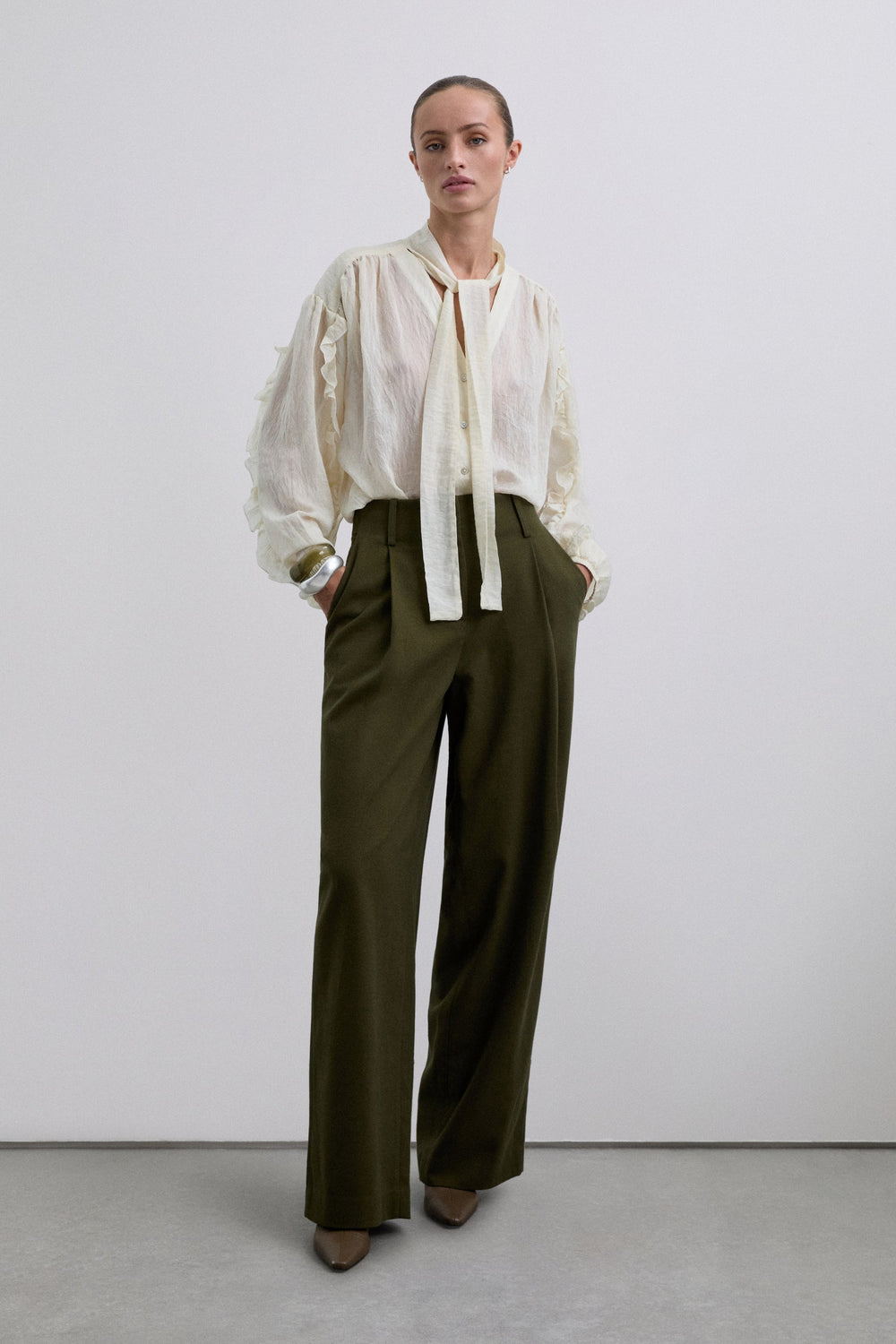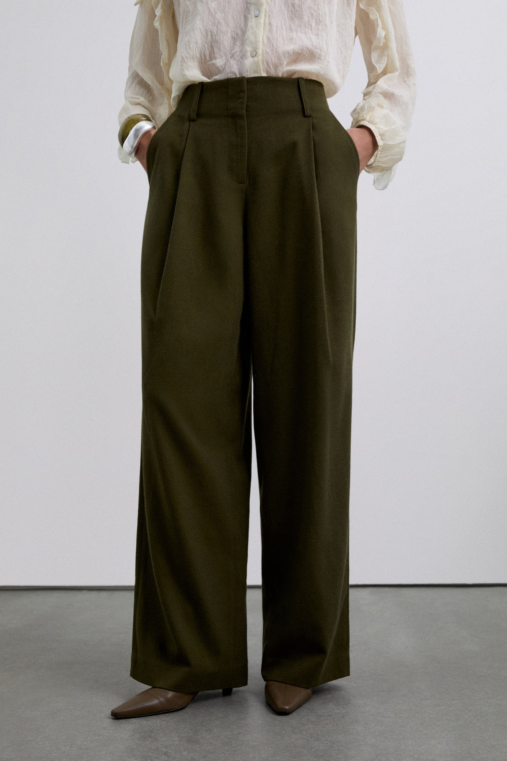 Darted trousers made of a slightly stretchy viscose blend fabric. Regular fit. Full Length. Belt loops at the waist. Zip and concealed hook fastening. Side slanted pockets and two welt pockets at the back.