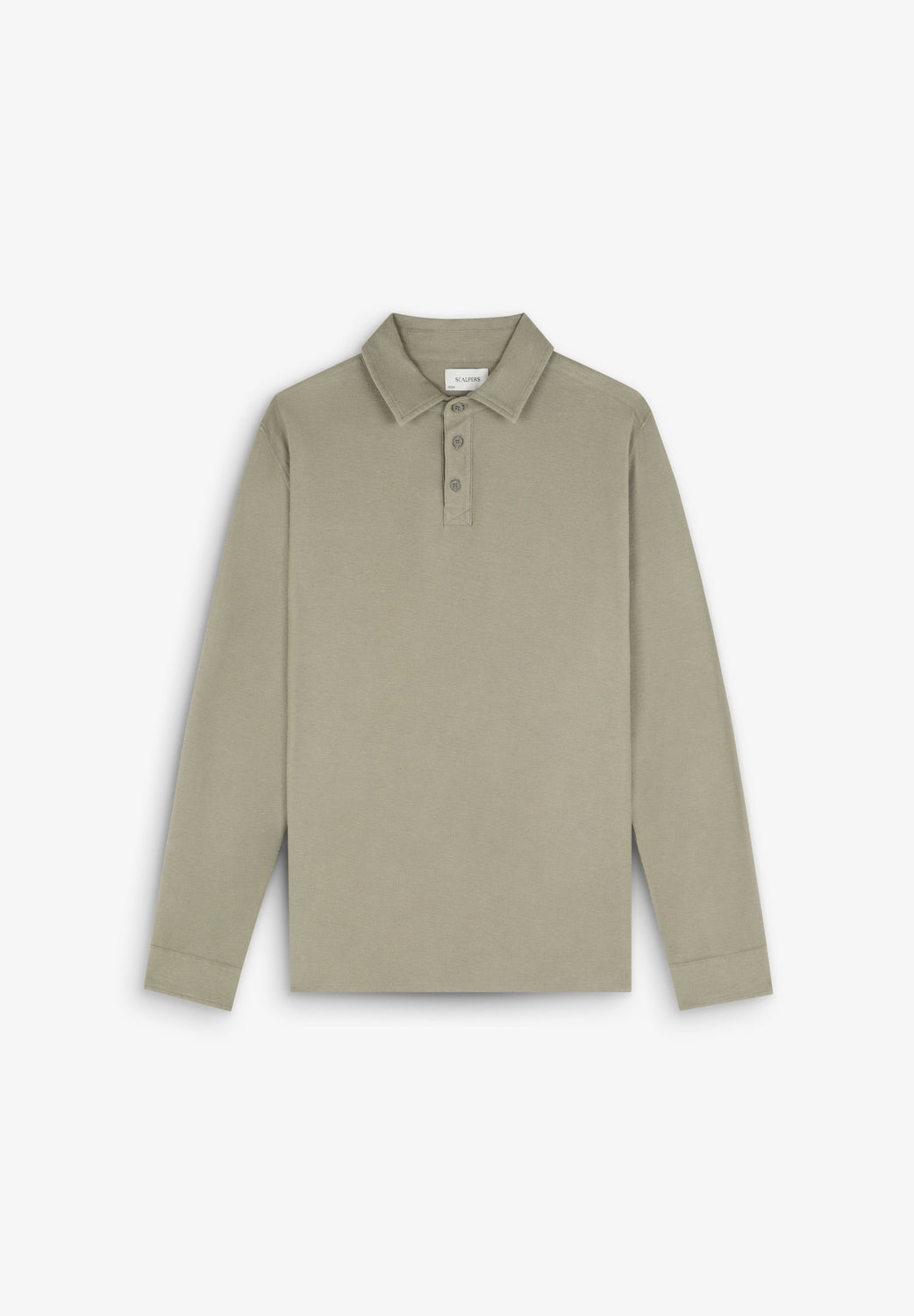 Long sleeved knit polo shirt. Made of a slightly stretch cotton and linen blend fabric. Polo shirt collar with buttons. Button fastening on sleeve.