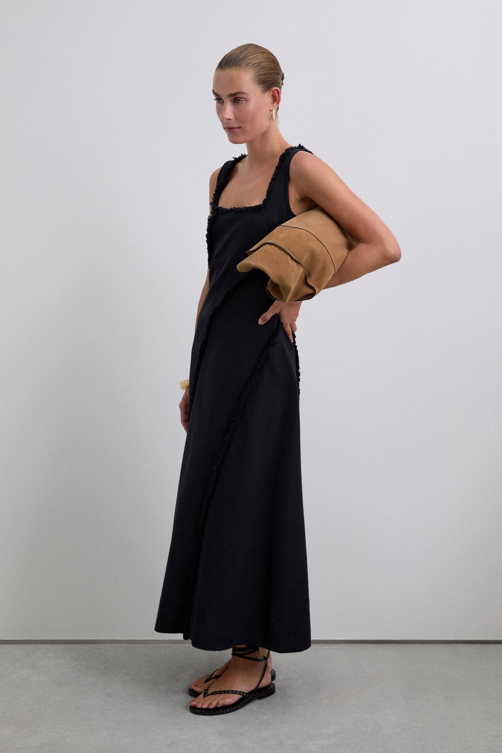 Midi dress made of 100% organic BCI cotton. Straps. Square-cut neckline. Topstitched fringe detail.