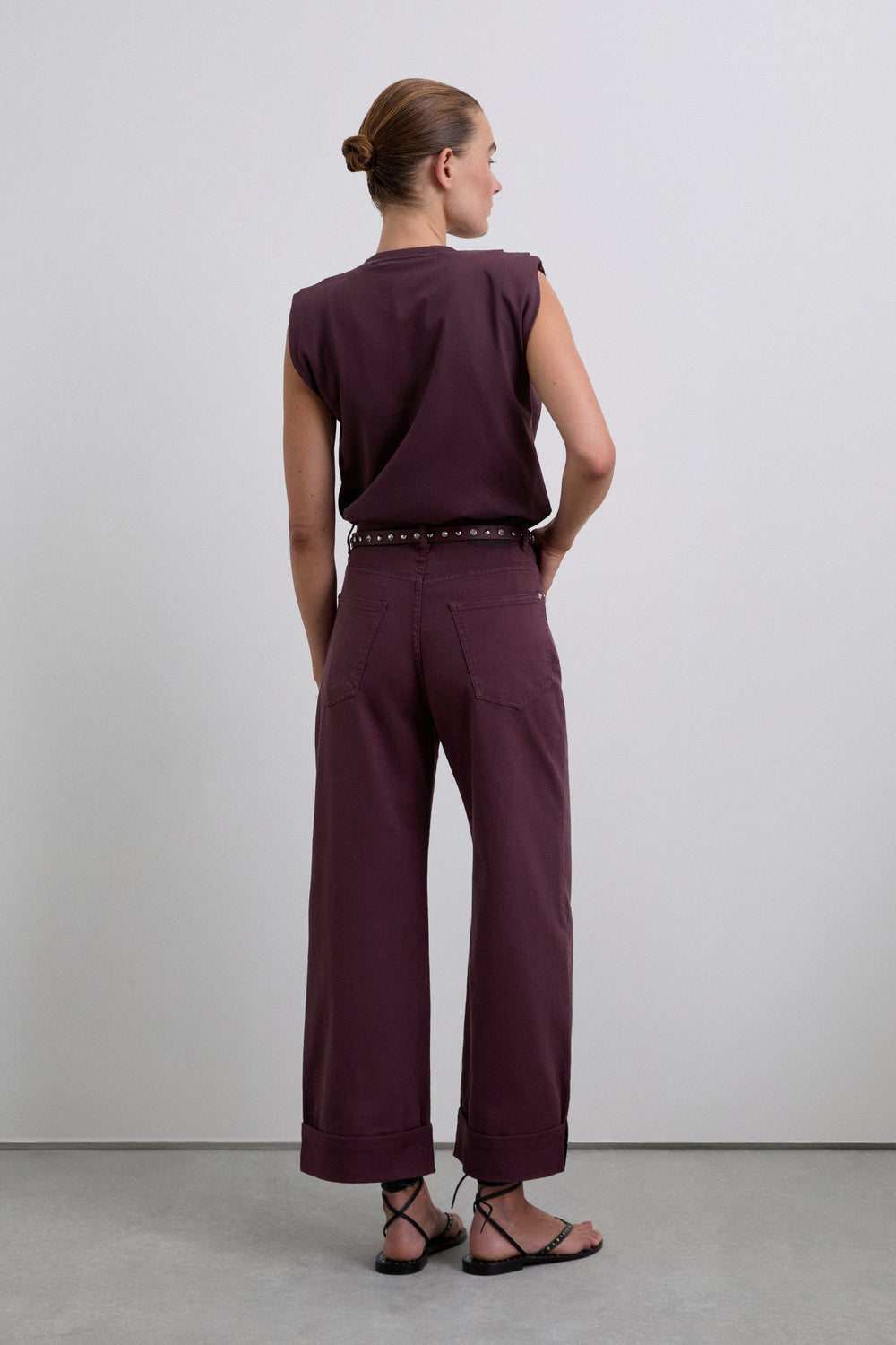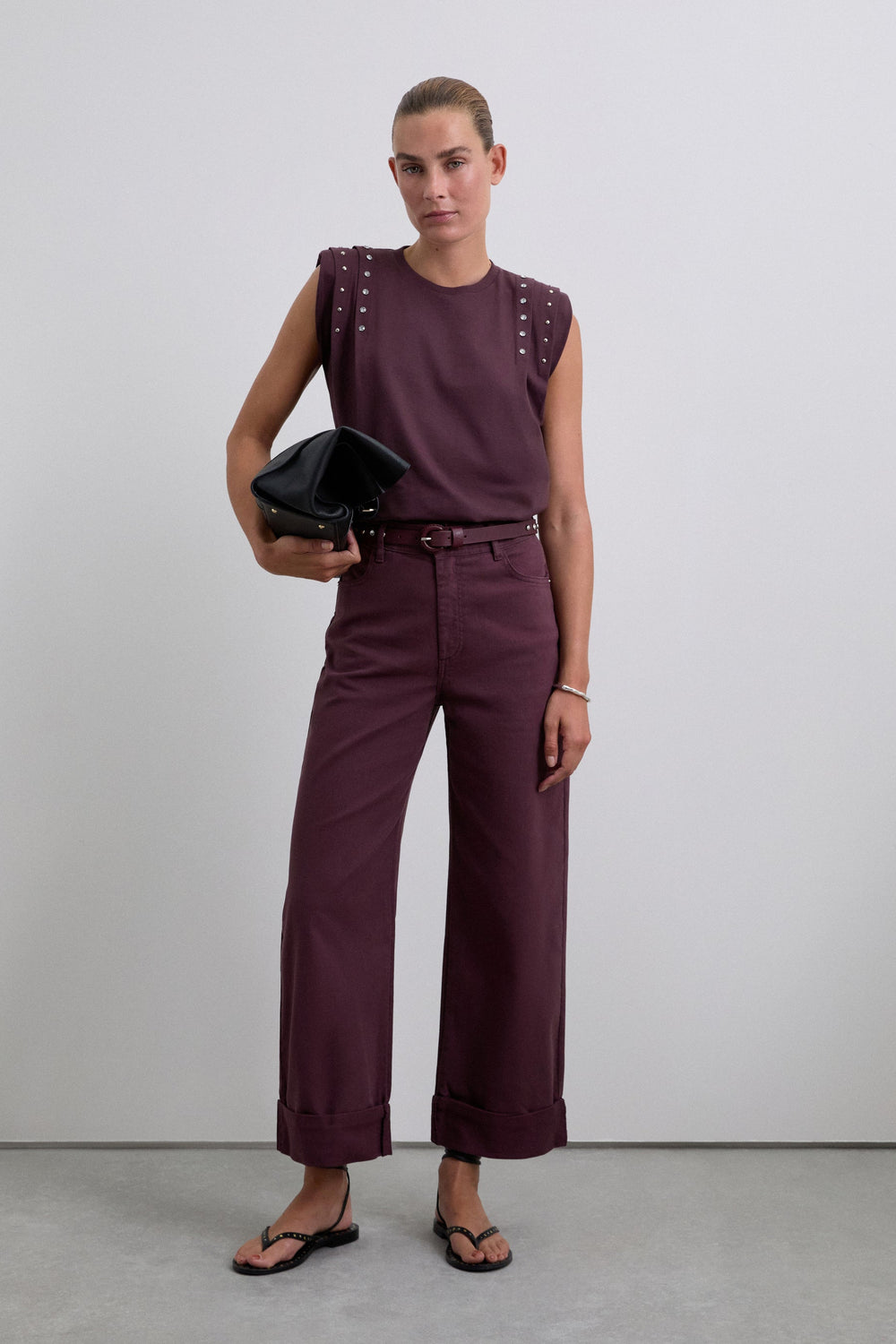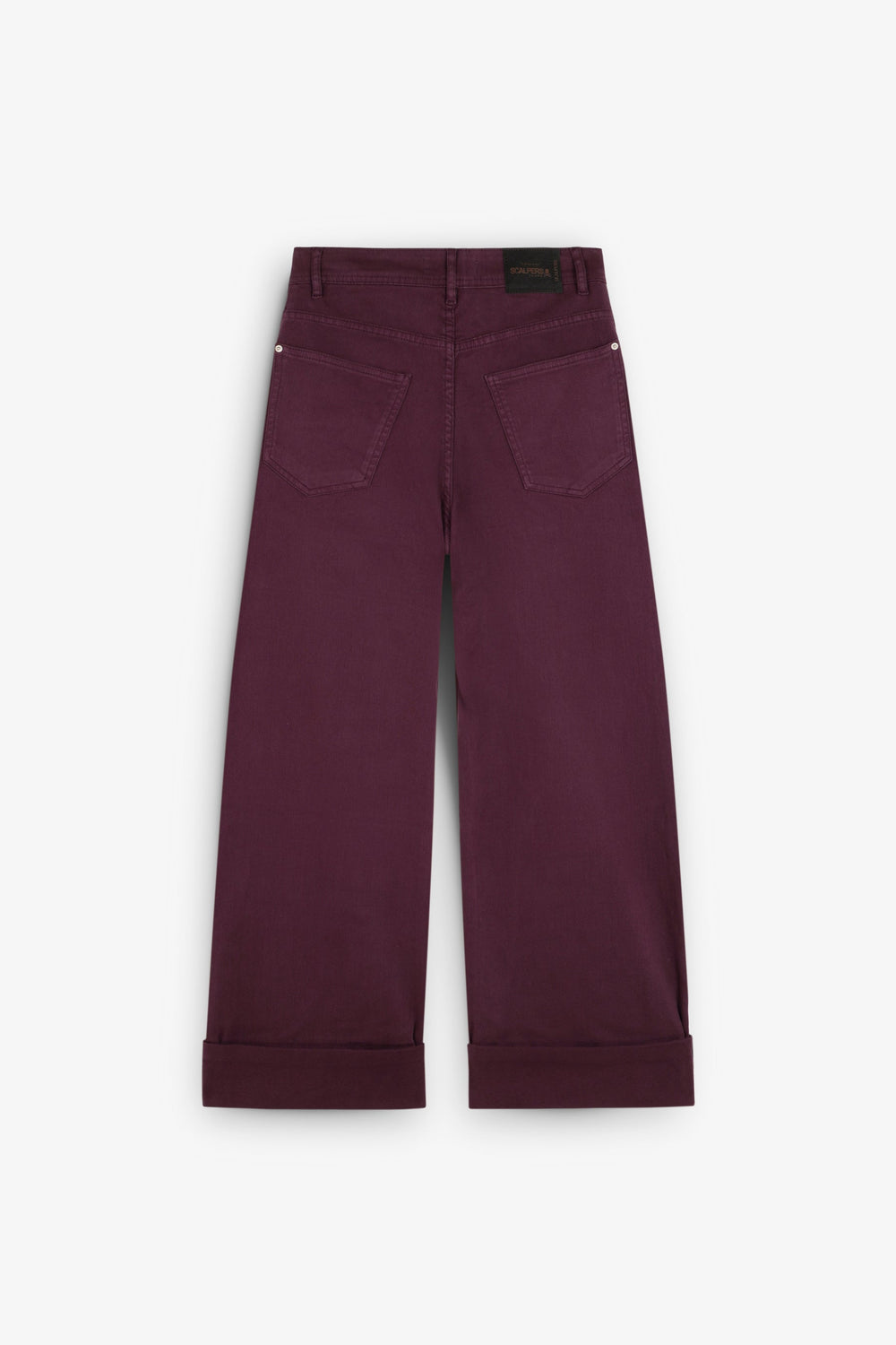 Mid-rise denim culottes. Relaxed fit. Pleat at the bottom. Front and back pockets. Button fastening and belt loops. Logo label detail at the back.