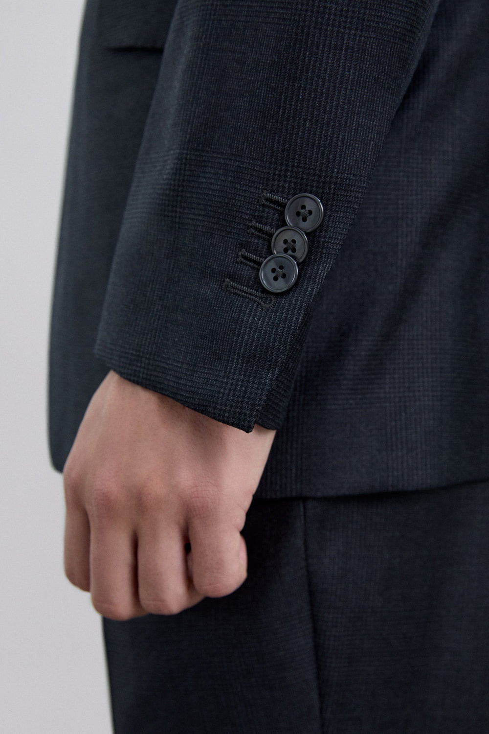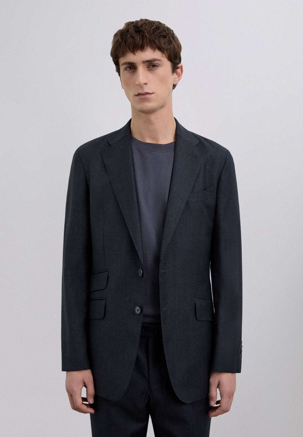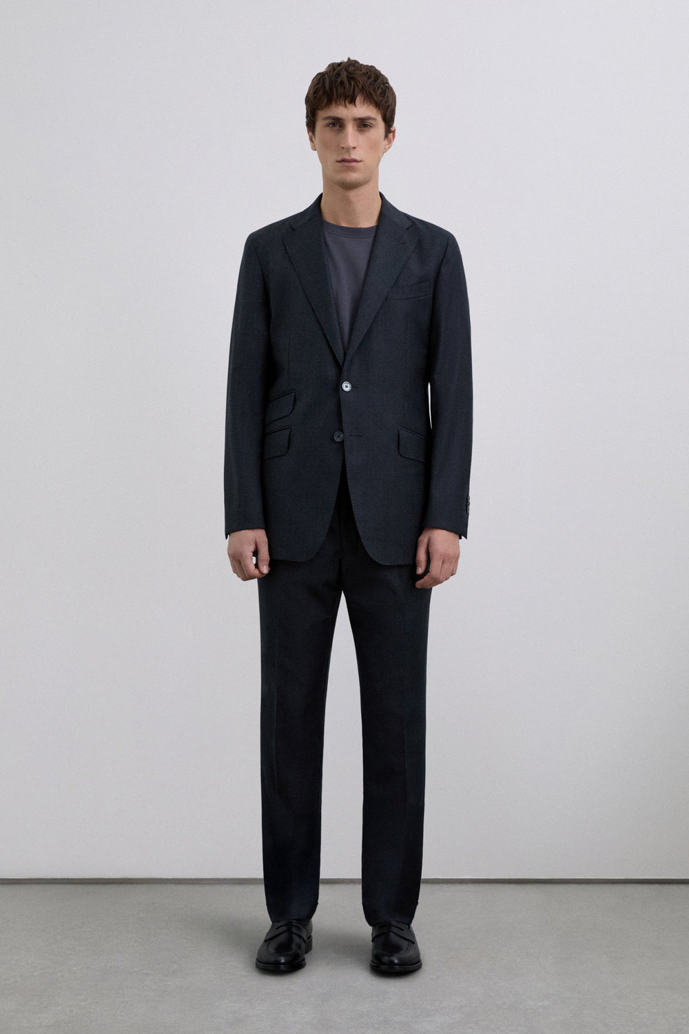 Americana confeccionada en 100% lana. Solapas regulares. Bolsillo de pecho con ribete. Tres bolsillos de solapa inclinados. Cierre frontal mediante dos botones.