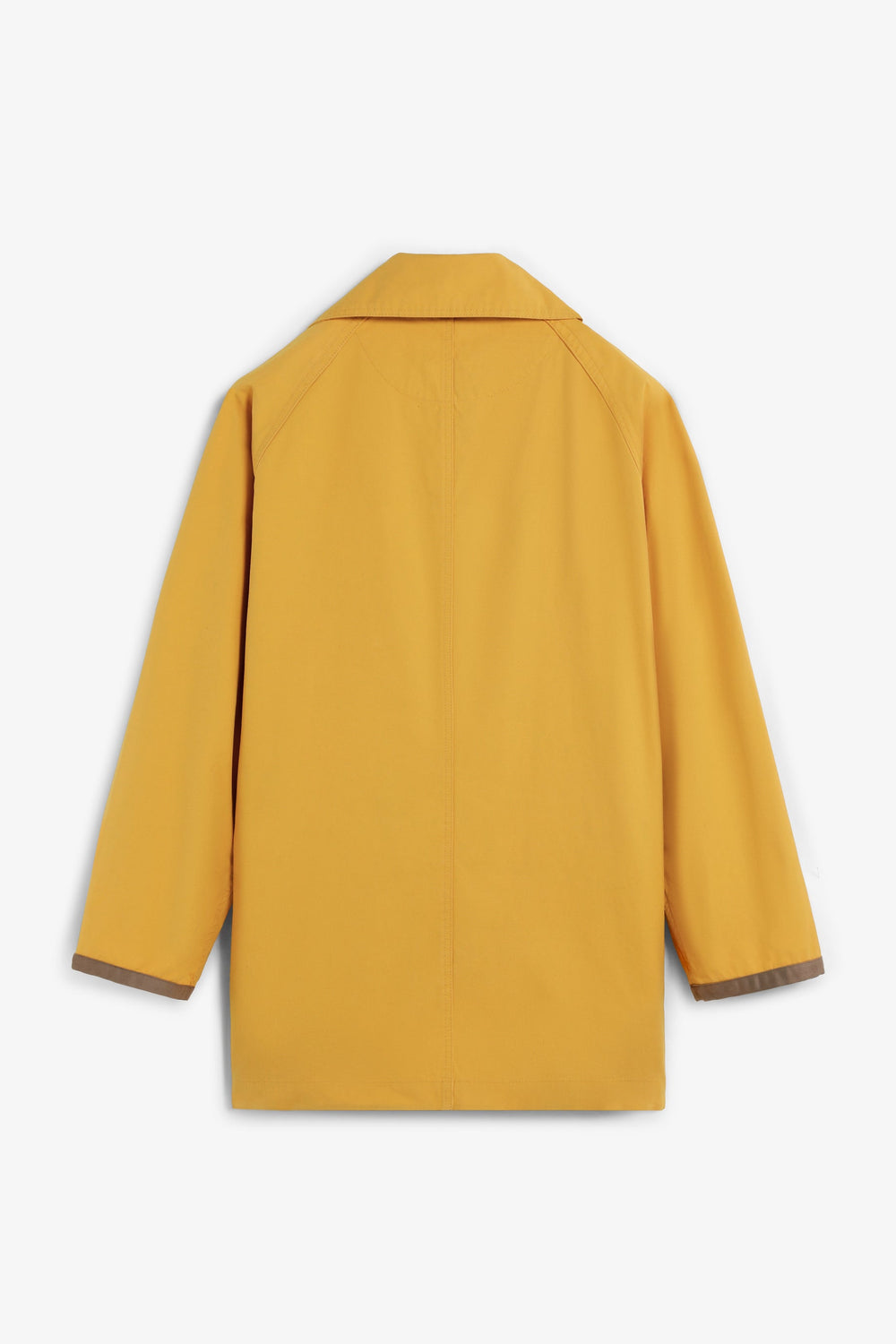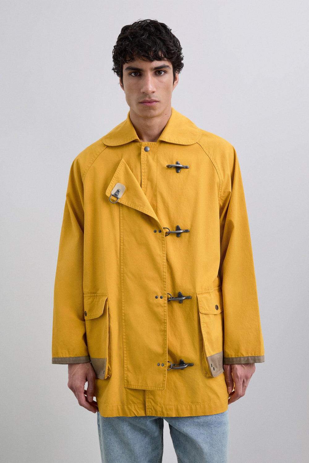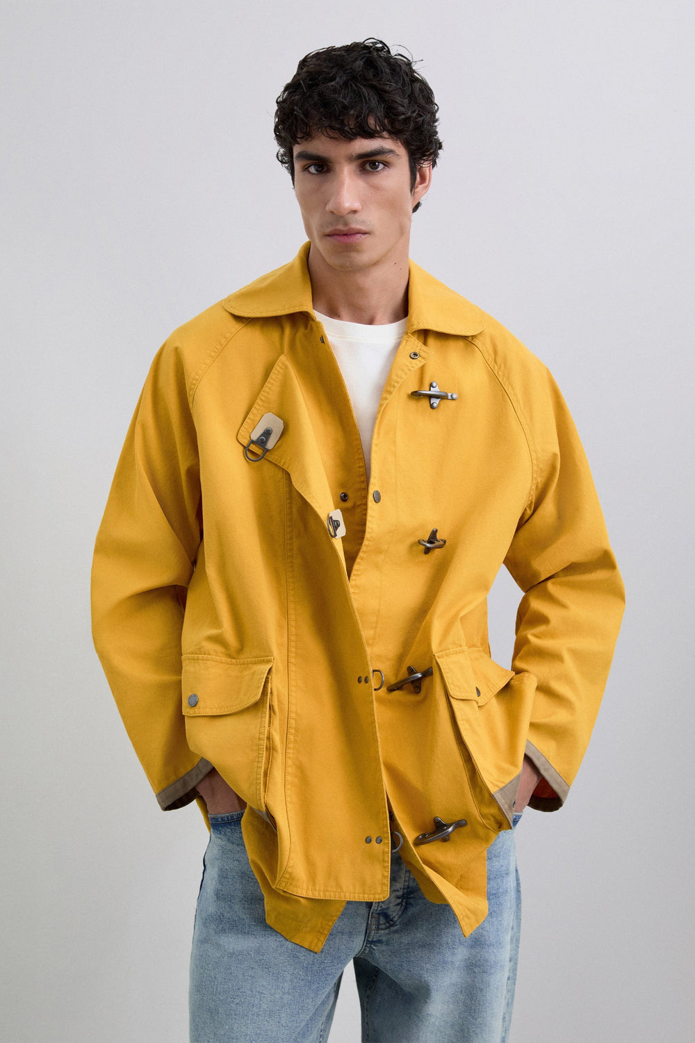 Jacket made of 100% organic cotton. Front buttoned pockets. Side pockets with eyelet details. Oversize design. Rounded shirt-style collar. Raglan sleeves. Fastens with snaps and toggles. Suede piping around the sleeve opening and on the lower edge of the pocket.