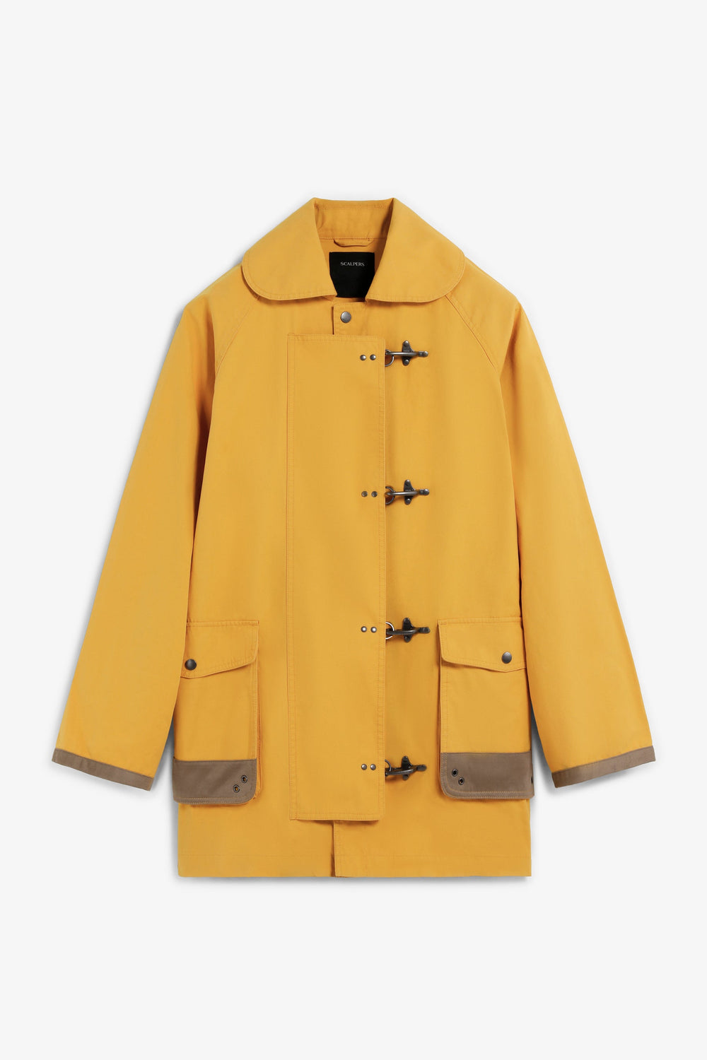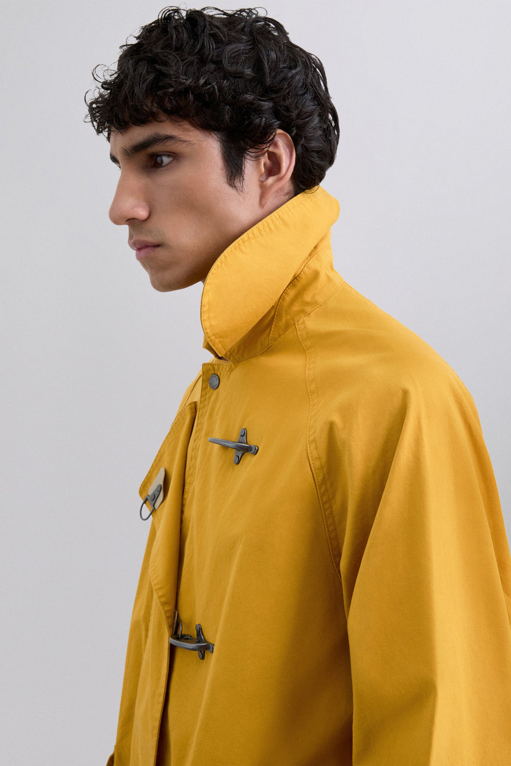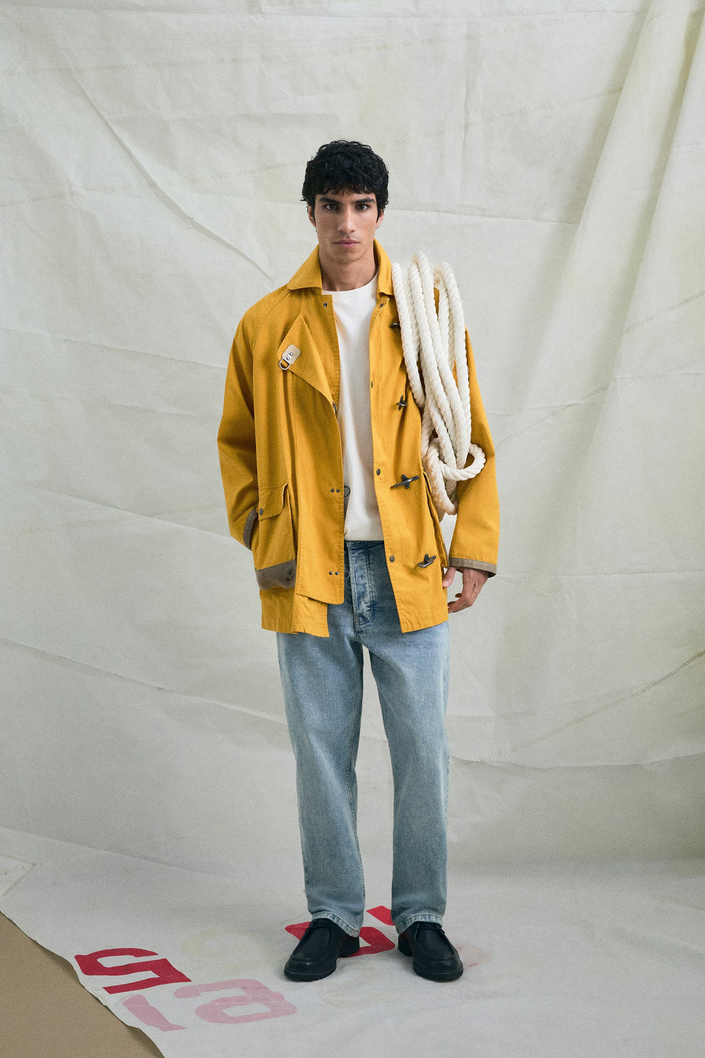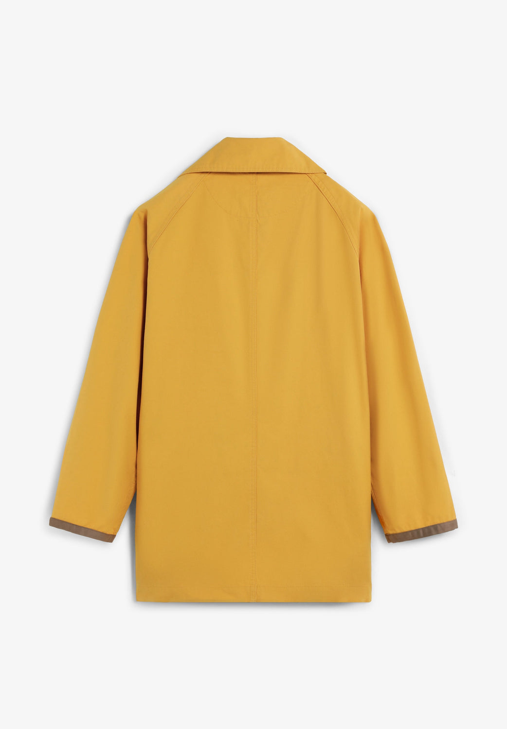Jacket made of 100% organic cotton. Front buttoned pockets. Side pockets with eyelet details. Oversize design. Rounded shirt-style collar. Raglan sleeves. Fastens with snaps and toggles. Suede piping around the sleeve opening and on the lower edge of the pocket.