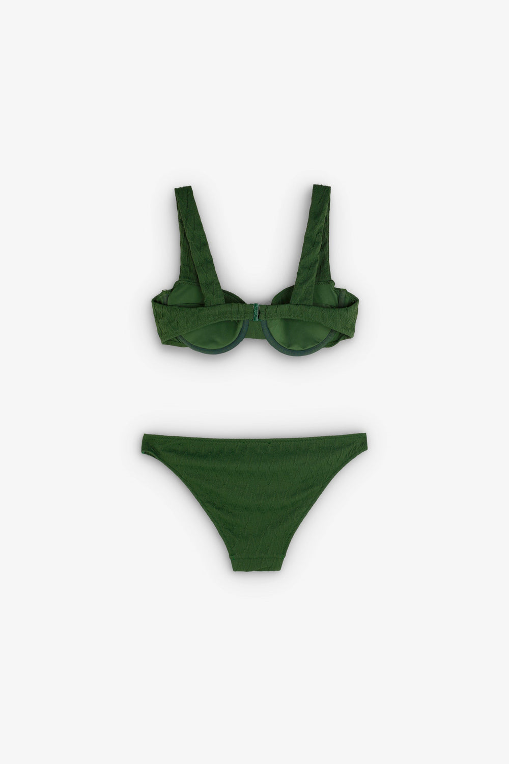 This bikini is designed in collaboration with Scalpers and belongs to the ROBIN x SCALPERS collection. This is a Balconette Bikini with a zig zag structure in dark green. It has an underwire, removable foam pads and wide straps for perfect support, with a multi-position hook-and-eye fastening at the back for a better fit. Bottom with classic coverage and side ties, fully lined. Also available with a classic cover bottom without ties.