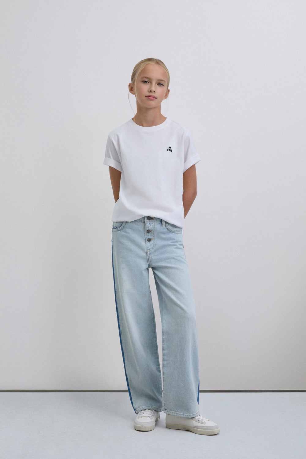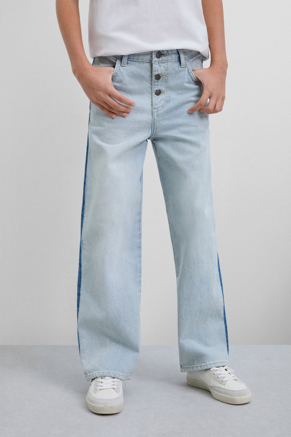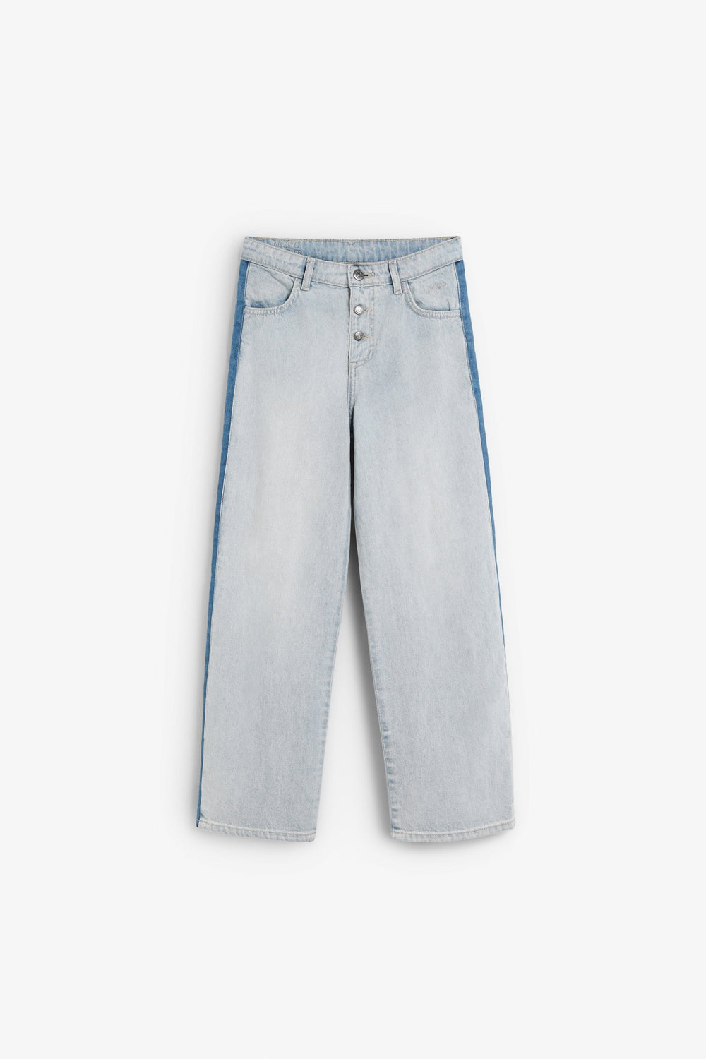 Wide led jeans made of 100% BCI cotton. Two button and zip fastening. Belt loops at the waist. Contrast seam detail on the side. 100% cotton lining.