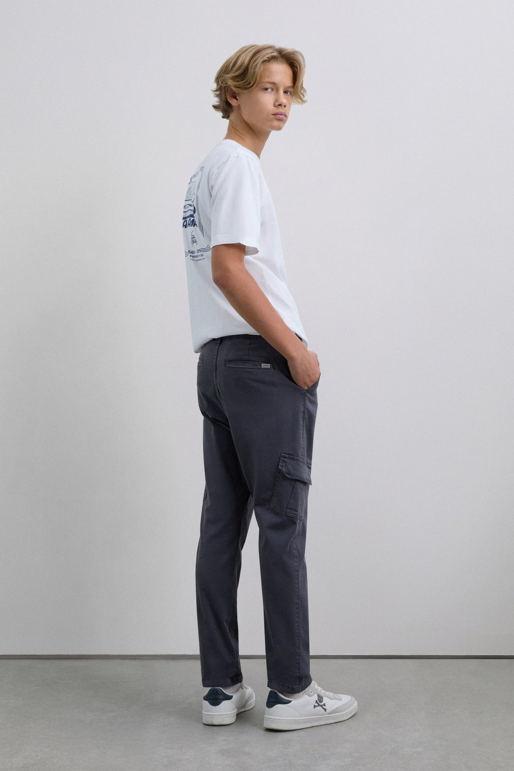 Cargo trousers made of slightly stretch BCI cotton. Regular fit, top button and zip fastening and side pockets. Belt loops at the waist and flap pockets on the leg.