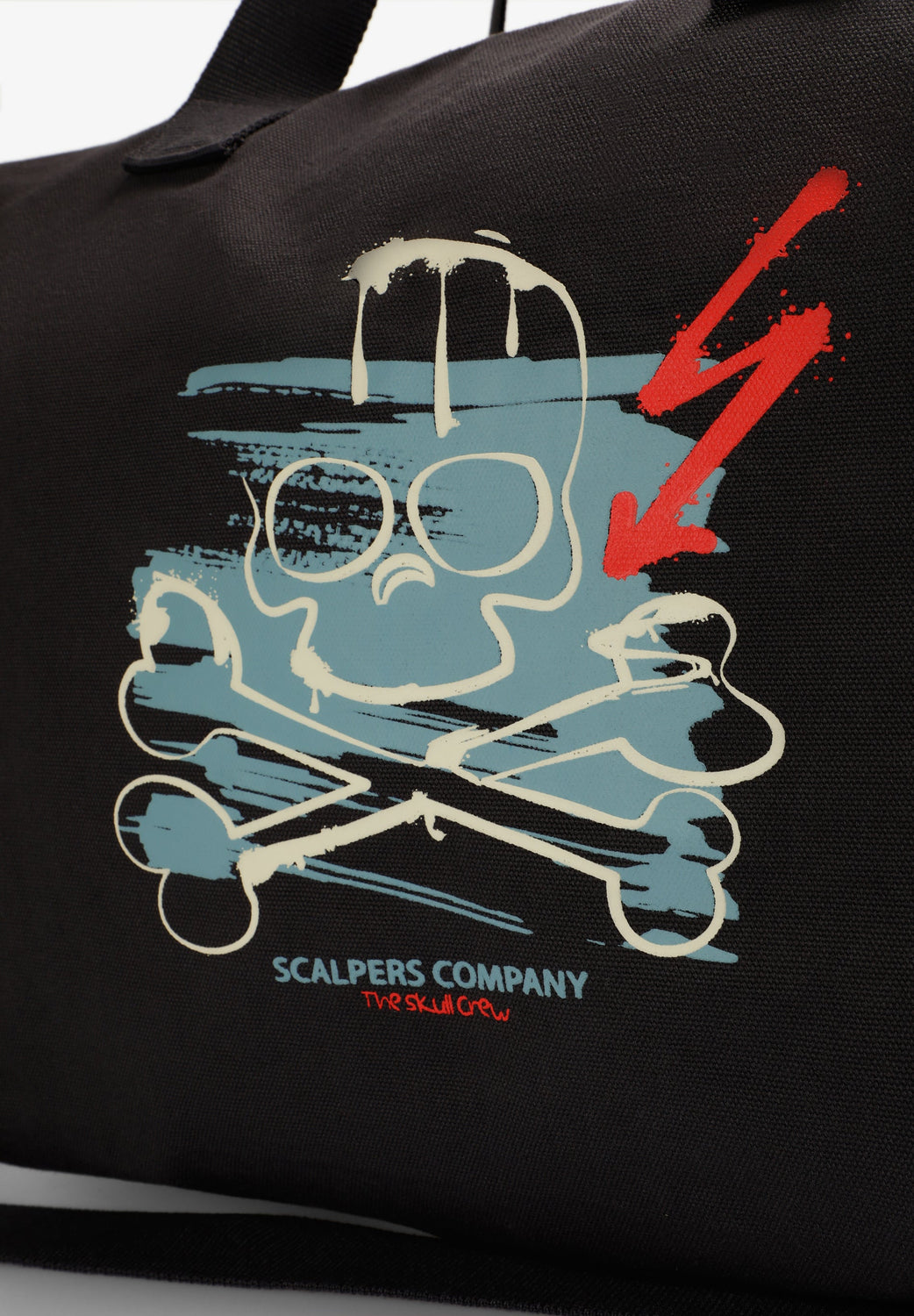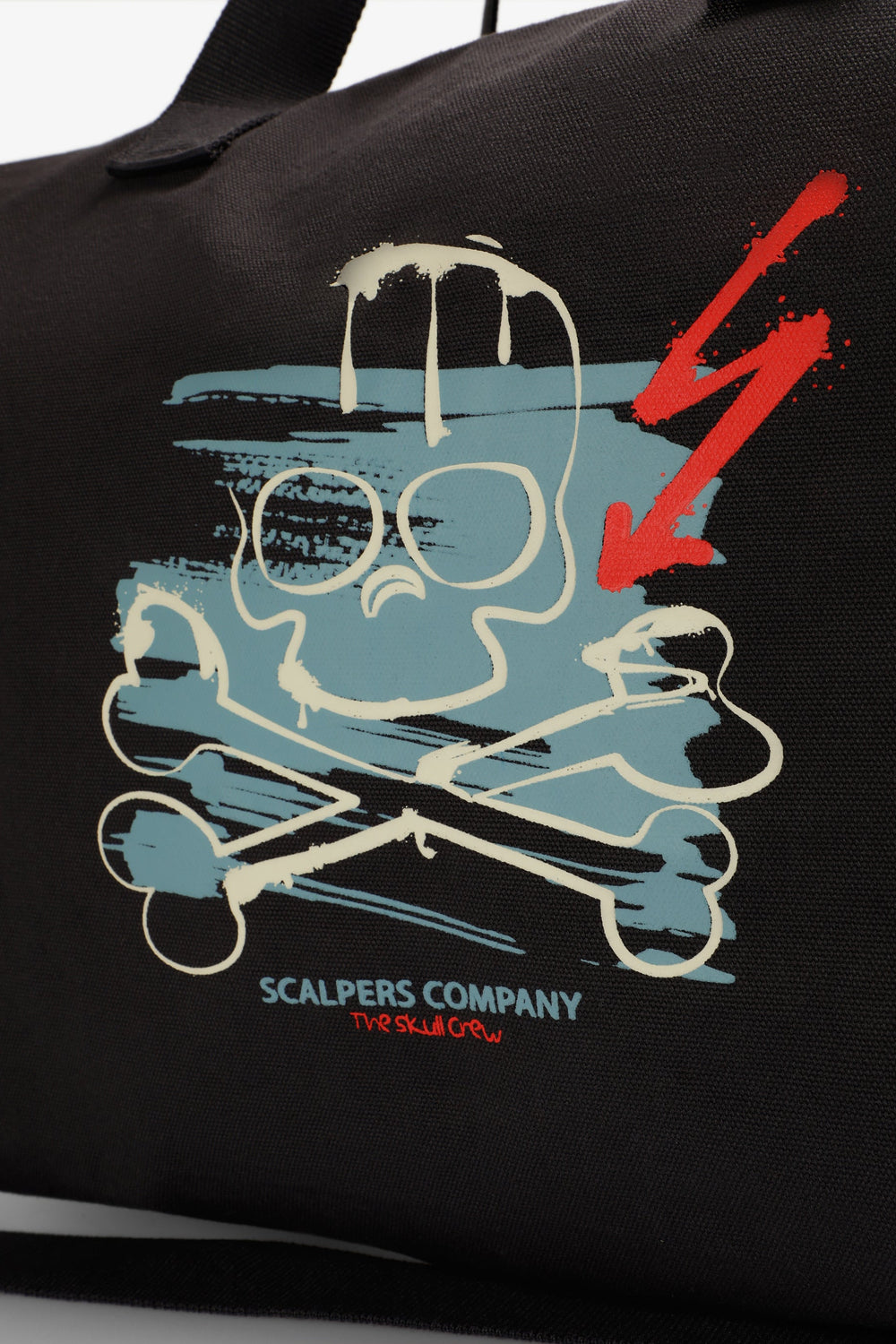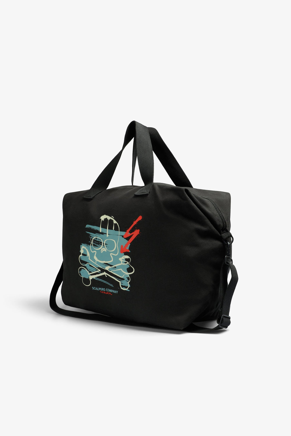 Bag made of 100% cotton. Short double handle. Long detachable strap. Contrast skull print and logo on front. Zip closure.