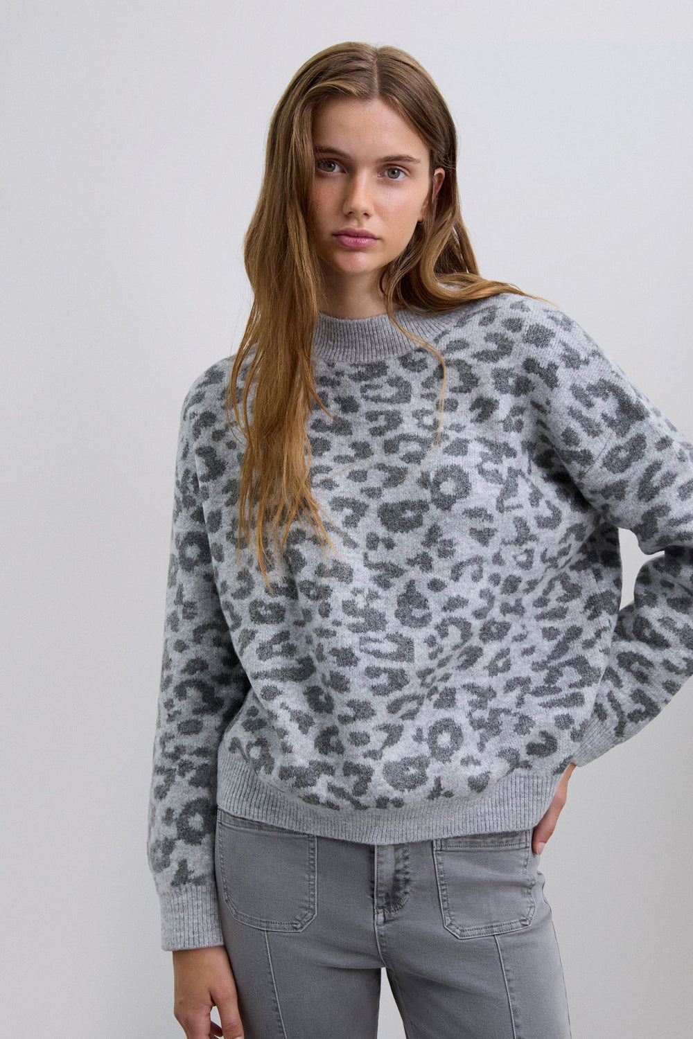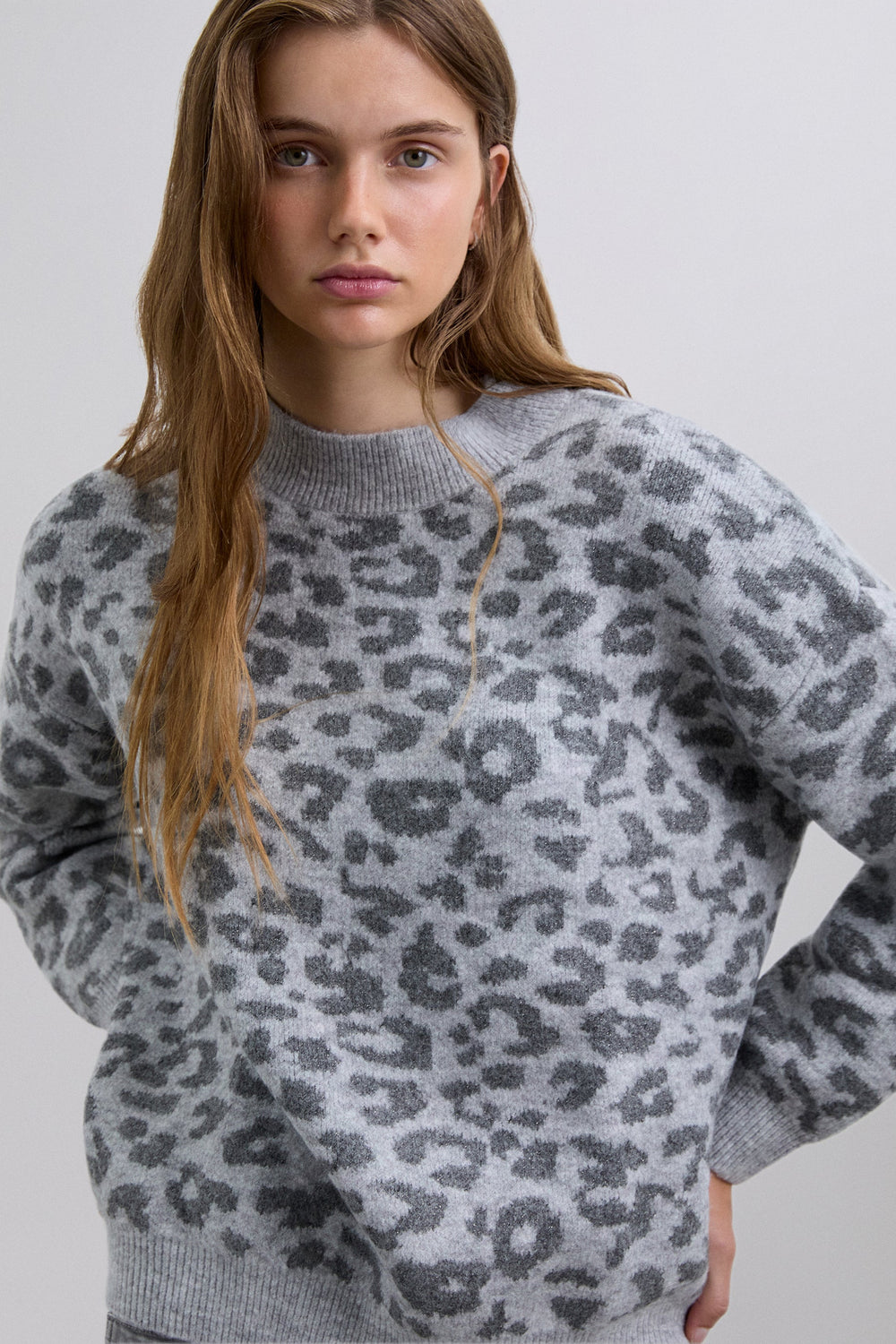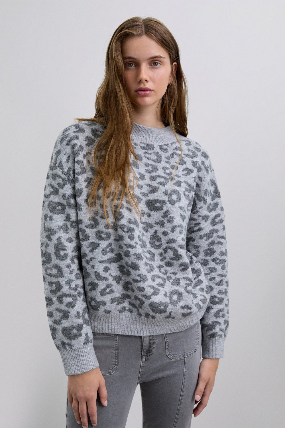 Knit sweater. Long sleeves. Round neck. Animal print. Contrast ribbed finish.