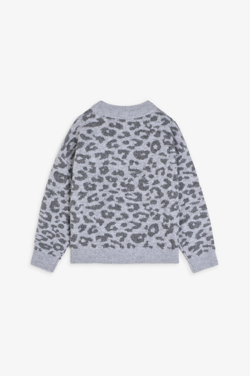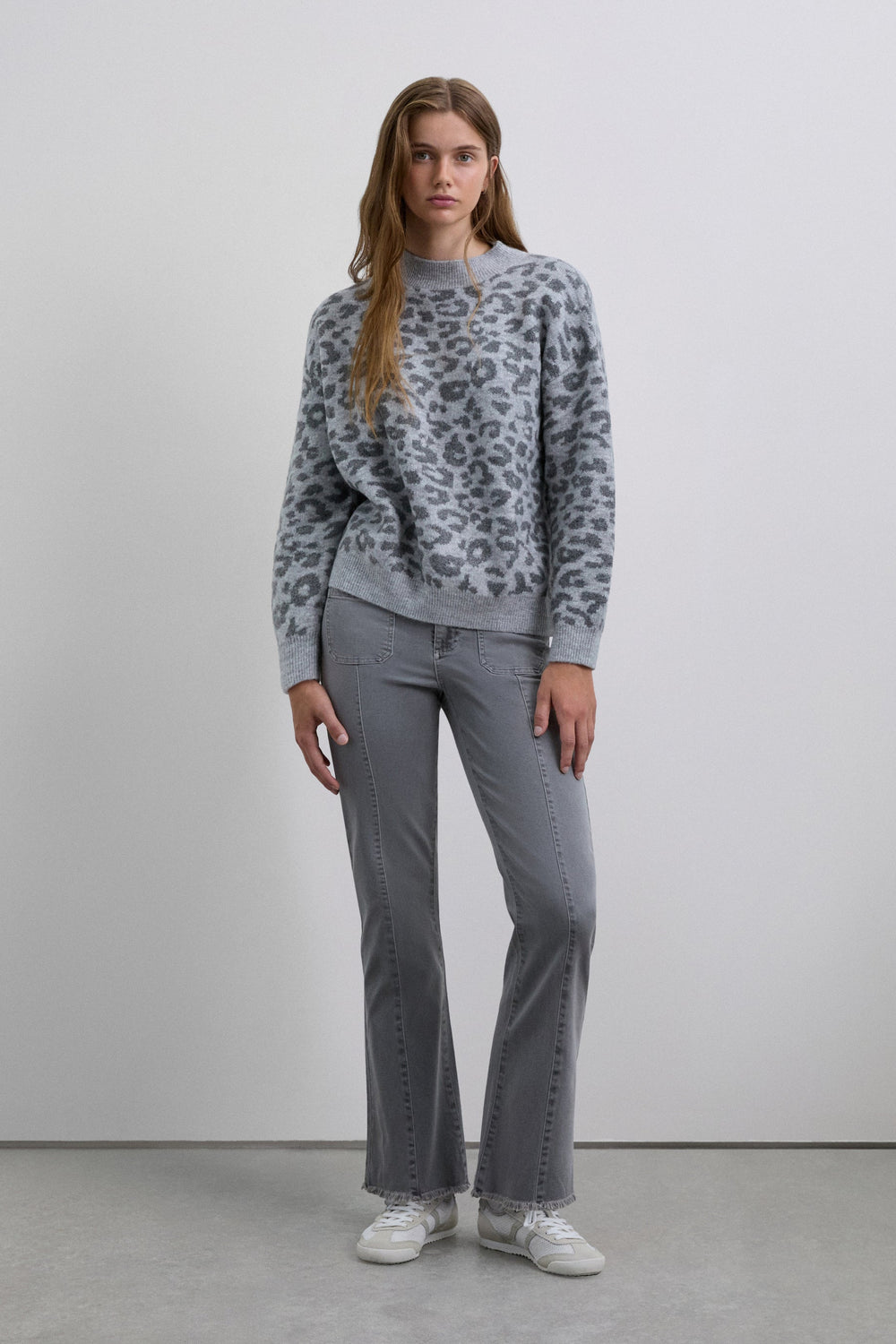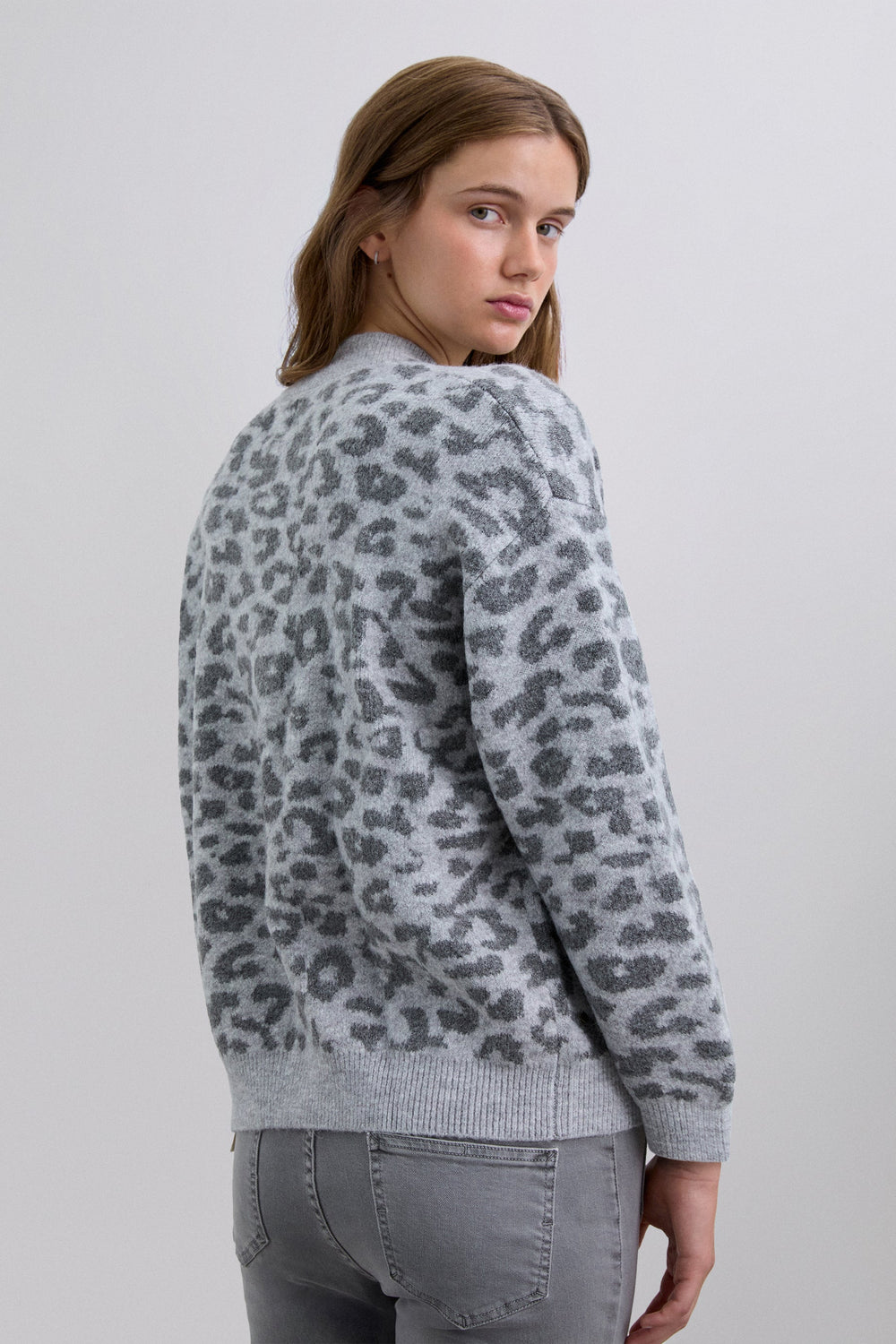 Knit sweater. Long sleeves. Round neck. Animal print. Contrast ribbed finish.