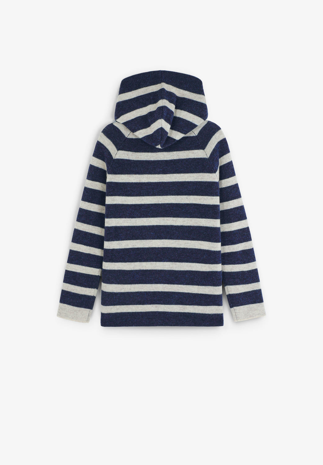 Hooded knit sweater made of a wool blend. Stripe print. Long sleeves. Contrast embroidered skull on the hem.