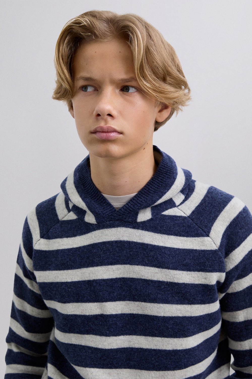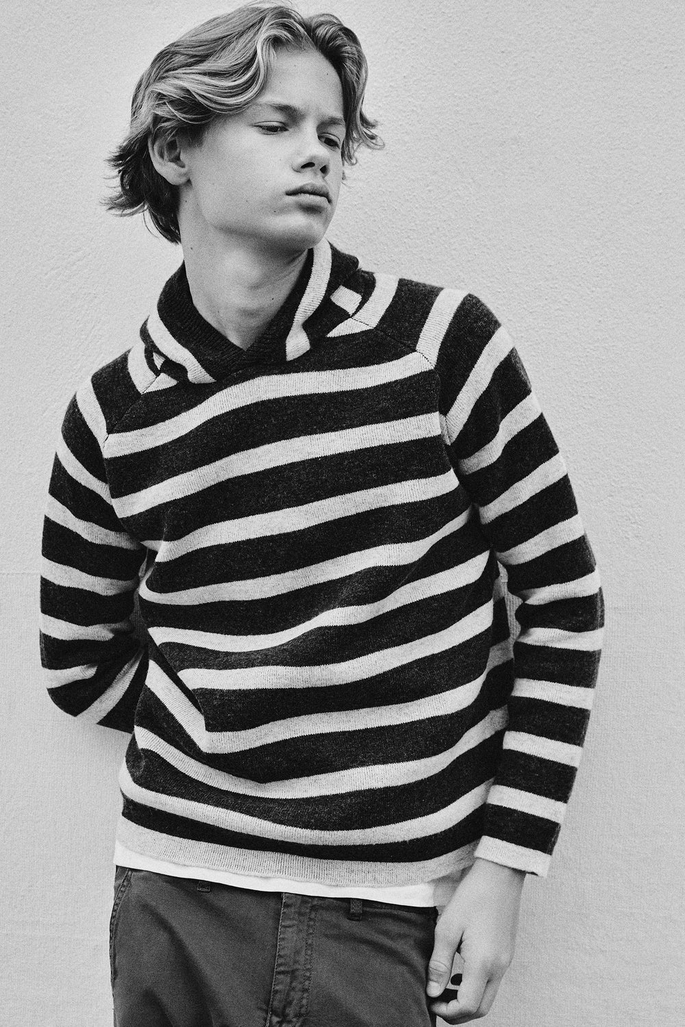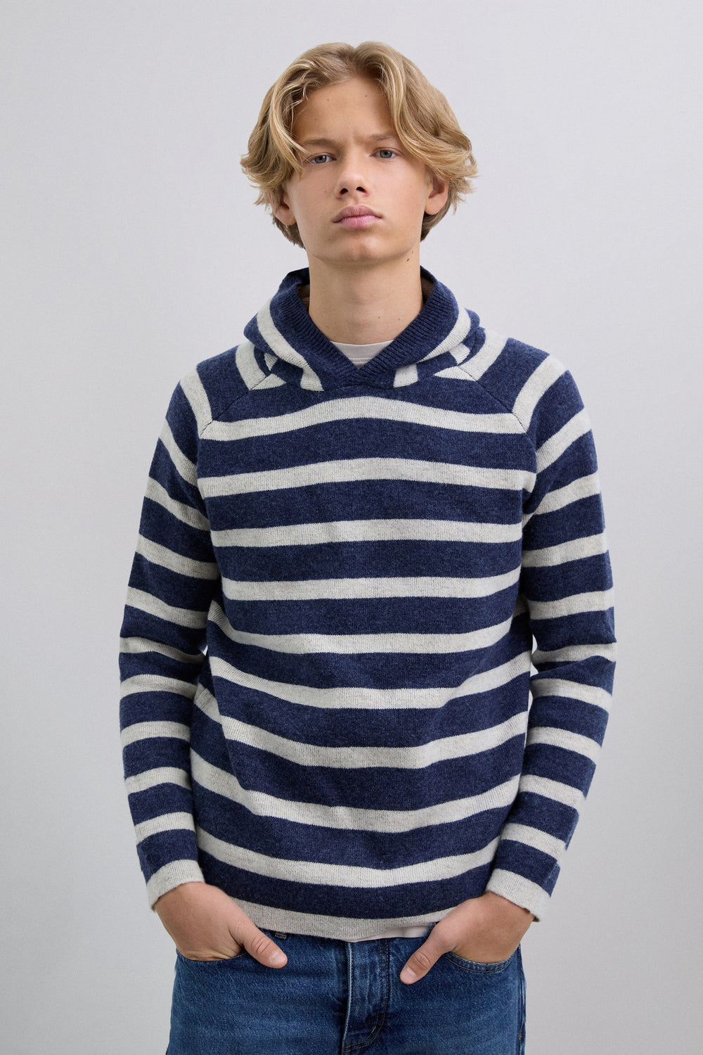 Knitted sweater with hood. Stripe print. Long sleeves. Contrast embroidered skull on the waistband.