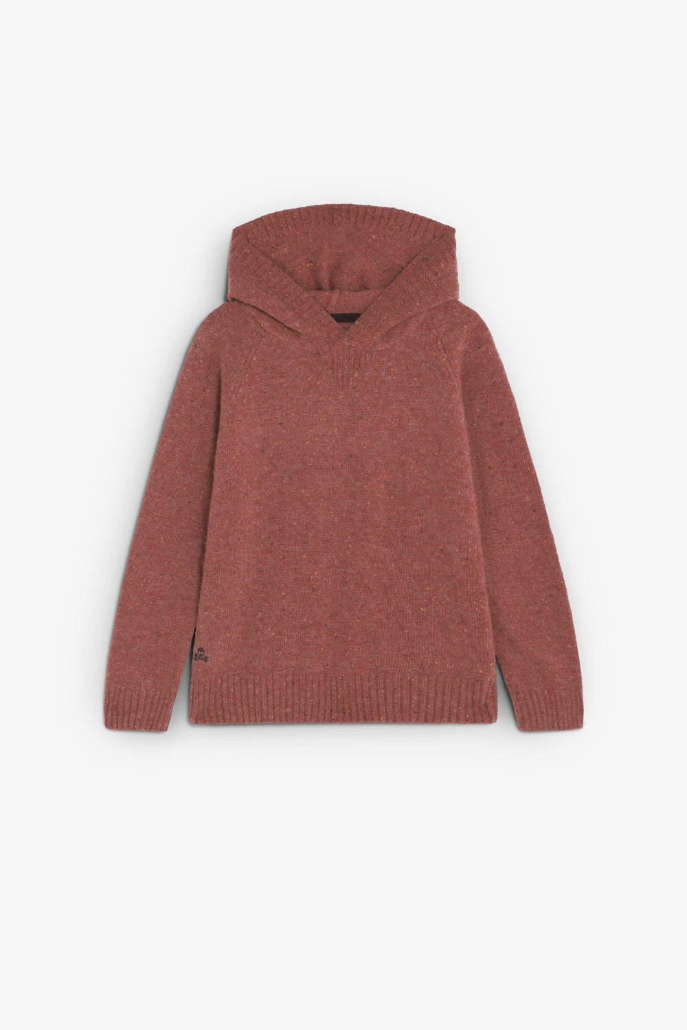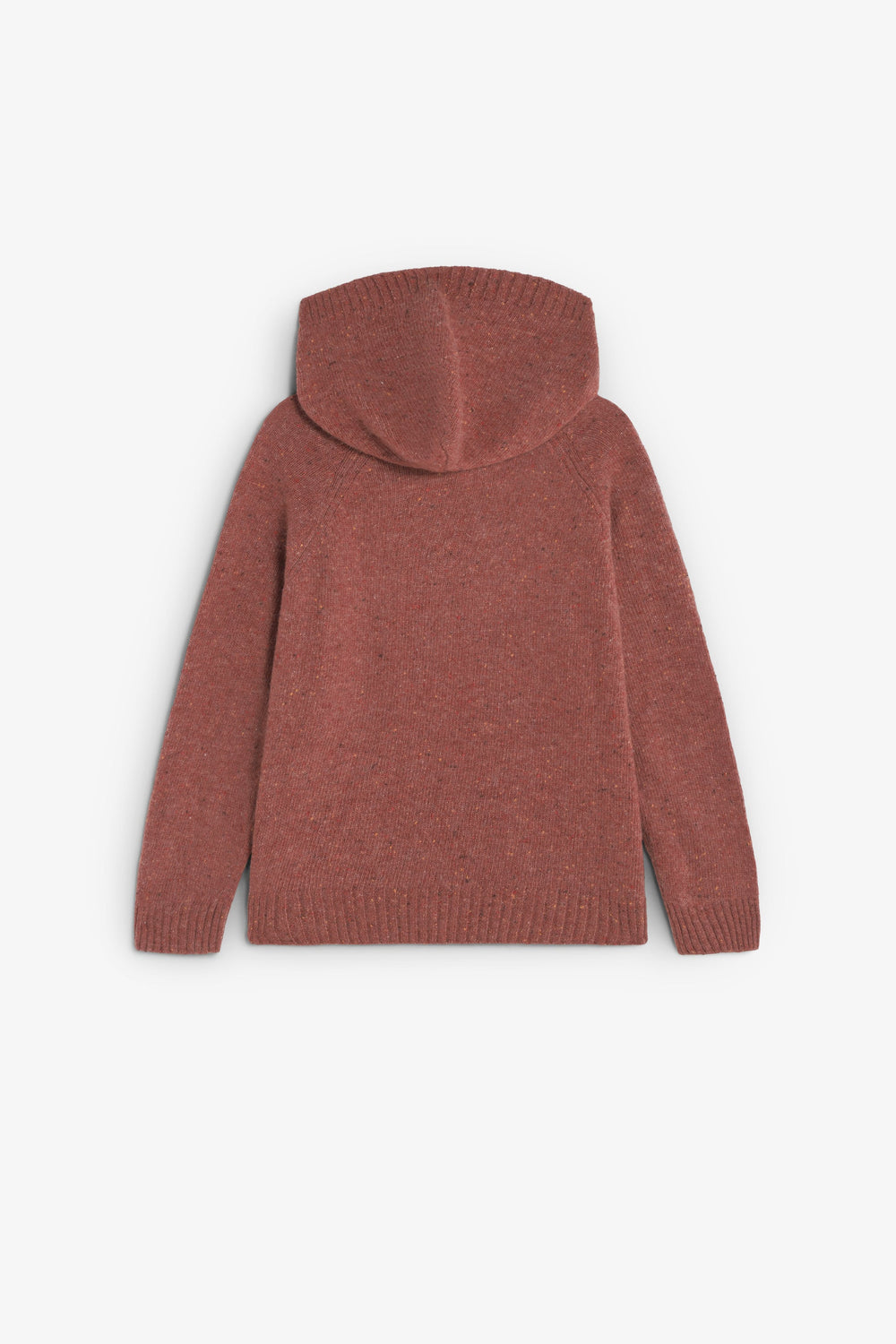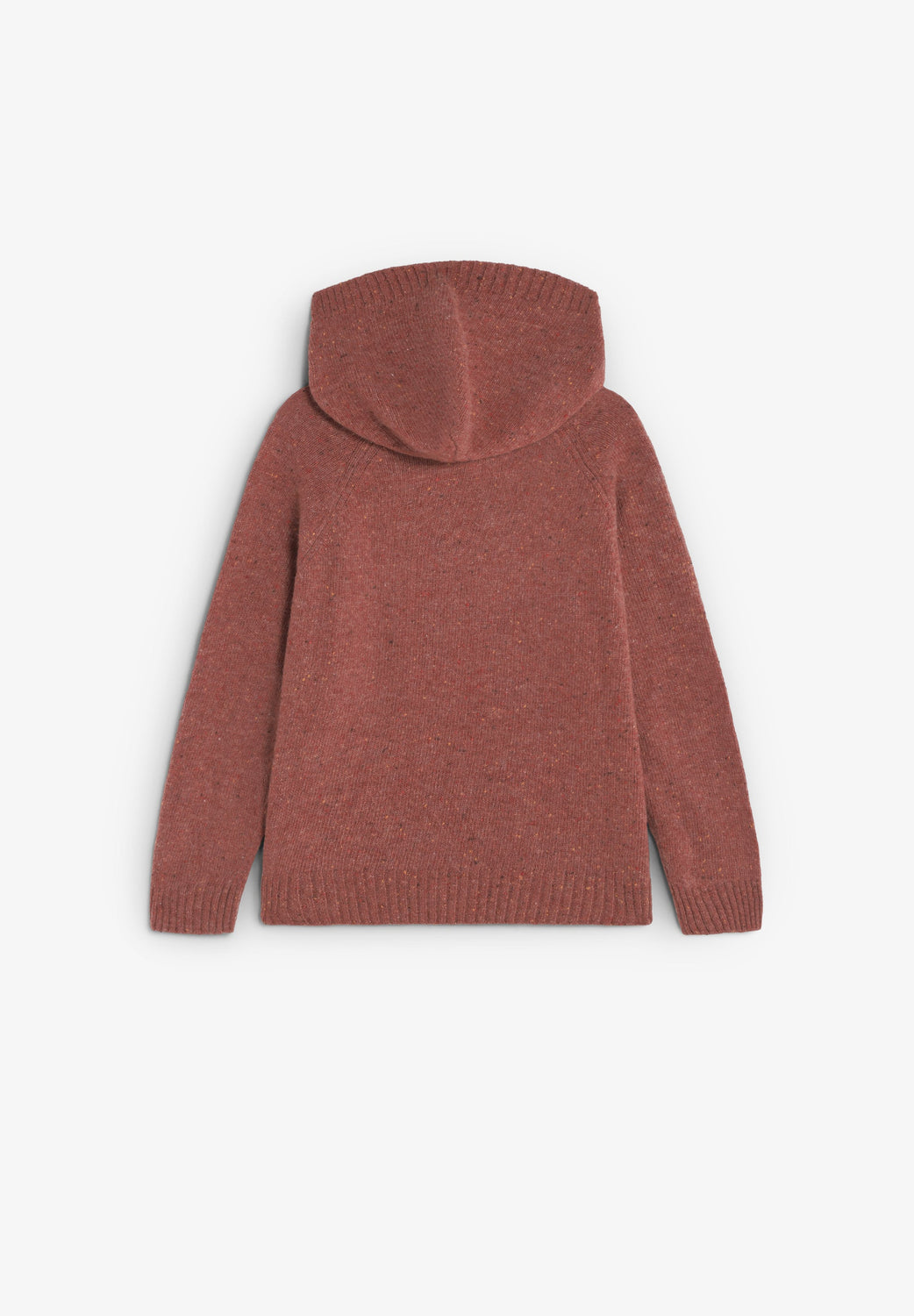 Tricot trui gemaakt van tweed wolmix met capuchon. Lange mouw. Geborduurde contrasterende doodskop op de zoom.