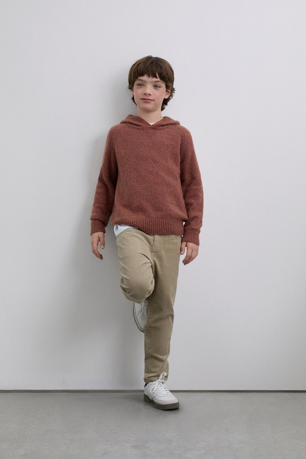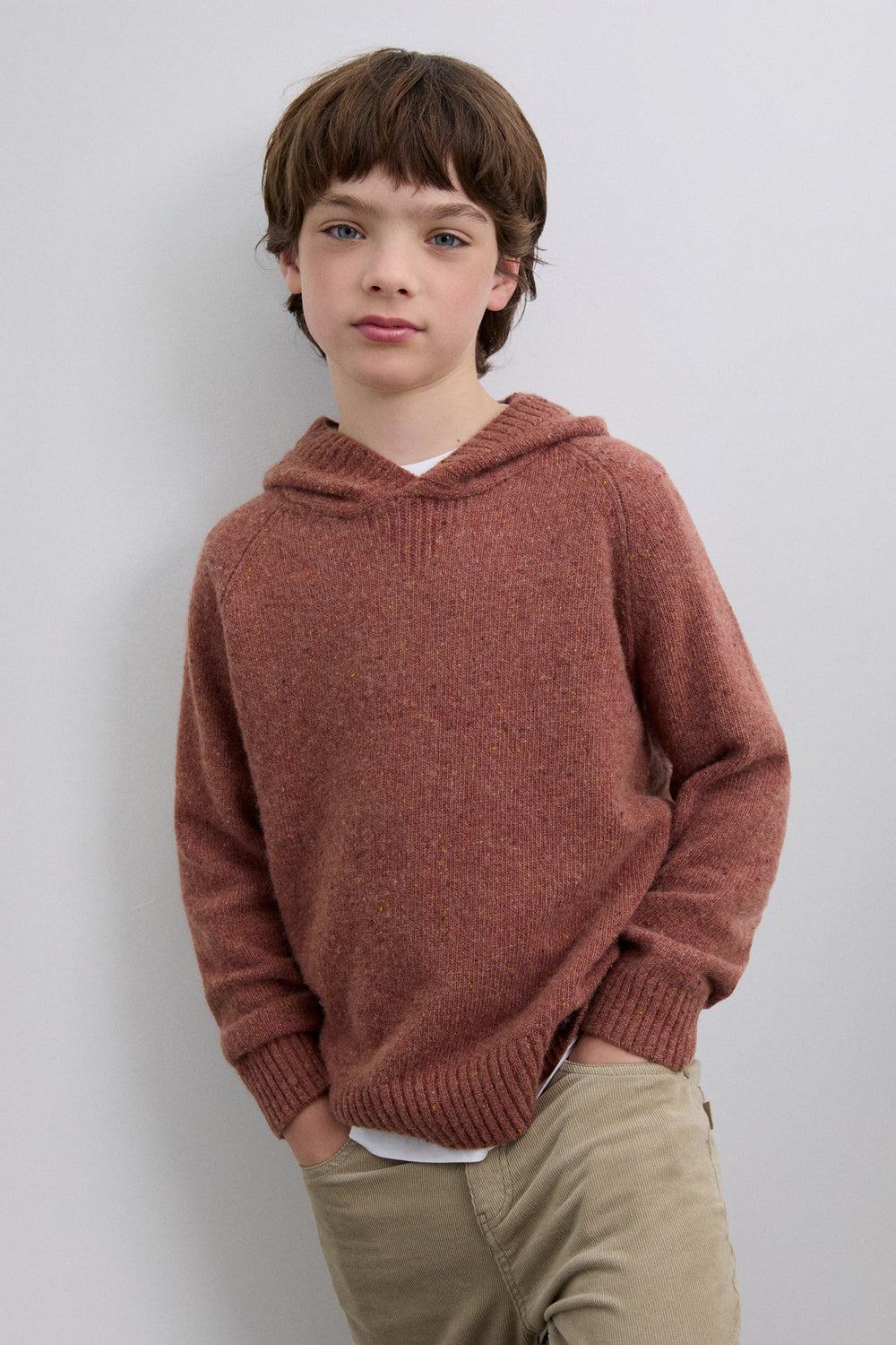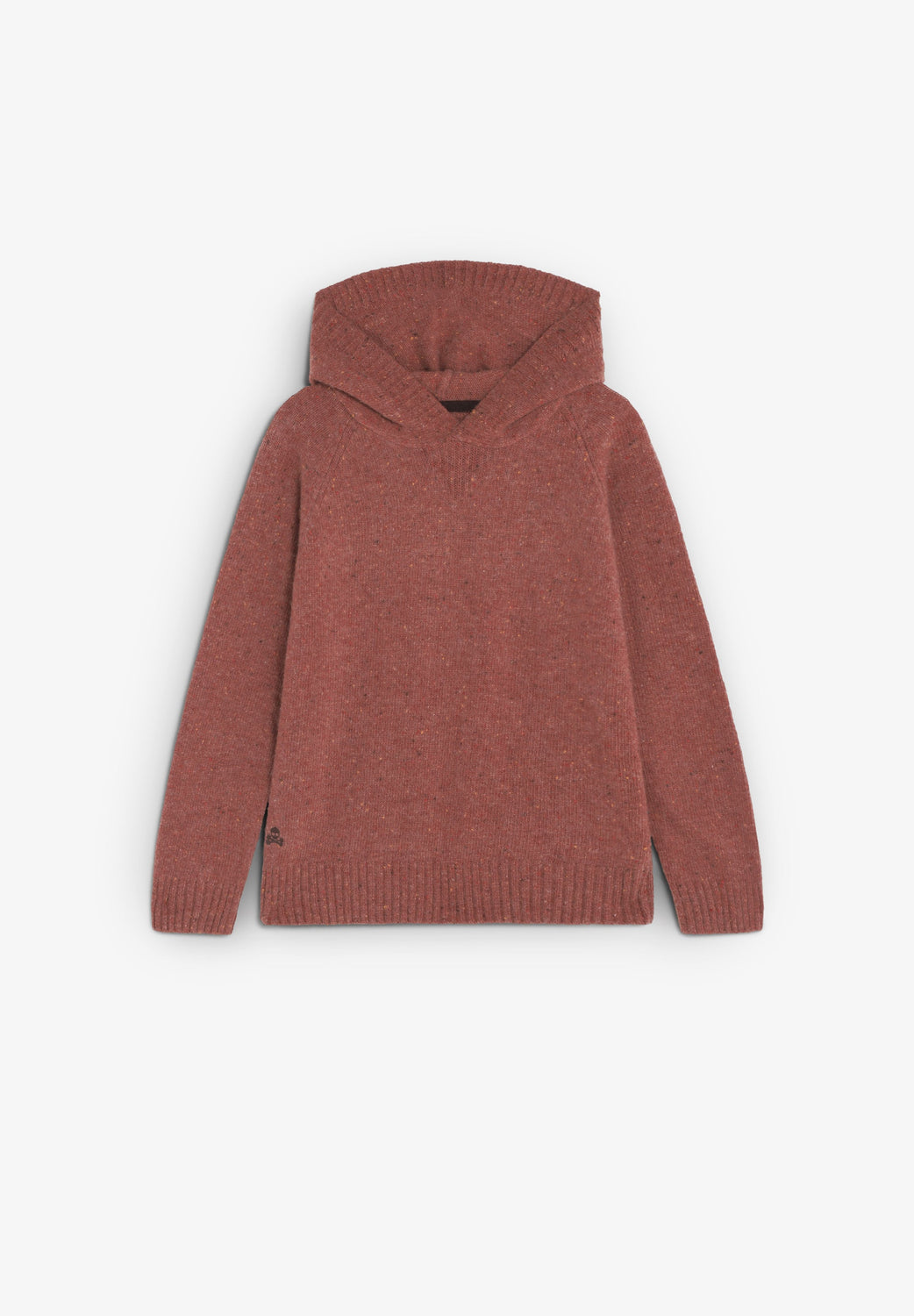 Tricot trui gemaakt van tweed wolmix met capuchon. Lange mouw. Geborduurde contrasterende doodskop op de zoom.