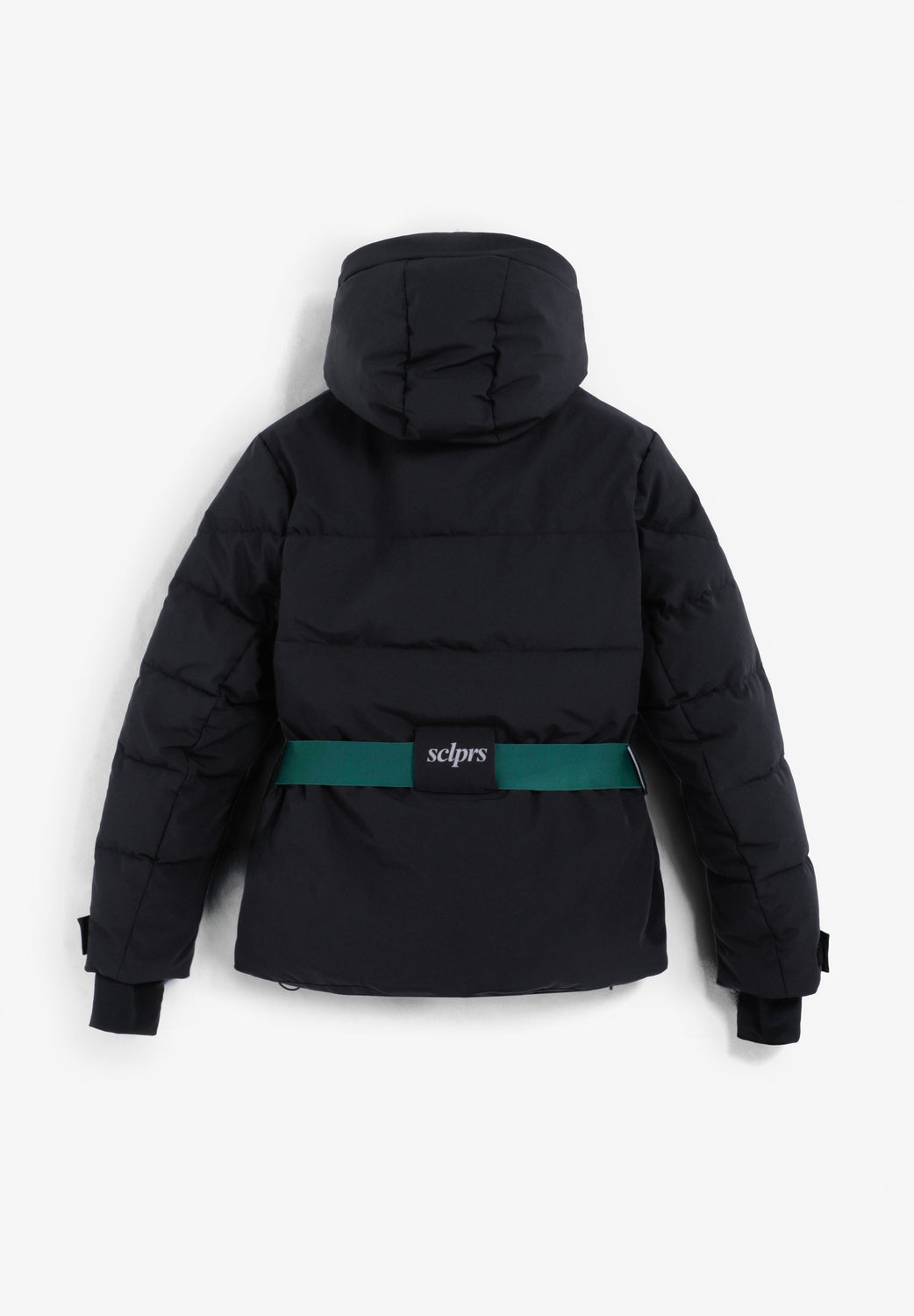 Slim fit, quilted ski jacket with high collar. All seams and zips are thermo-sealed. Includes belt with contrast green fanny pack for mobile phone and glove clips. Integrated hood. Logo detail on front, belt and hem.