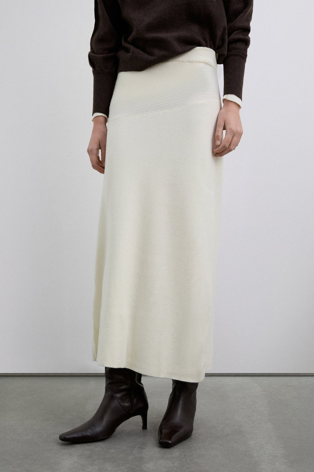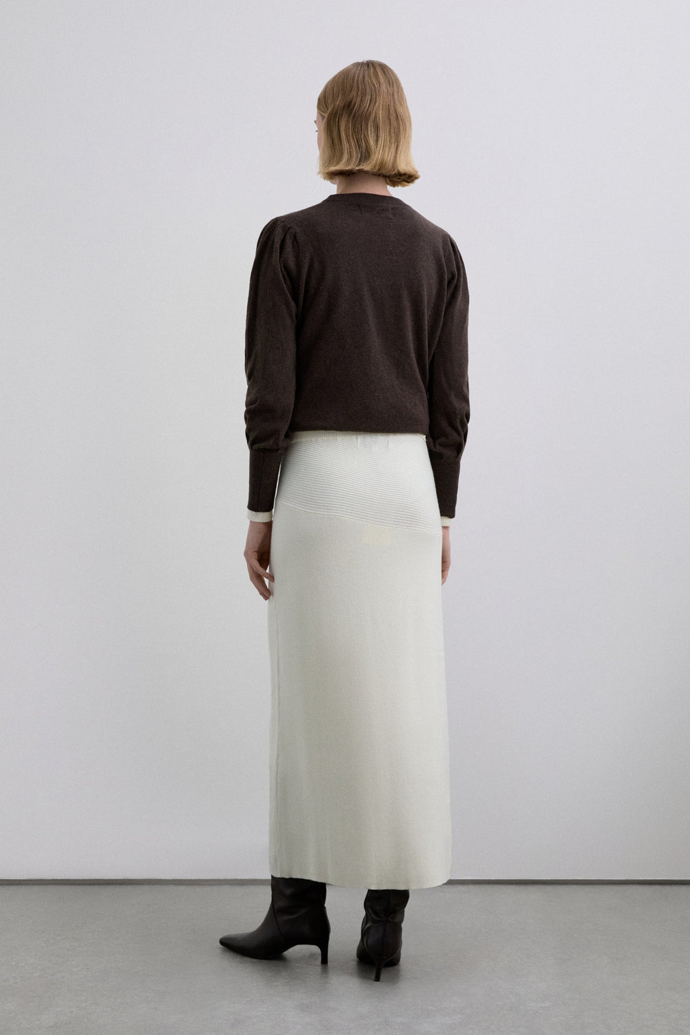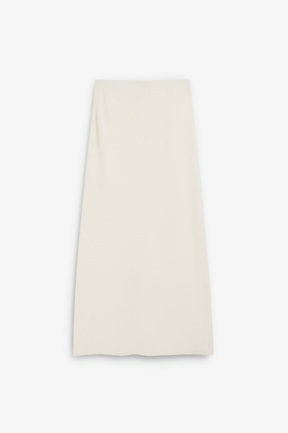 Geribde rok met verschillende stofrichtingen. De ribboorden zijn diagonaal aan de bovenkant en verticaal op de rest van de rok. Brede zoom. Elastiek in de taille.