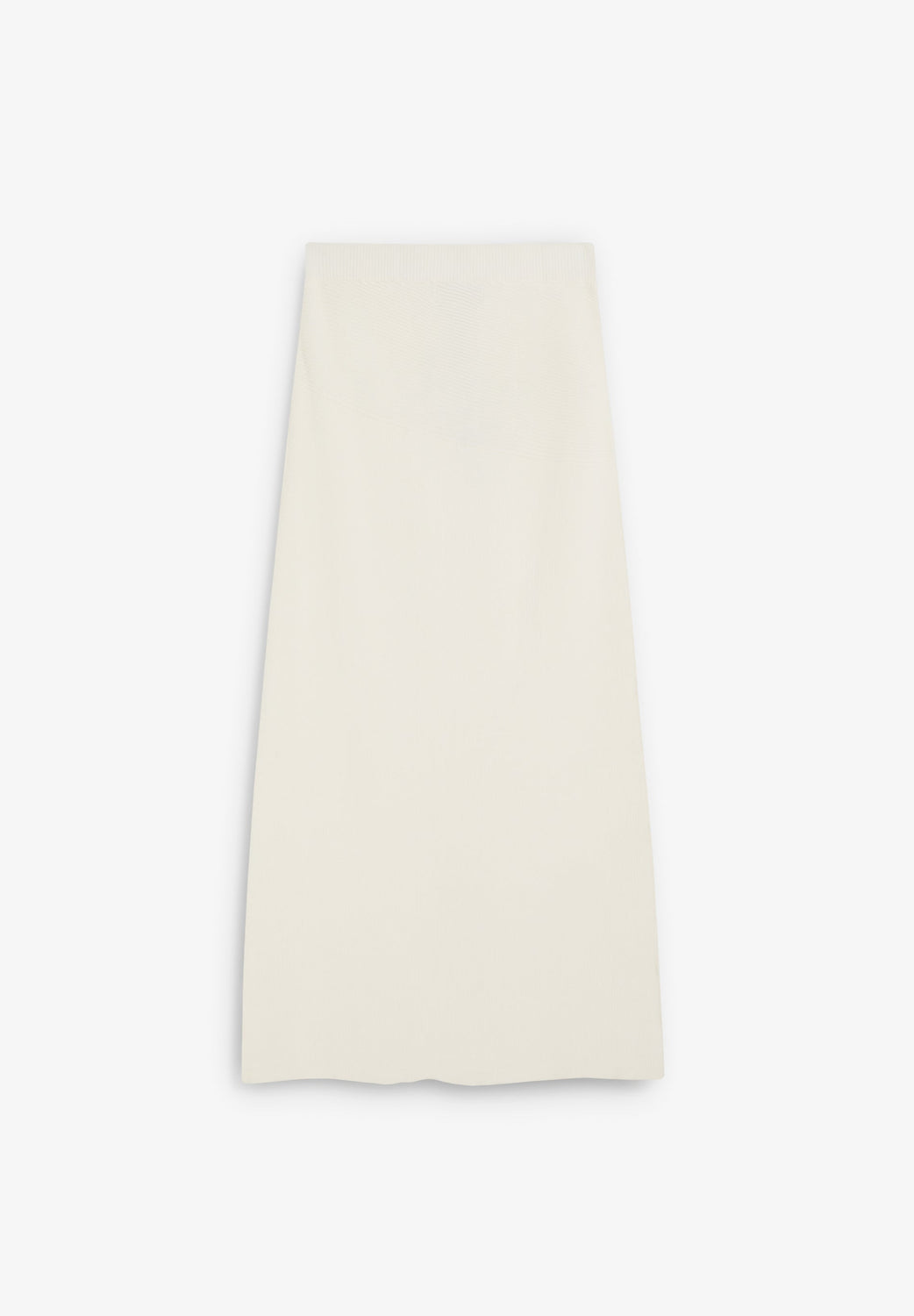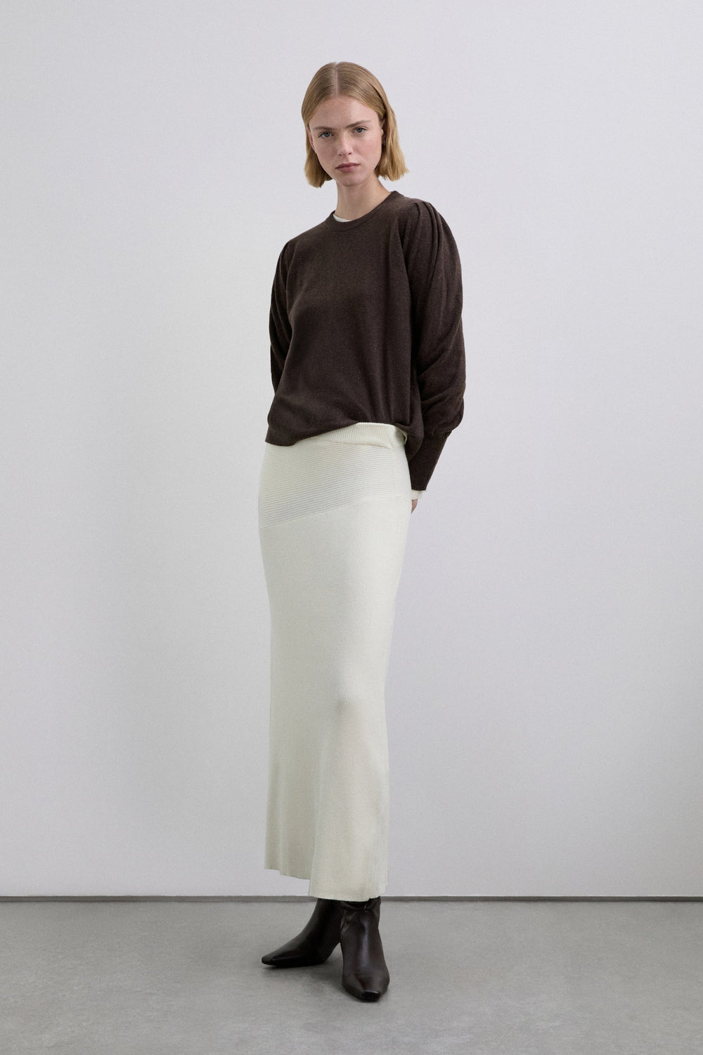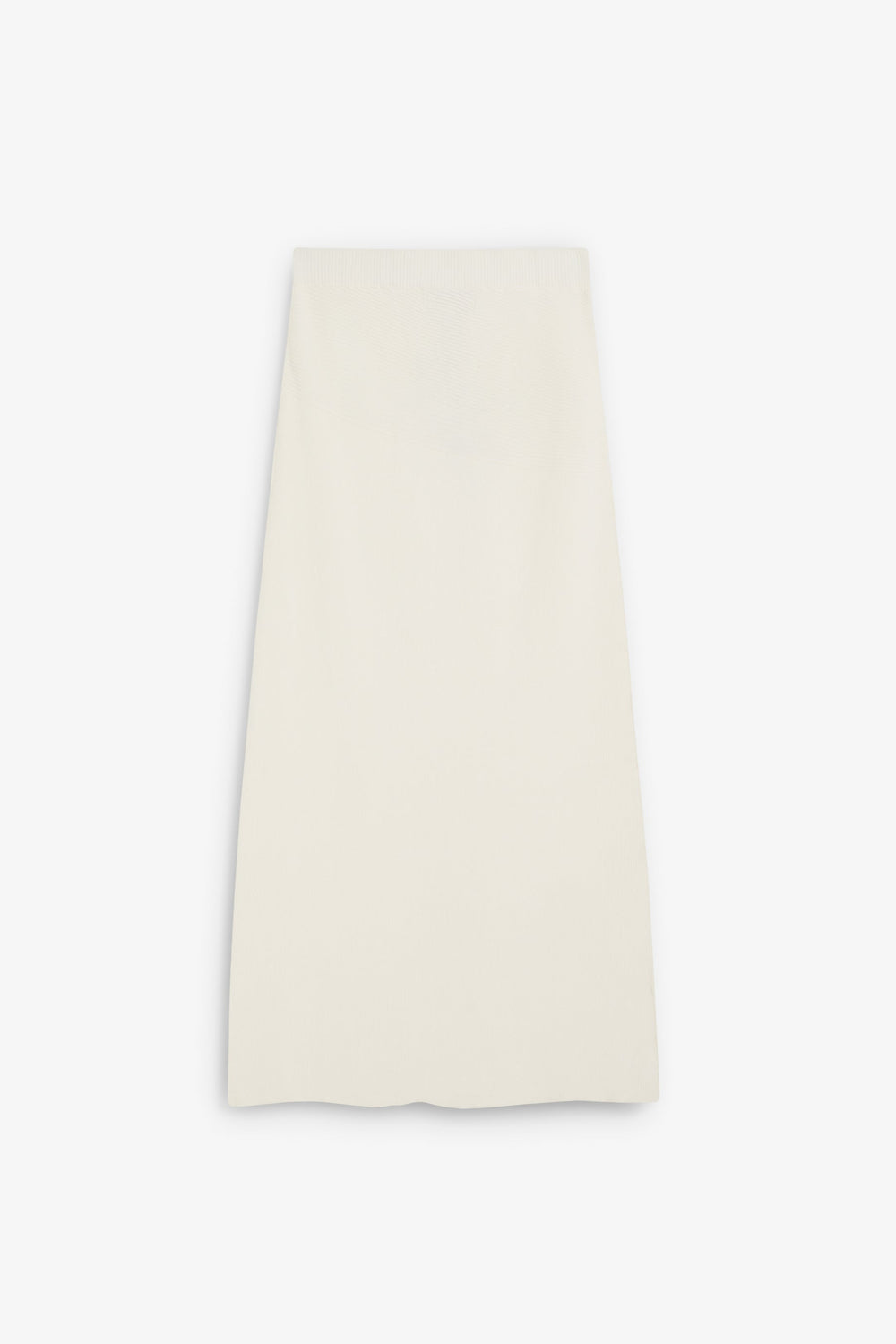 Geribde rok met verschillende stofrichtingen. De ribboorden zijn diagonaal aan de bovenkant en verticaal op de rest van de rok. Brede zoom. Elastiek in de taille.
