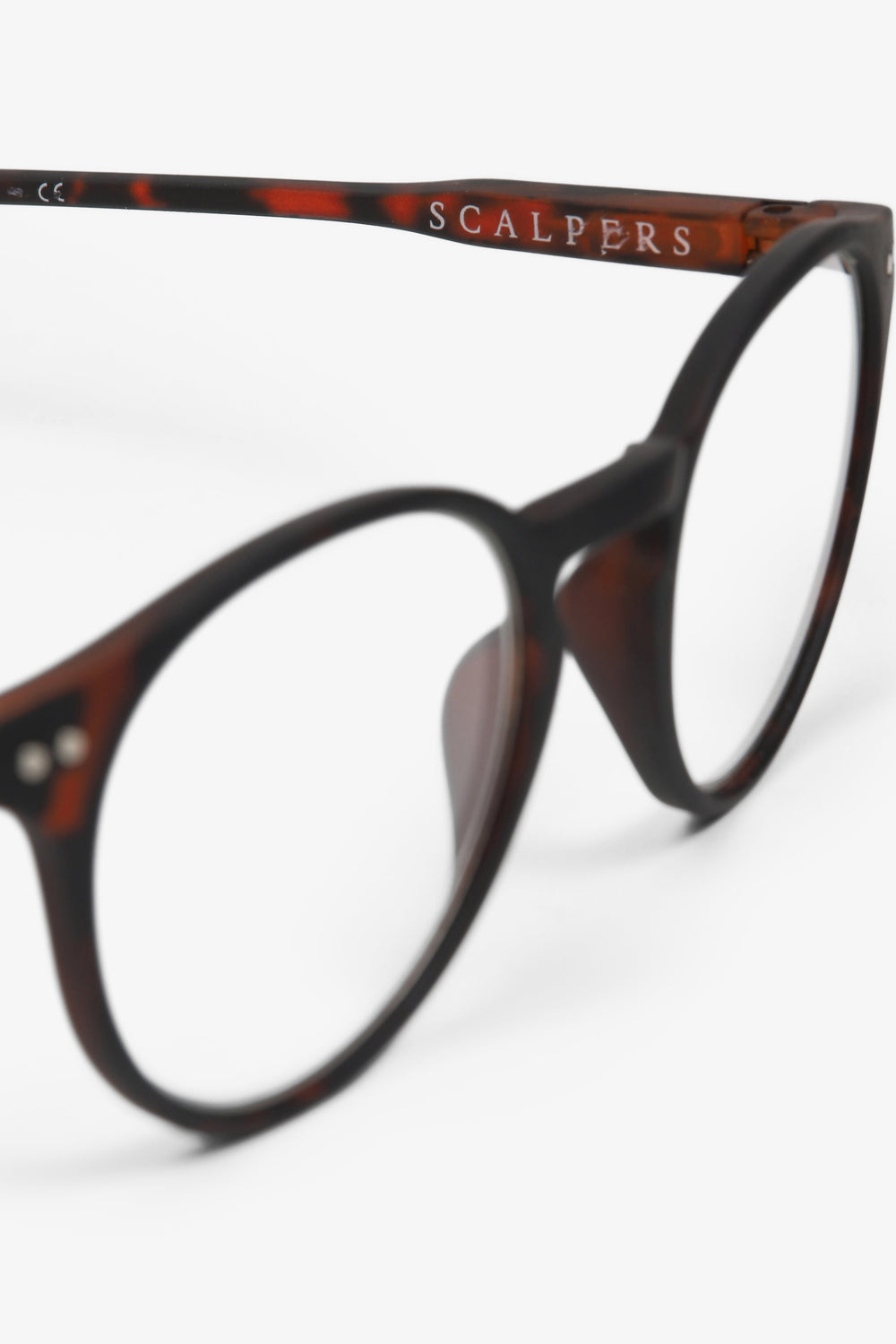 Round resin sunglasses made of polycarbonate. Prescription lenses and skull detail on the side.
