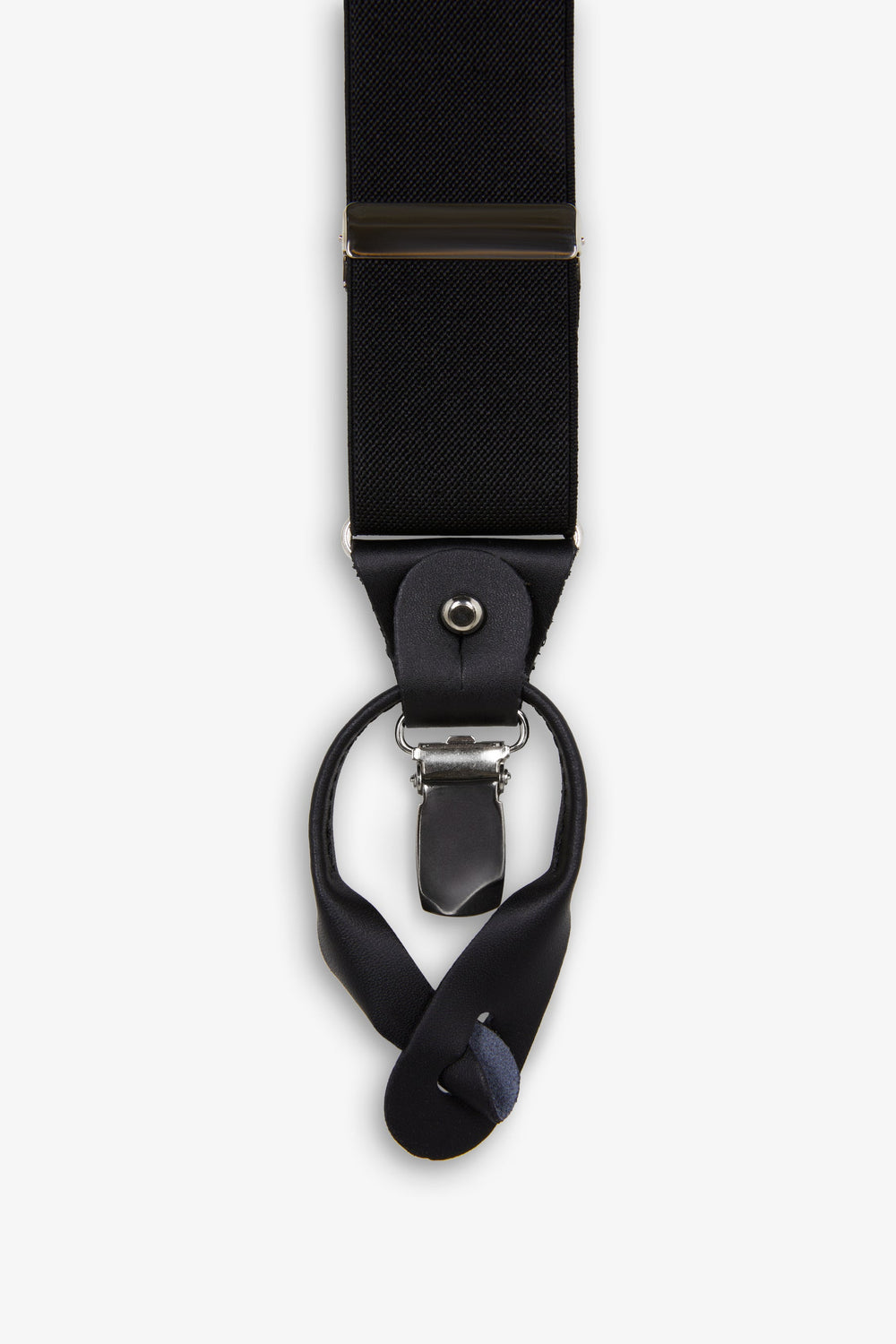 Monochrome elasticated braces. Metal details. Leather trim.
