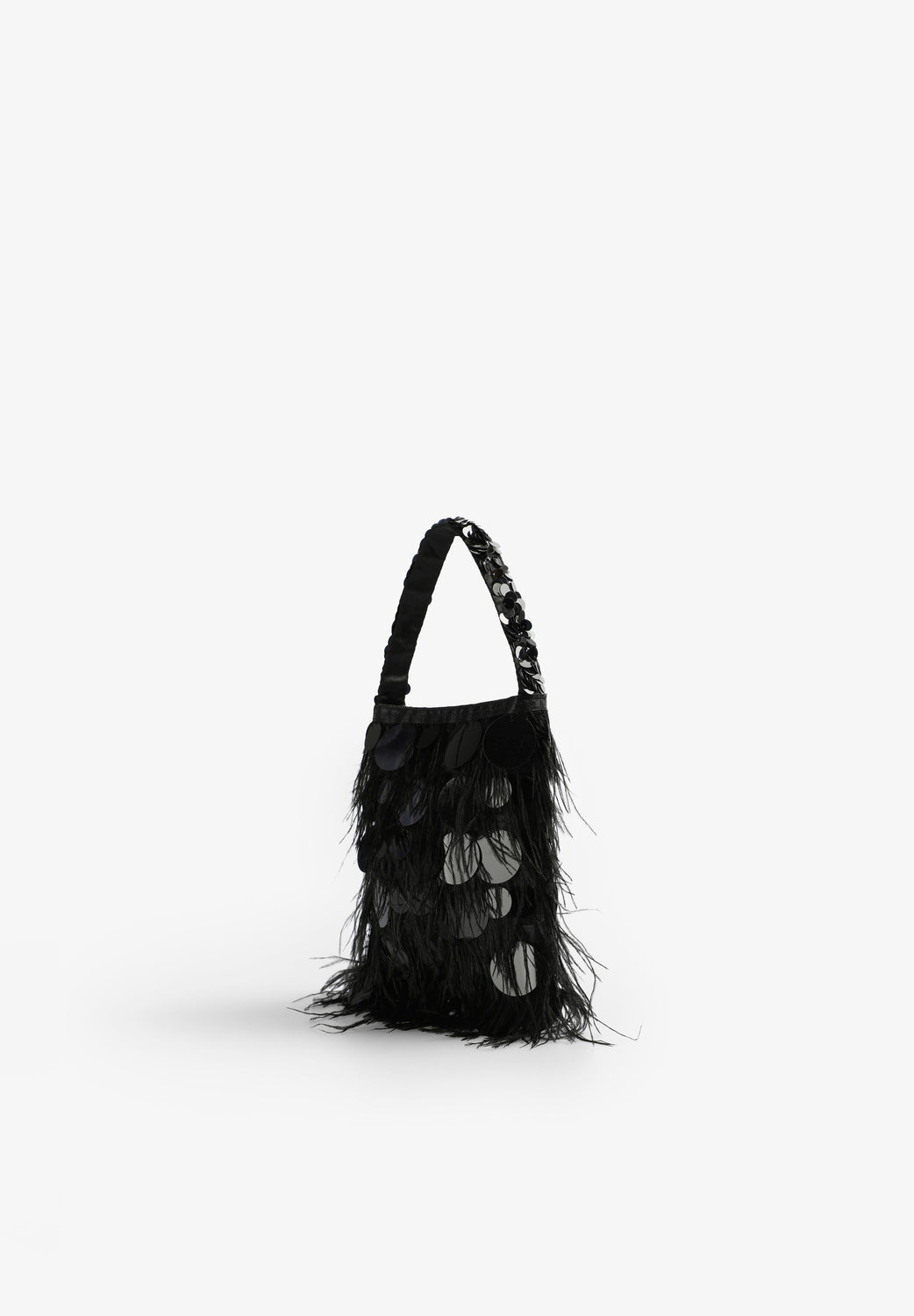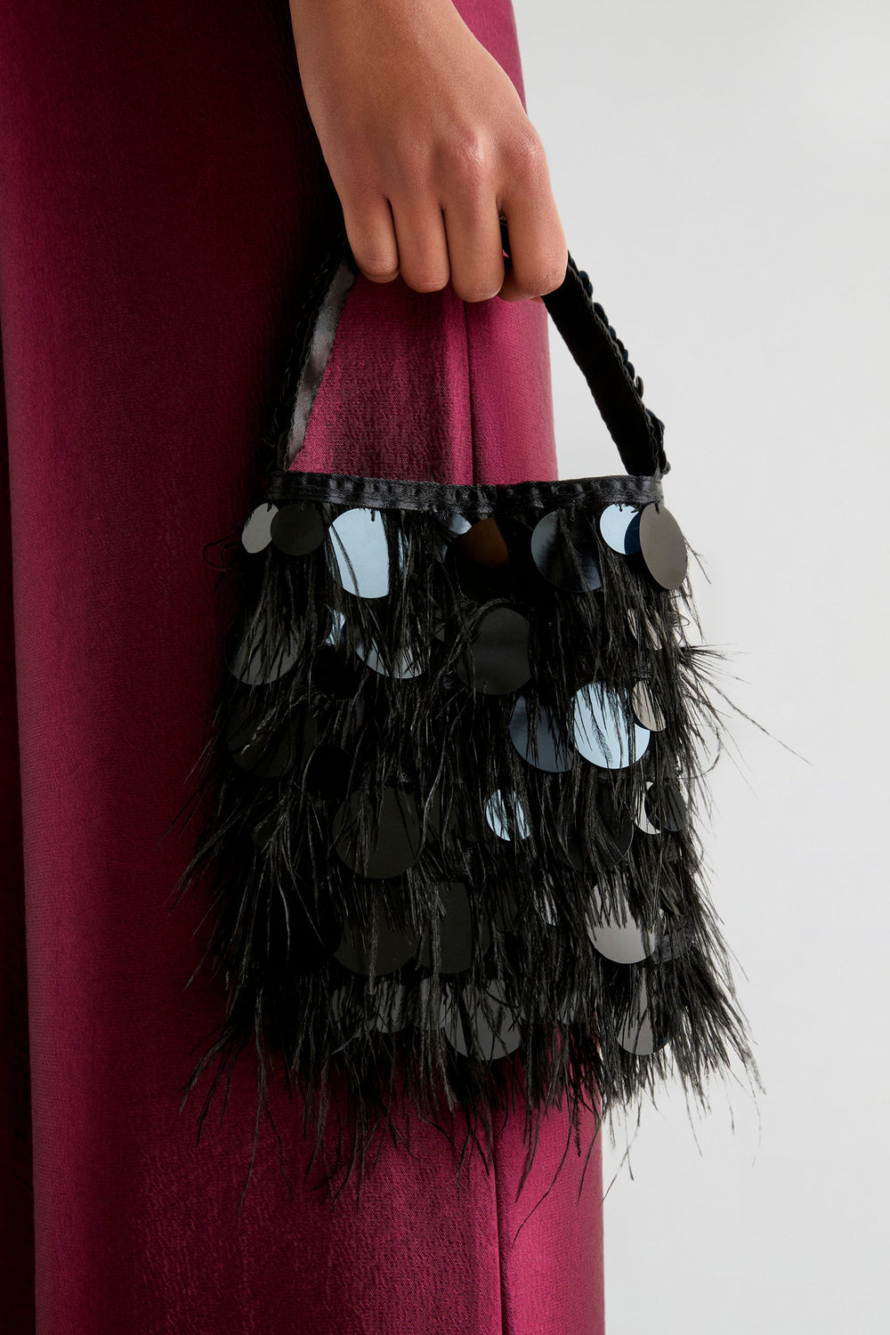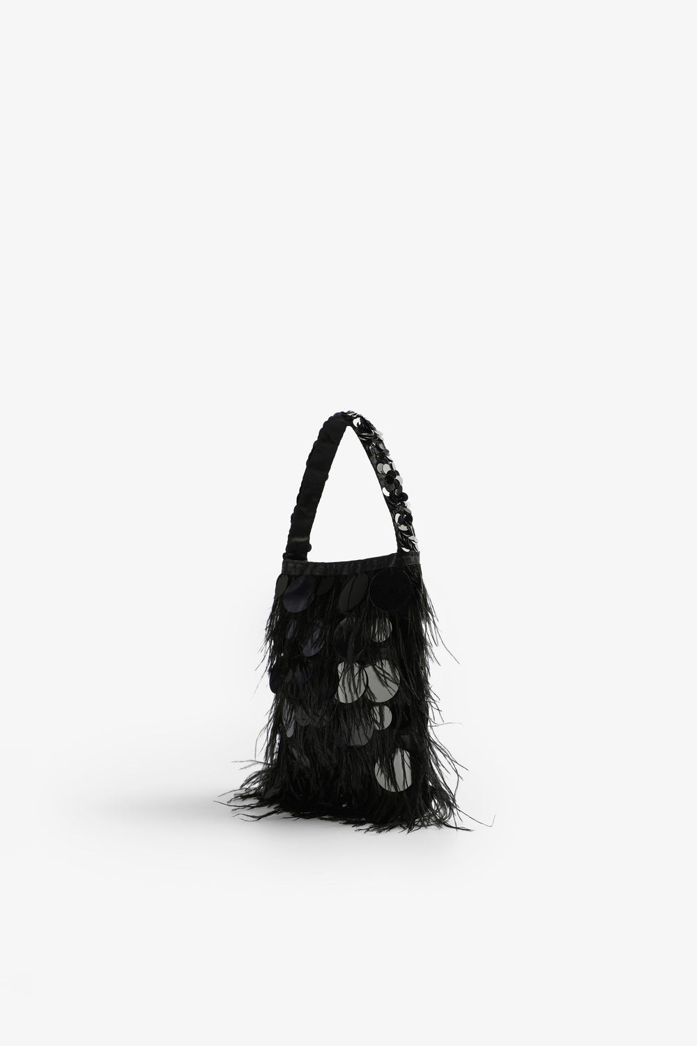 Handbag made with feathers and sequins. Lining with snap button closure.