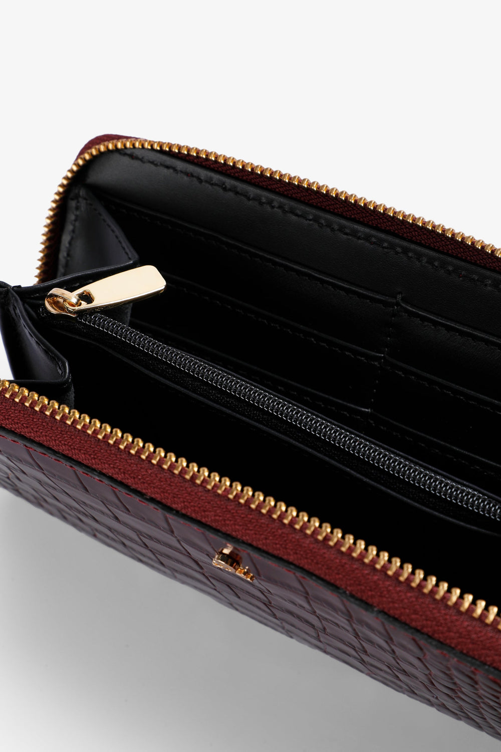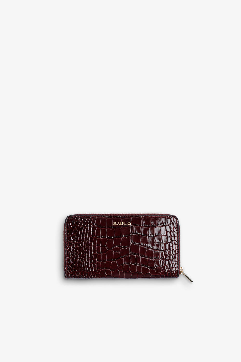 Wallet made of 100% leather with an animal print texture. Interior with space for cards and a zipped pocket. Zip fastening and a metallic logo on the front.