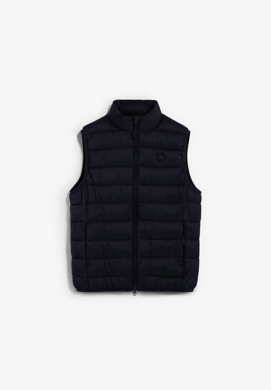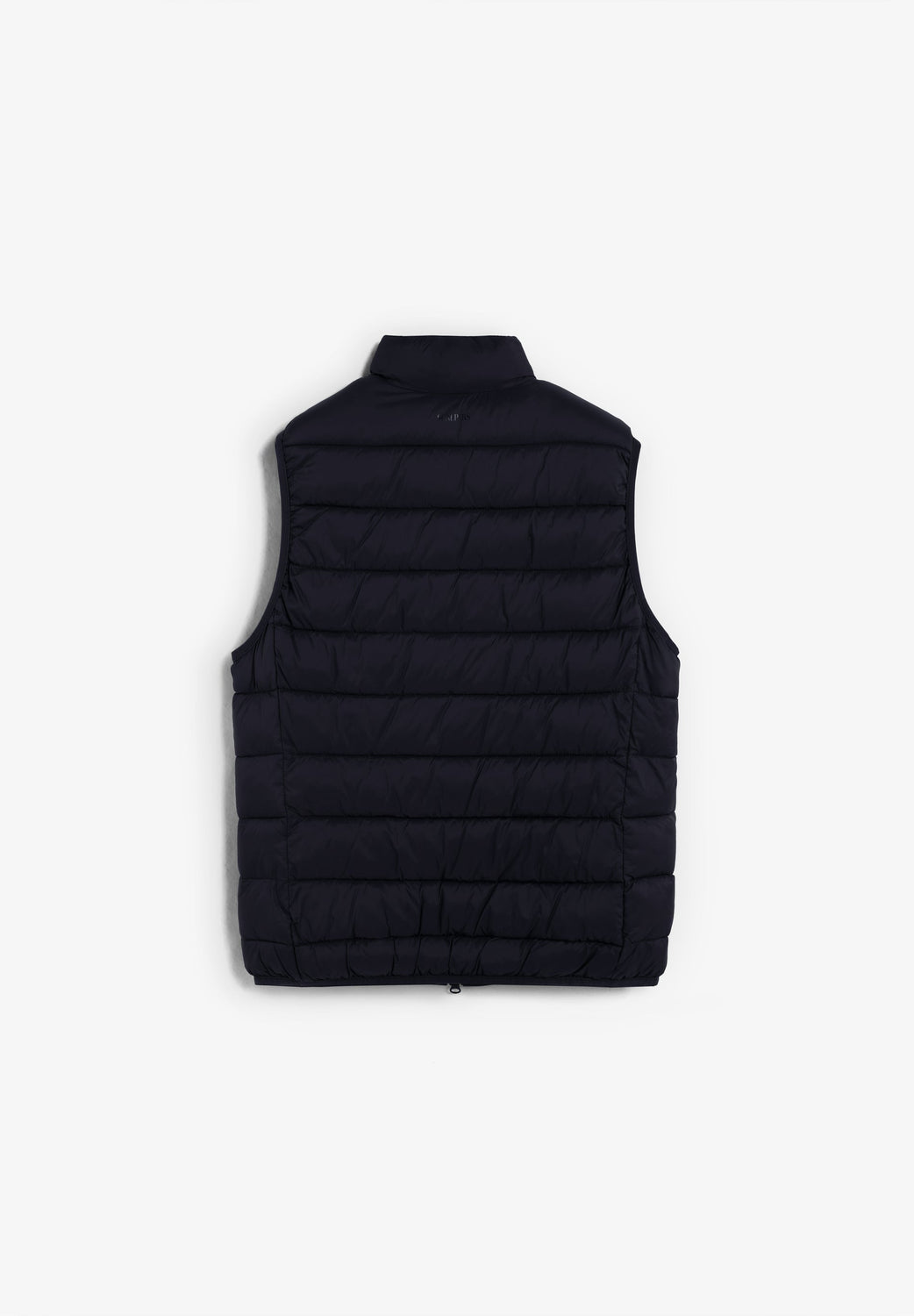 Puffer vest. Water repellent. Inner lining made of technical fabric. Concealed side pockets with fleece lining. Engraved double slider zip fastening. Rubberised patch with matching logo on chest.