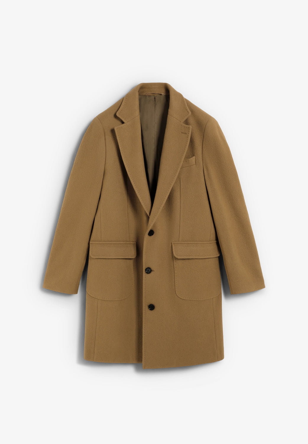 Long coat made of a high quality virgin wool blend. Lapel collar. Long sleeves with buttoned cuffs. Front pockets with double flap. Front button fastening. Back vent.